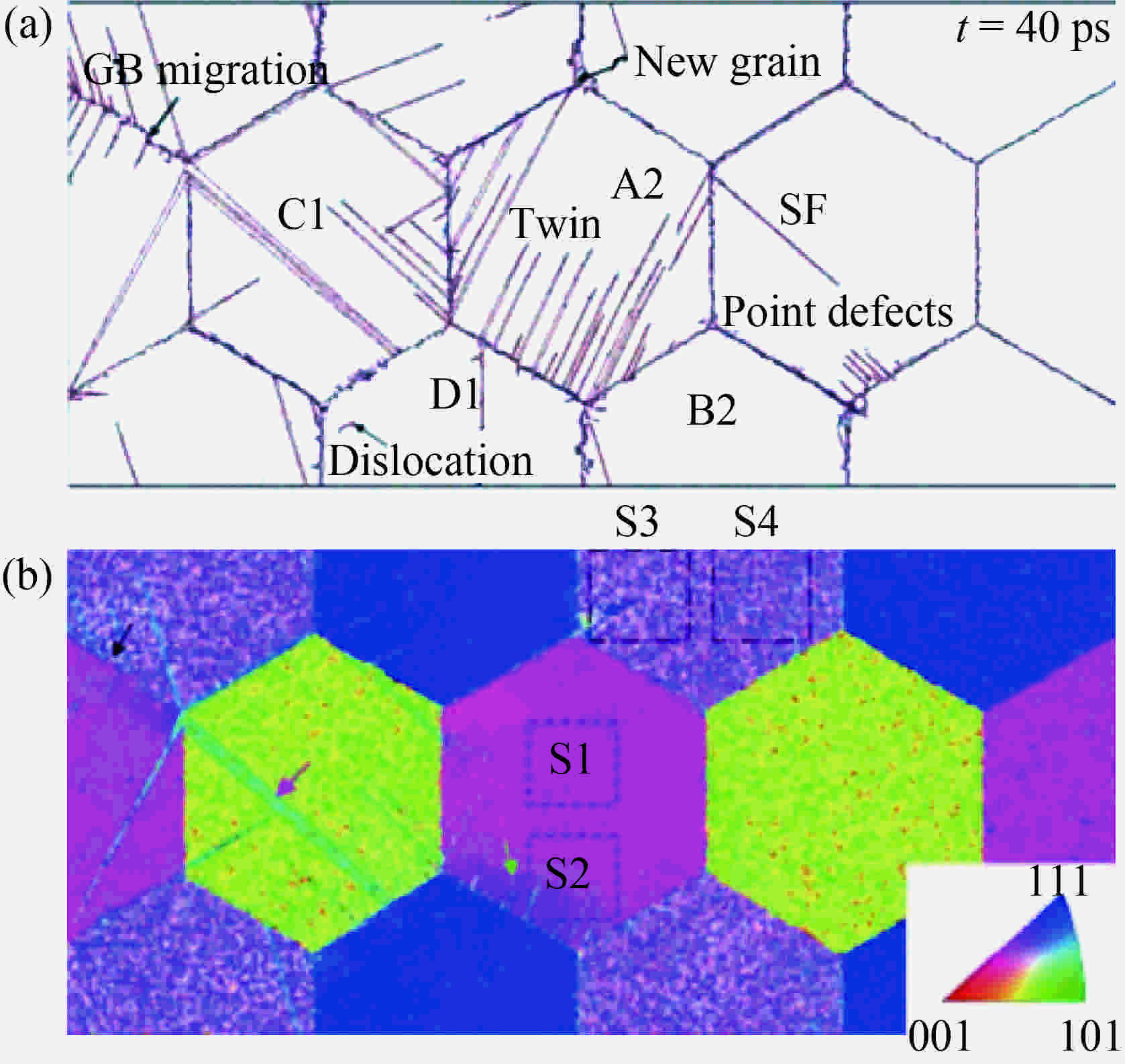 图 4 纳米柱状晶在冲击压缩下的缺陷结构图(a)及对应的取向分析图(b)[25]