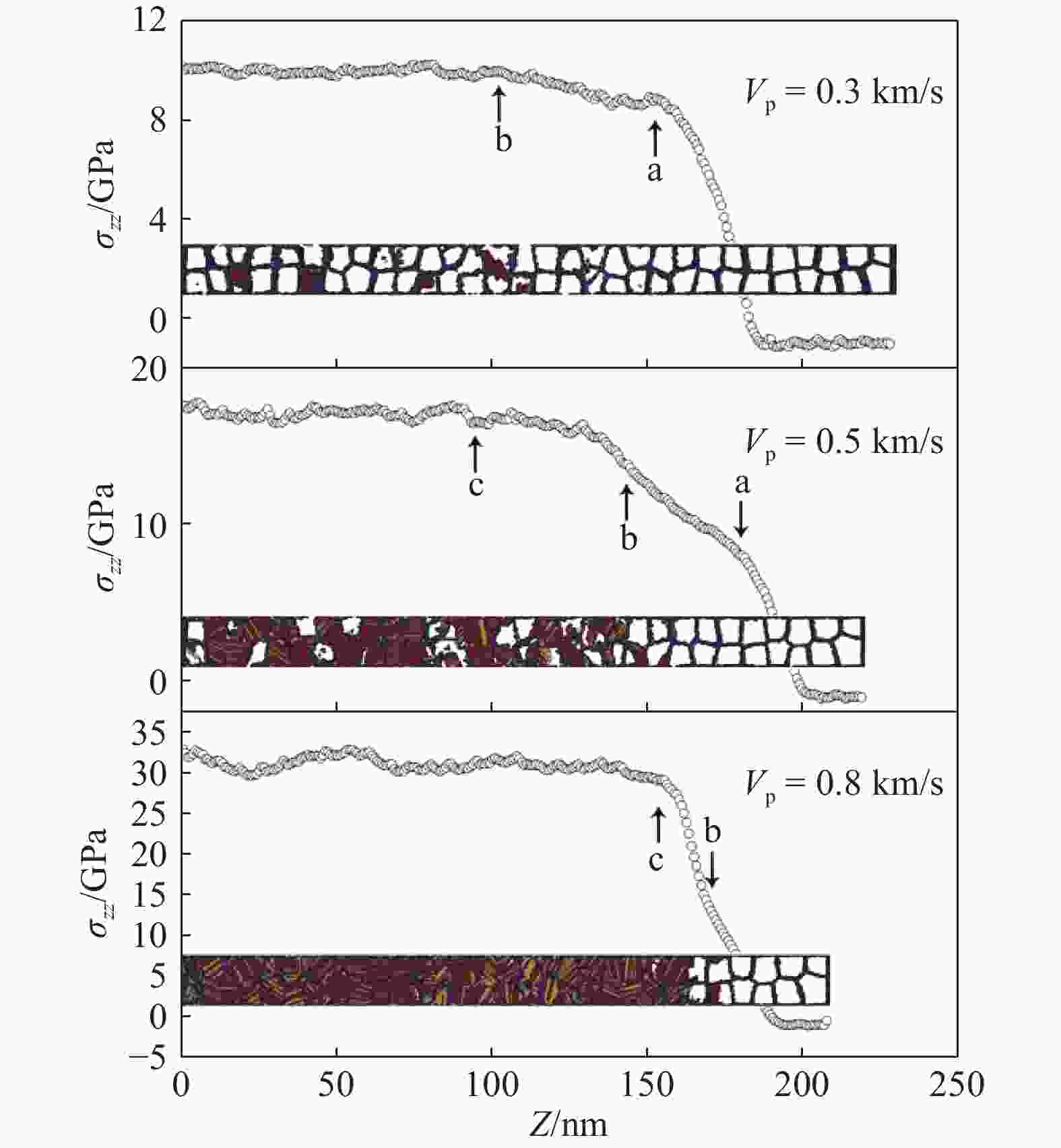 图 5 不同速度下应力剖面和原子结构图(bcc结构原子未显示,红色、黄色和黑蓝色分别代表hcp相、fcc相和晶格缺陷;弹性波区、塑性波区、混合相区和Hugoniot状态区的分界处用字母a、b、c表示)[8]