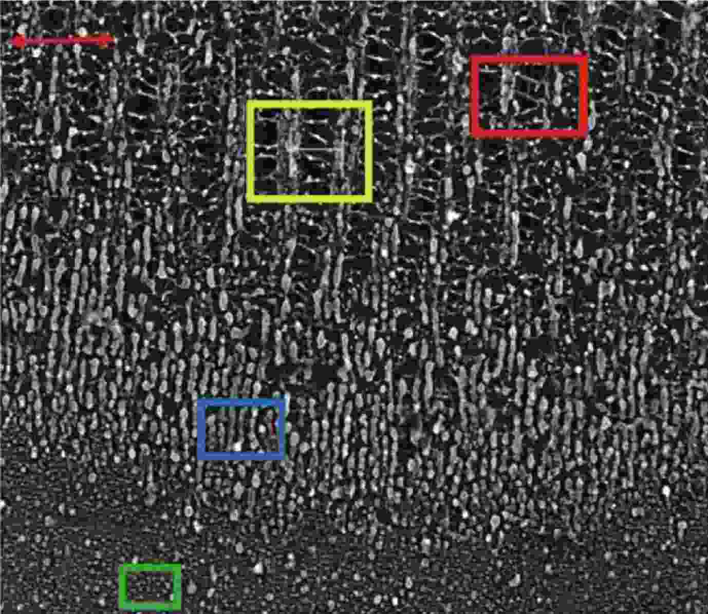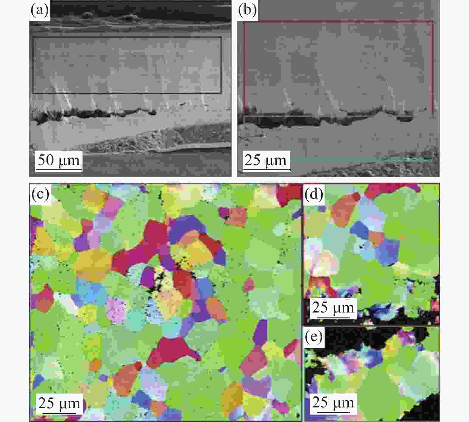 图 7 多晶钽层裂的微观结构分析((c)、(d)、(e)对应(a)和(b)中标记的矩形区域;(c)是在层裂较远的区域,初期层裂表现为样品中出现分散的小孔洞,EBSD扫描显示了晶界和晶内的孔洞;(d)和(e)为层裂正下方区域,该区域内颗粒尺寸较小)