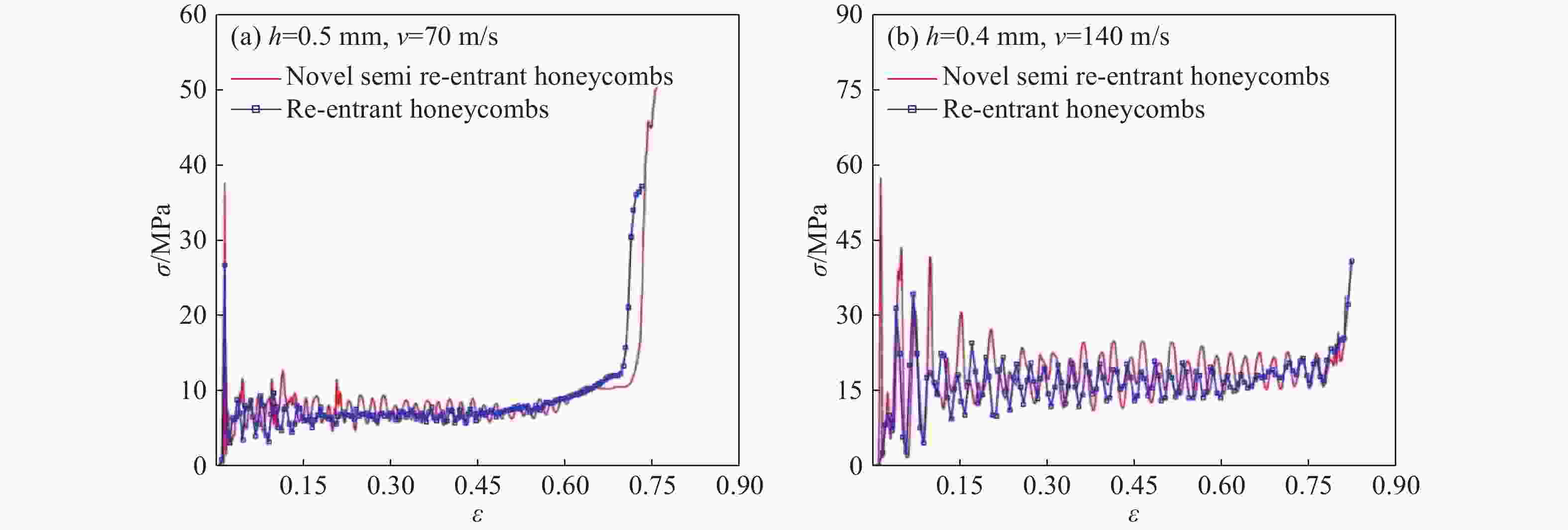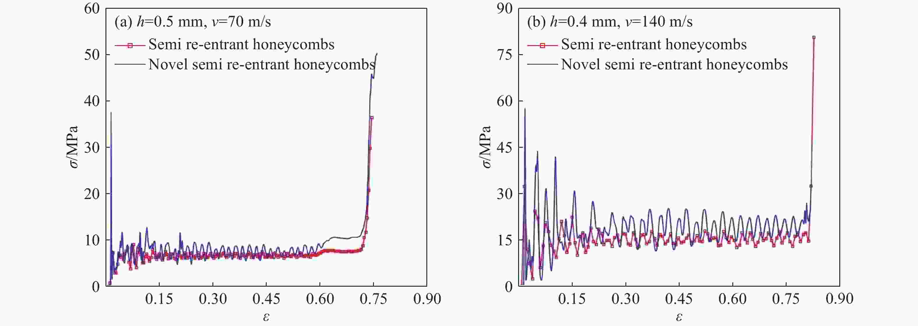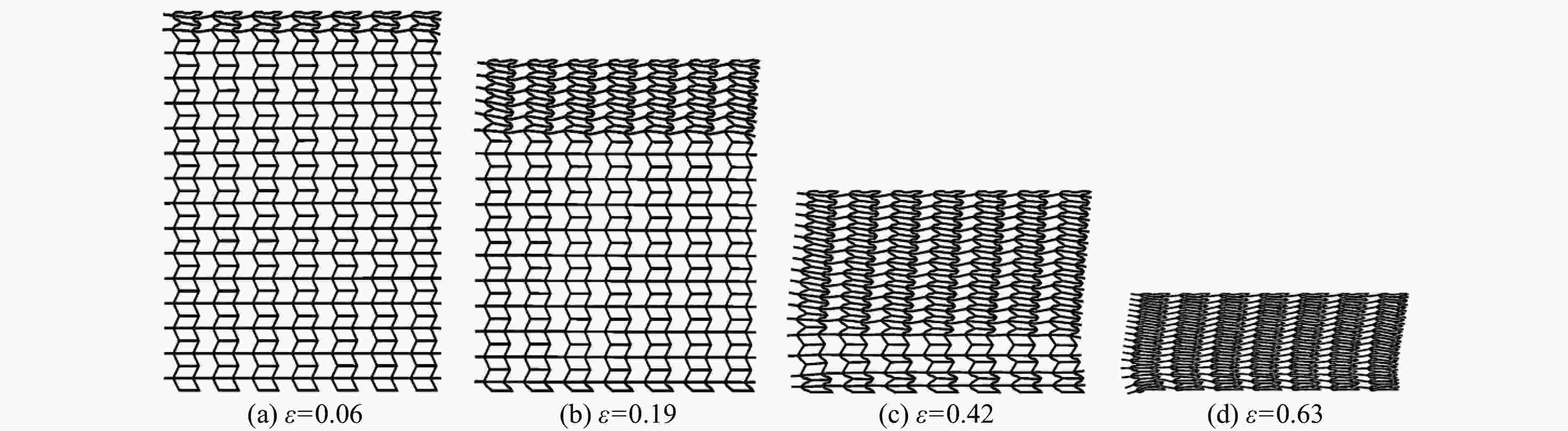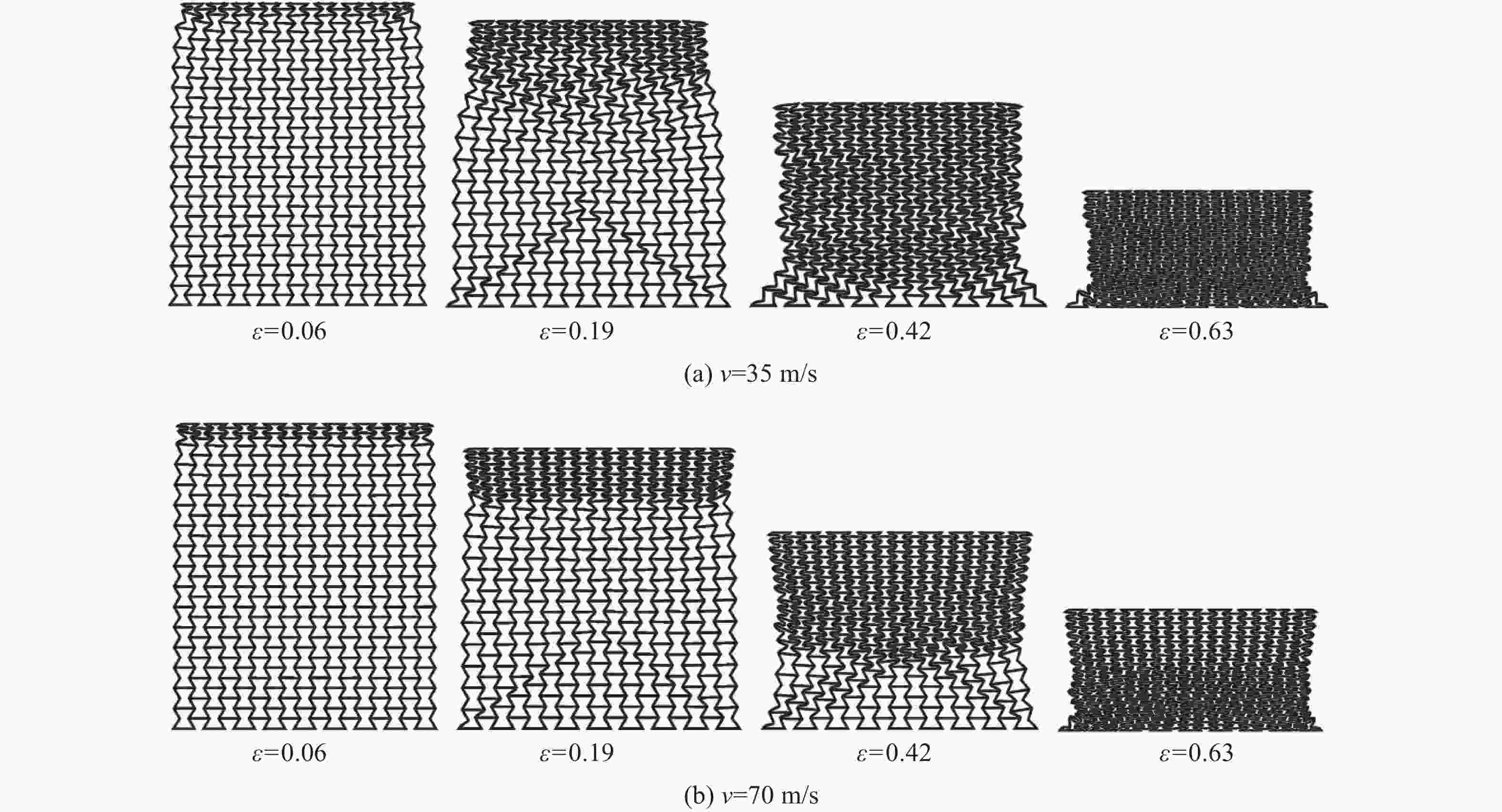 h/mm v/(m∙s−1) Average crushing strength/MPa Deviation/% Ref.[9] Numerical 0.3 70 2.491 2.287 8.19 0.3 100 4.677 4.893 4.62 0.4 70 3.777 3.952 4.63 0.4 100 6.802 7.384 8.56 表 2 半凹角蜂窝结构的平台应力