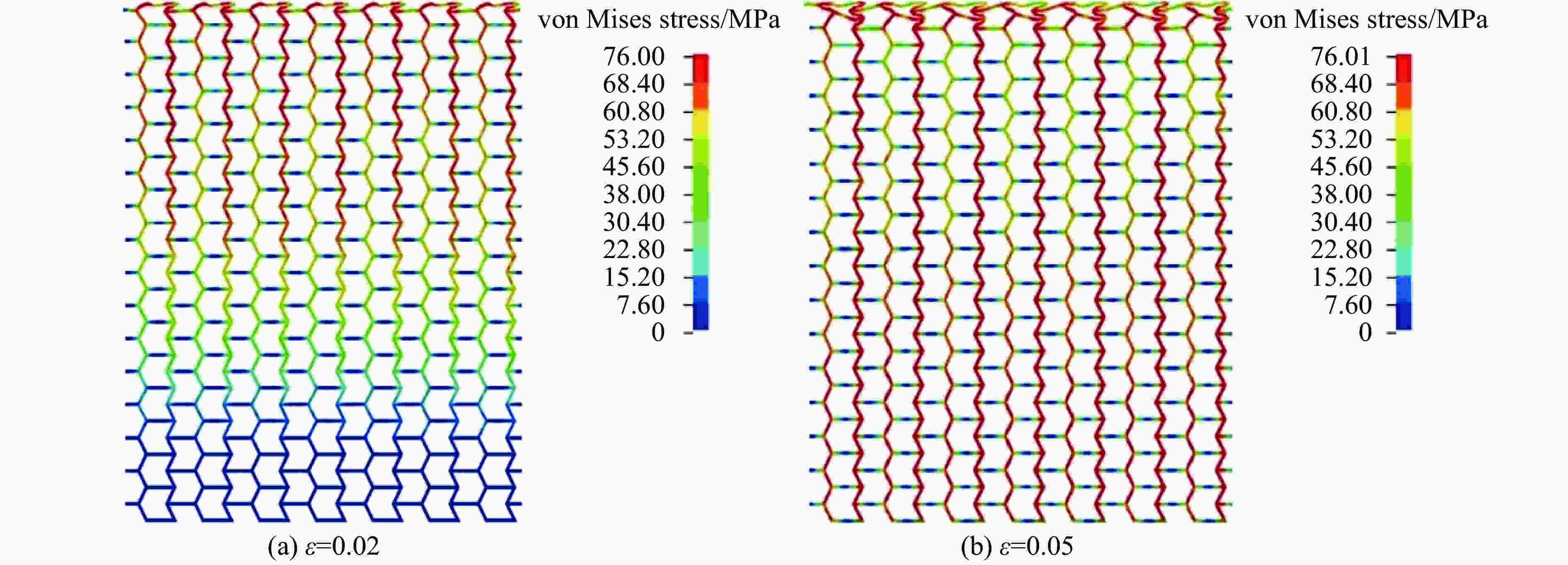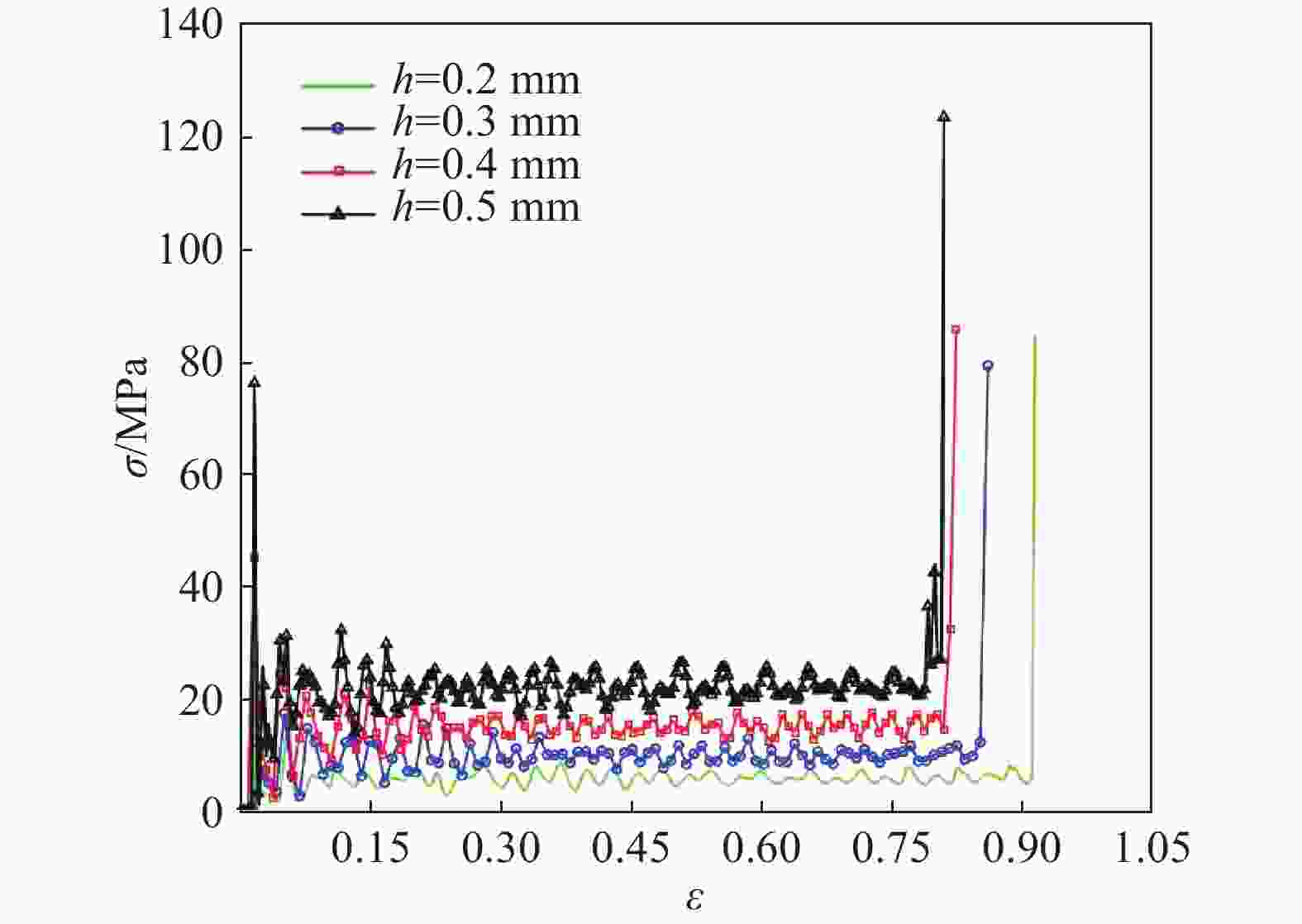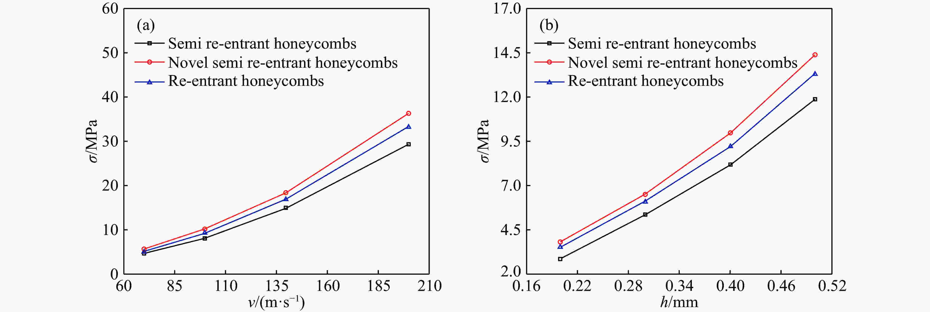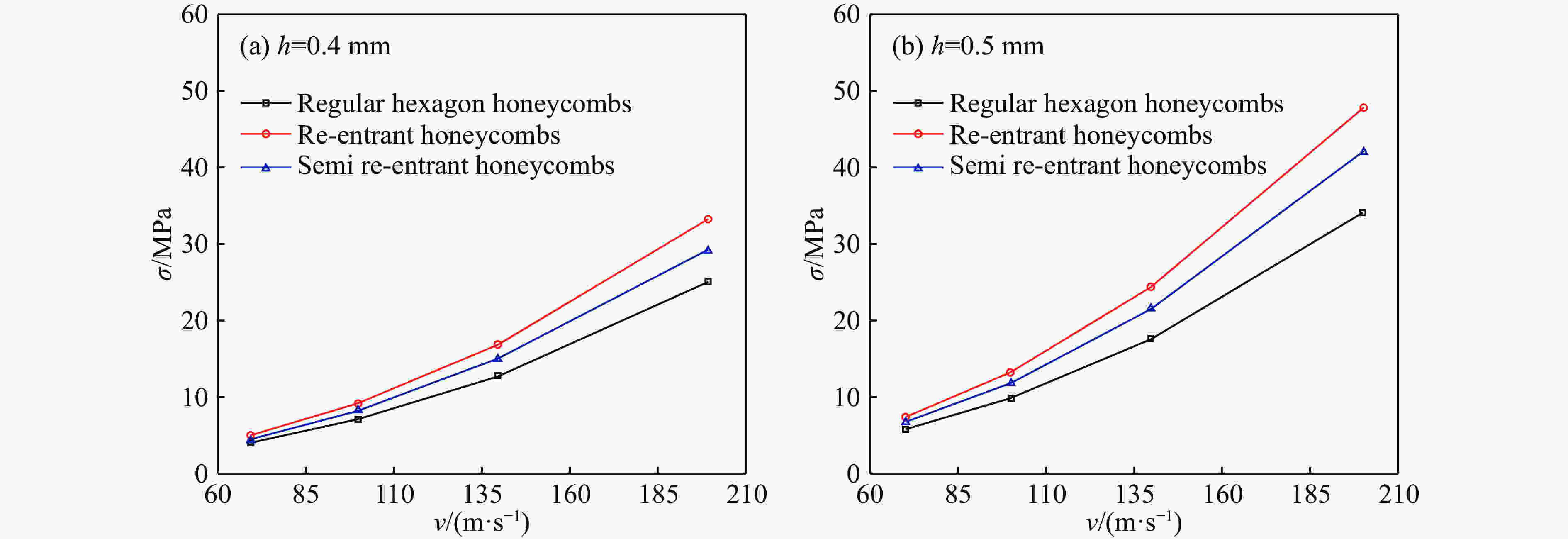 h/mm v/(m∙s−1) Average crushing strength/MPa Deviation/% Ref.[9] Numerical 0.3 70 2.491 2.287 8.19 0.3 100 4.677 4.893 4.62 0.4 70 3.777 3.952 4.63 0.4 100 6.802 7.384 8.56 表 2 半凹角蜂窝结构的平台应力