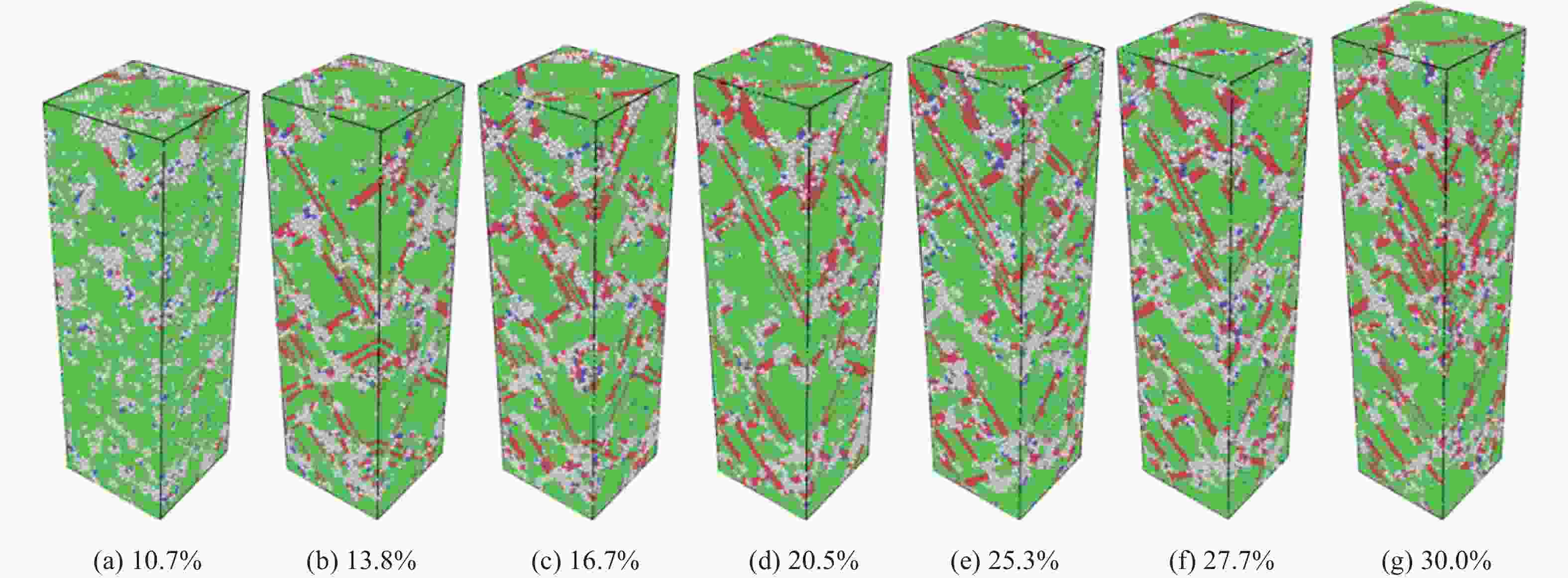摘要: 高熵合金具有传统合金无法比拟的高强度、高硬度和高耐磨耐腐蚀性,具有广阔的应用前景。为研究AlCrFeCuNi高熵合金(High entropy alloy, HEA)在轴向载荷作用下的力学性能,采用分子动力学方法,模拟高熵合金的实验制备过程并建立原子模型,研究温度和Al的含量对AlCrFeCuNi高熵合金力学性能的影响,从材料学角度分析了变形过程及其具有高塑性的原因。模拟结果表明,AlCrFeCuNi高熵合金在拉伸载荷作用下依次经历弹性、屈服、塑性3个变形阶段。在屈服阶段,开始出现孪晶和层错,孪晶和层错的产生和生长是合金产生不均匀塑性变形的主要原因之一。高熵合金的杨氏模量和屈服应力随着Al含量的增加近似线性降低,同时具有很强的温度效应,温度越低,Al含量越小,其杨氏模量和屈服应力的下降幅度越大。Abstract: High entropy alloy (HEA) has high strength, high hardness, high wear resistance and corrosion resistance which traditional alloys do not have, and has broad application prospects. The mechanical properties of AlCrFeCuNi high Entropy Alloy (HEA) under axial loading were also studied in this paper. Molecular dynamics method was used to simulate the experimental preparation process of HEA and establish an atomic model. The mechanical properties of AlCrFeCuNi HEA at different temperatures and Al concentrations were studied. The deformation process and the reasons for its high plasticity were analyzed from the point of view of material science. The simulation results show that the AlCrFeCuNi HEA undergoes elastic deformation, yield and plastic deformation stages under tension loads. In the yield stage, the appearance and growth of twins and stacking faults are one of the main reasons for the uneven plastic deformation of the alloy. The analysis shows that the Young’s modulus and yield stress of the HEA decrease linearly with the increase of Al concentration. The HEA have strong temperature effect. The lower the temperature, the smaller the Al concentration, and the greater the decrease in Young’s modulus and yield stress.