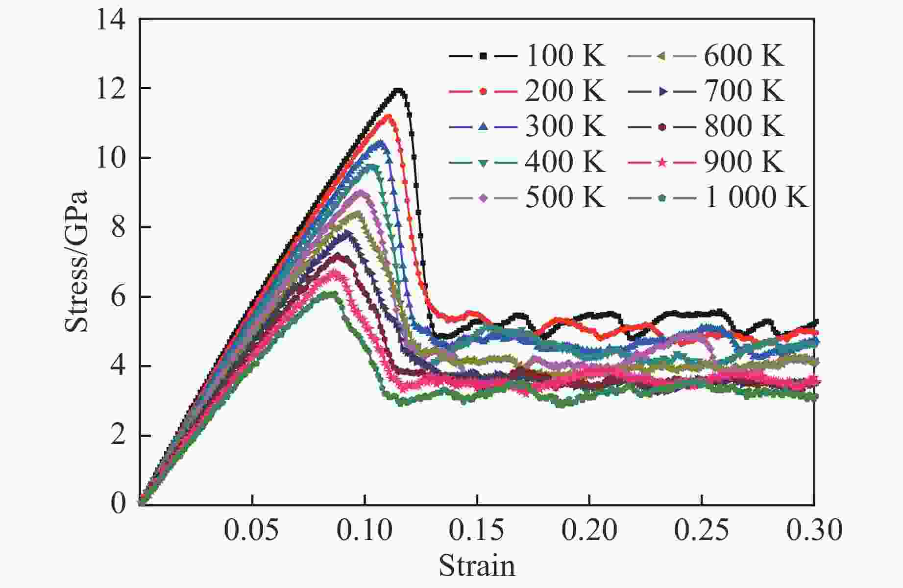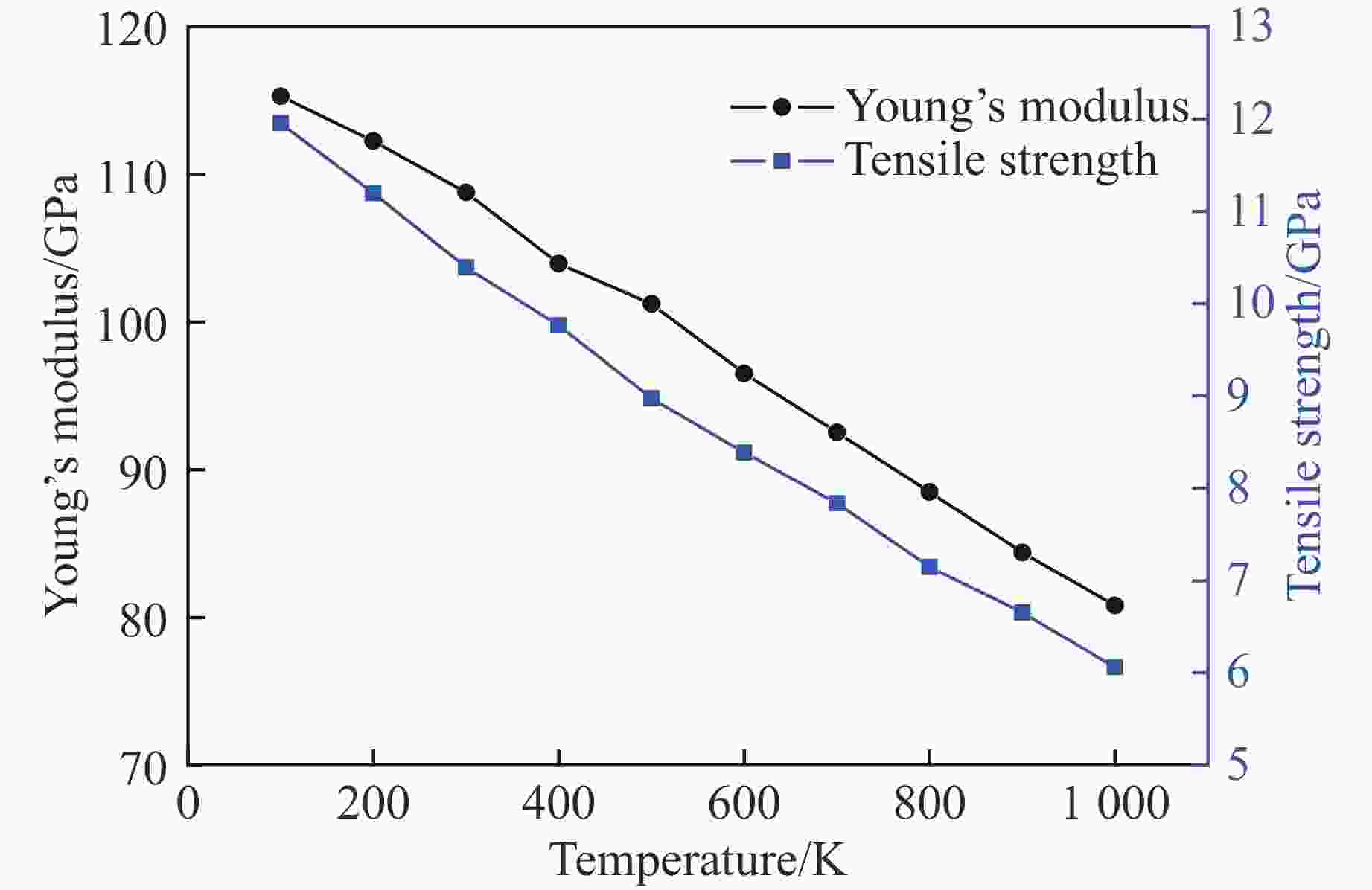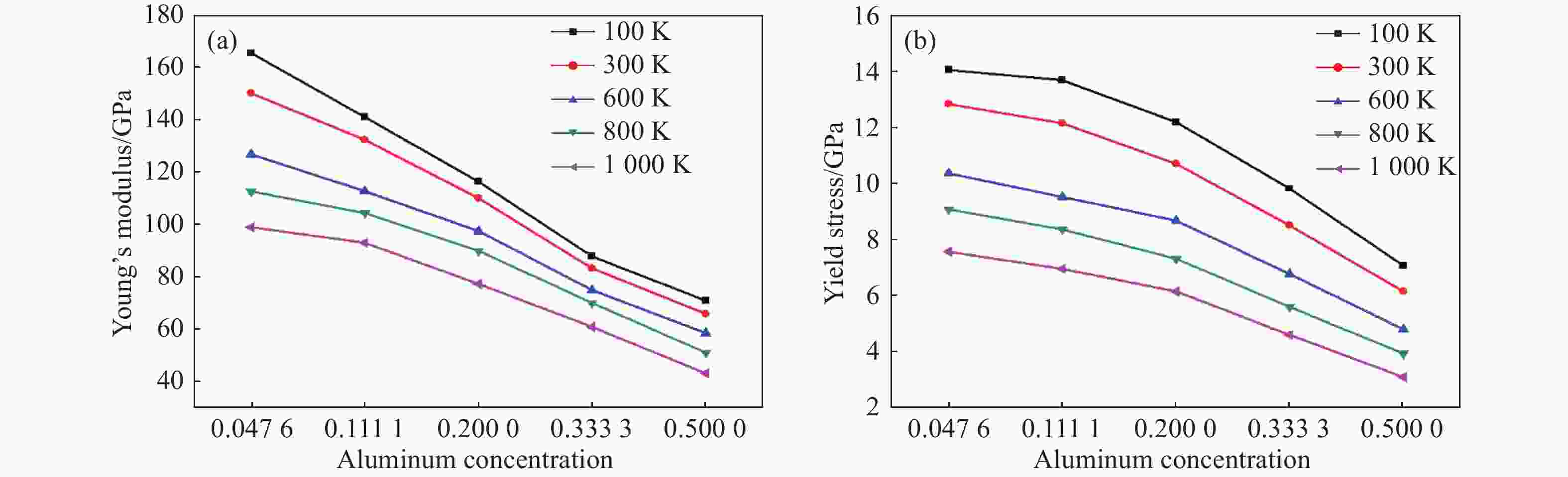 T/K Young’s modulus/GPa Yield stress/GPa x=0.2 x=0.5 x=1.0 x=2.0 x=4.0 x=0.2 x=0.5 x=1.0 x=2.0 x=4.0 100 165.61 141.06 116.39 87.83 70.94 14.05 13.68 12.19 9.82 7.08 300 150.16 132.42 110.13 83.28 65.87 12.83 12.15 10.70 8.51 6.16 600 126.82 112.77 97.55 74.98 58.55 10.36 9.52 8.68 6.78 4.81 800 112.70 104.47 89.96 70.05 51.08 9.08 8.37 7.32 5.61 3.94 1 000 99.06 93.09 77.37 60.94 43.13 7.57 6.96 6.16 4.61 3.10 -