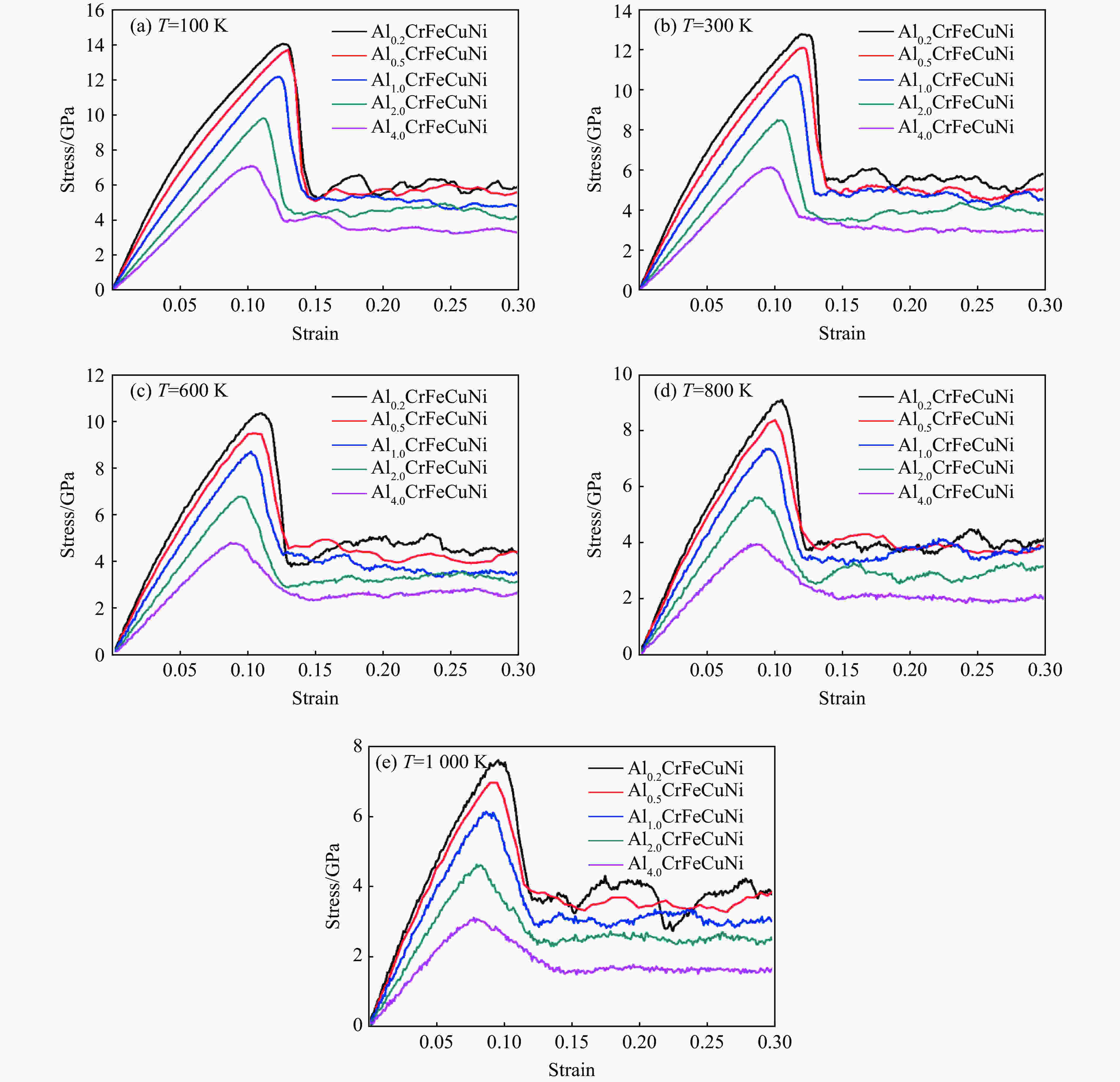 GPaYield strain 100 115.273 11.954 0.115 600 96.507 8.383 0.097 200 112.251 11.197 0.111 700 92.532 7.838 0.092 300 108.768 10.390 0.107 800 88.503 7.147 0.088 400 103.950 9.765 0.103 900 84.382 6.652 0.087 500 101.228 8.975 0.099 1 000 80.808 6.060 0.086 表 3 AlxCrFeCuNi高熵合金中Al百分含量和各元素原子个数