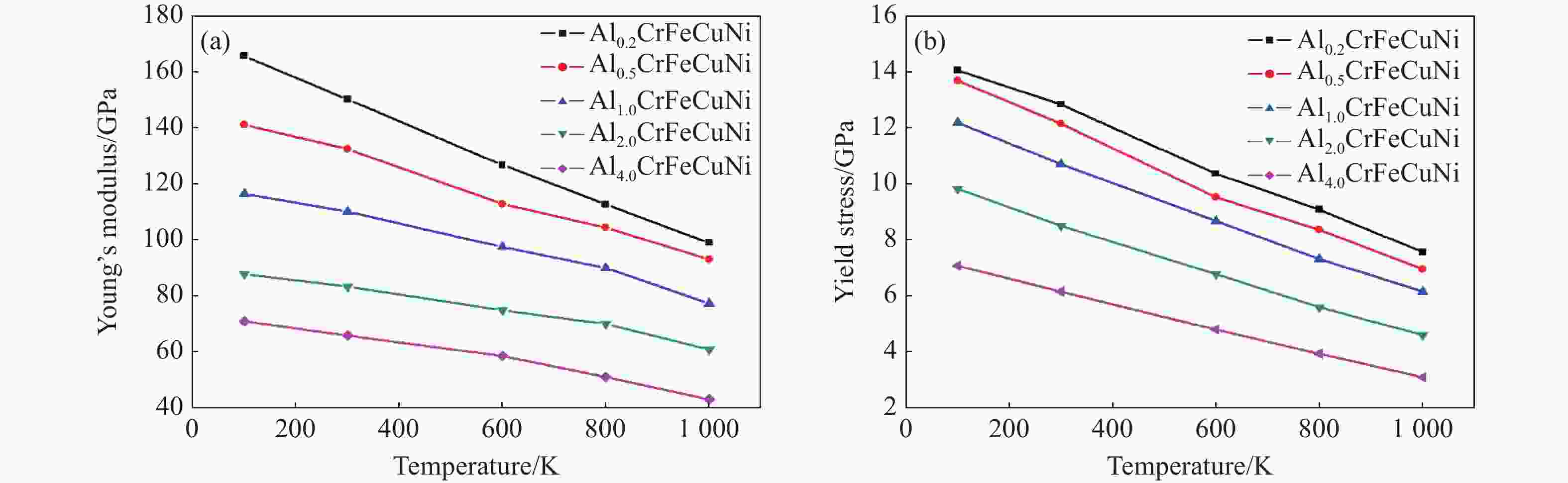 Table 4. Young’s modulus and yield stress of AlxCrFeCuNi at different temperatures and different Al concentrations