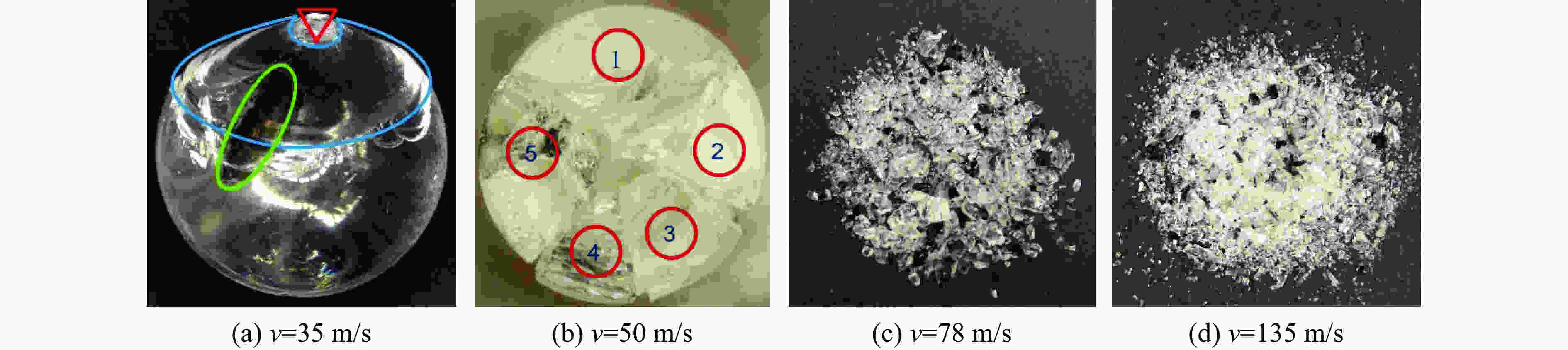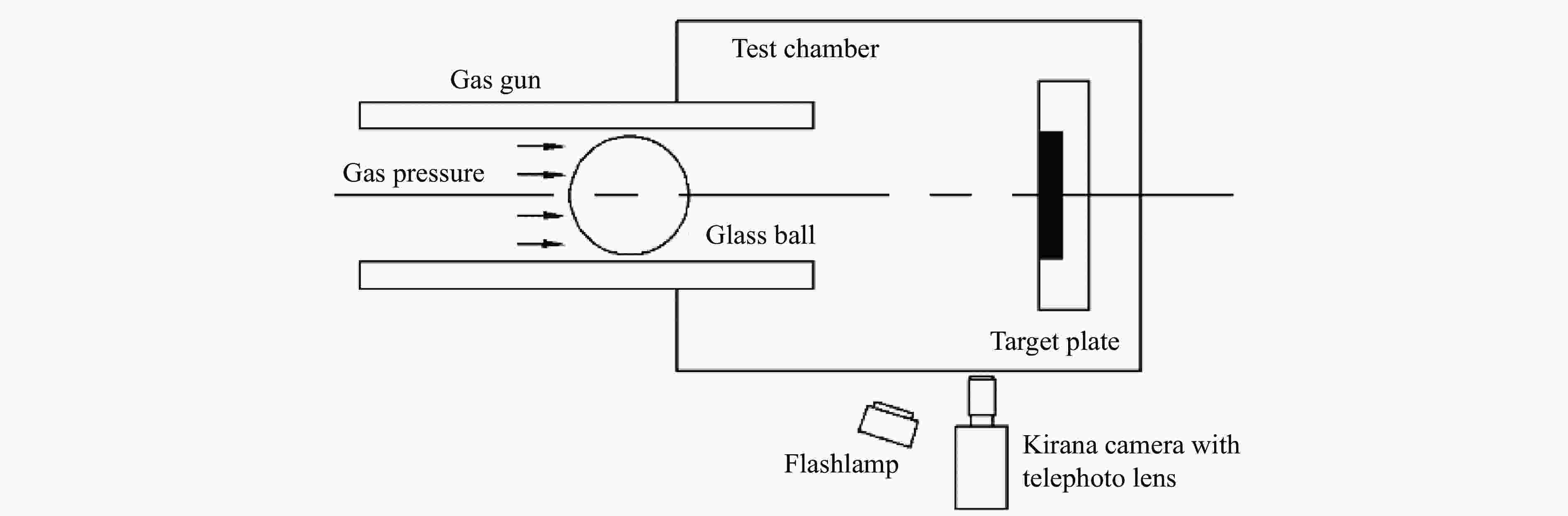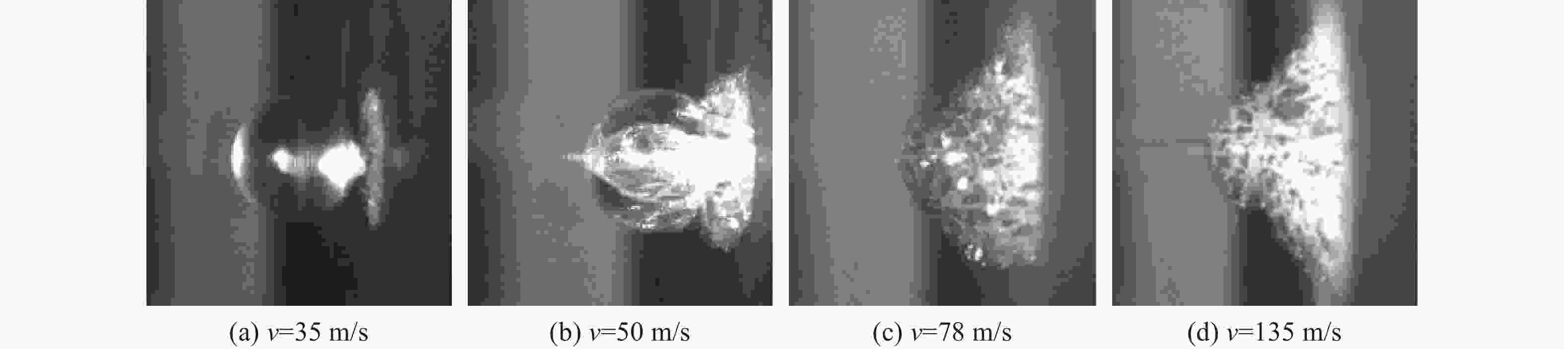 摘要: 利用高速枪对石英玻璃球撞击刚性靶板进行了实验研究,分析了不同速度下球体的破碎过程和失效模式。当冲击速度低于临界破坏速度时,石英玻璃球以略低于原速从靶板回弹;当超过临界破坏速度时,球体呈现“压缩破碎区-表面剥落区-剪切破坏区”的破坏结构;进一步提高碰撞速度,剪切破坏区的扩展导致球体碎裂为若干“月牙状”的碎块;更高撞击速度下,石英玻璃球发生坍塌式破碎,在远离撞击端处产生层裂现象。利用离散元软件对球体的撞击破坏过程进行了模拟研究,球体在高速碰撞下的破碎可以分为弹性压缩、整体破碎和二次撞击3个阶段。球体碎裂前Hertz接触理论可以较好描述其撞击力,而破碎后的撞击力由于碎裂卸载远小于理论值,且偏差随冲击速度逐渐增加。Abstract: The high-speed gun is used to study the impact of quartz glass ball on rigid target plate. The crushing process and failure mode of the ball at different speeds are analyzed. When the impact velocity is lower than the critical failure velocity, the quartz glass ball rebounds from the target plate, and the rebounding speed is slightly below the original speed; when the critical speed is exceeded, the sphere exhibits a “compressed fracture zone–surface spalling zone–shear failure zone” failure structure; further increasing the collision velocity, the expansion of the shear failure zone causes the sphere to be fragmented into several “crescent” fragments. At higher impact speeds, the quartz glass ball collapses and spalls at a distance away from the impact end. Furthermore, the discrete element software is utilized to simulate the impact damage process of the sphere. The crushing of the sphere under high-speed collision can be divided into three stages: elastic compression, integral crushing, secondary impact. Before the ball breaks, the Hertz contact theory can describe its impact force well, but the crushing force is much smaller than the theoretical value due to the fracture unloading, and the deviation gradually increases with the increasing impact speed.