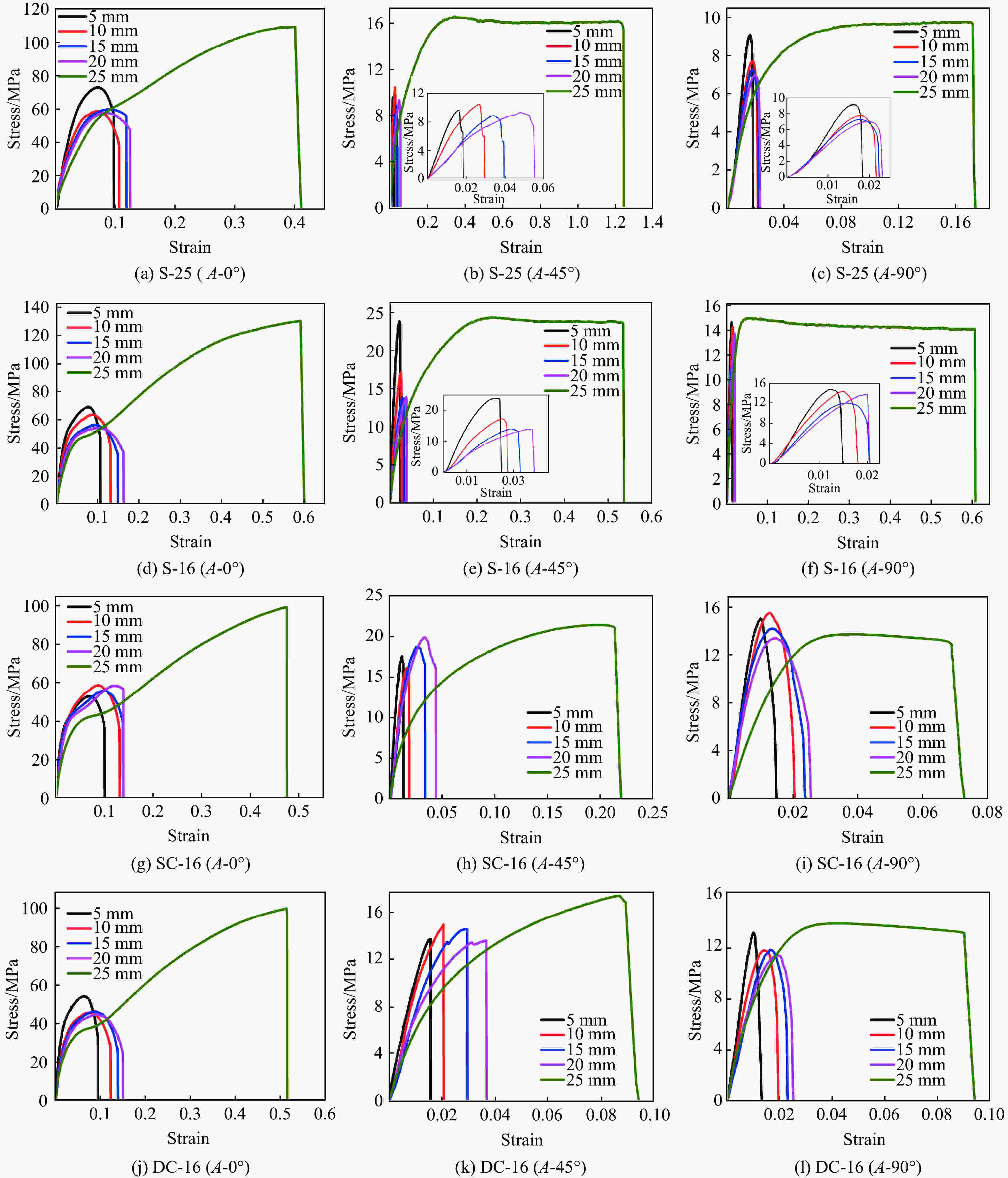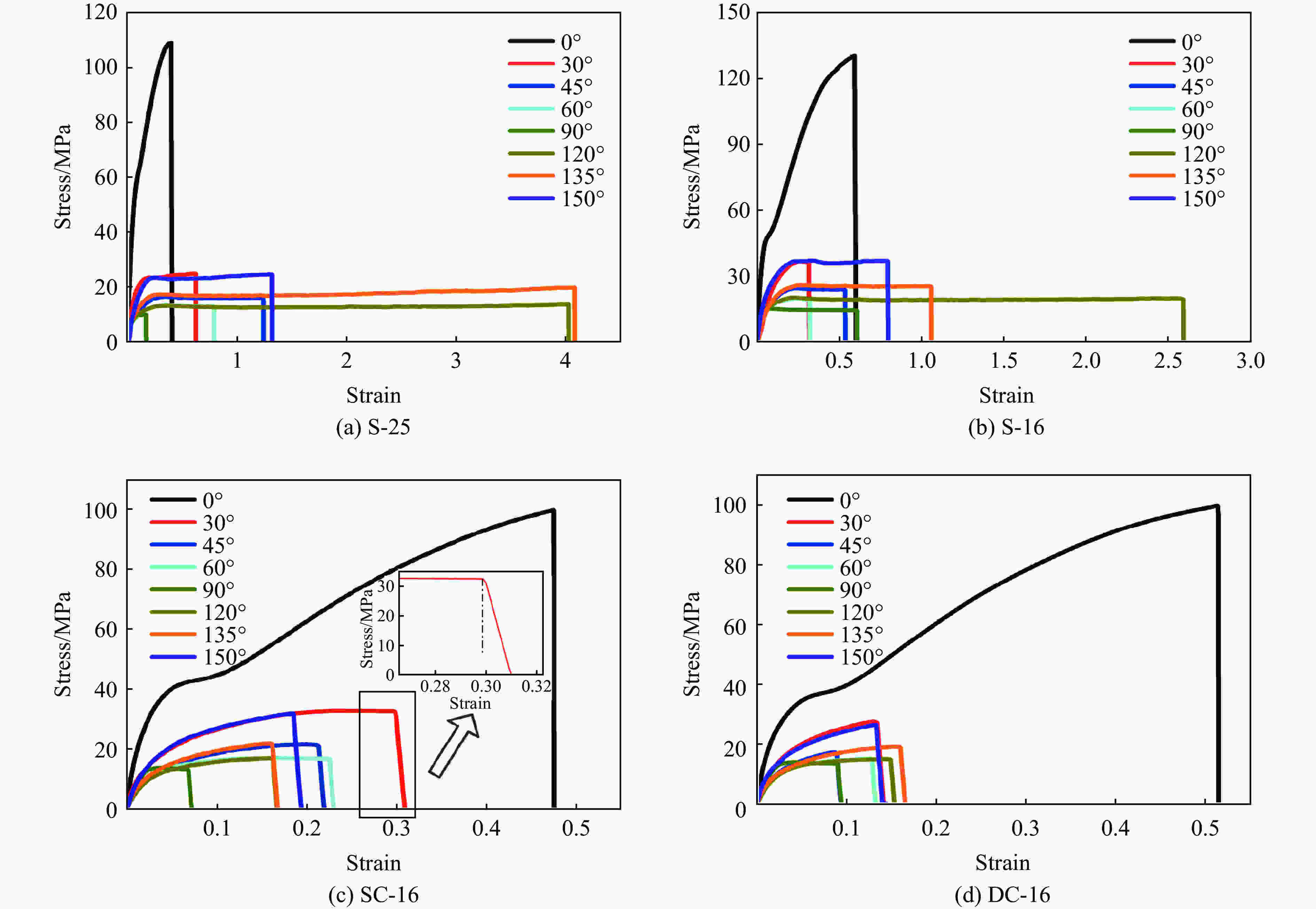 Specimen type σθ/MPa σ0/σ90 0° 30° 45° 60° 90° 120° 135° 150° S-25 107.8 ± 10.8 26.3 ± 1.7 17.3 ± 0.3 13.1 ± 0.4 10.0 ± 0.2 13.8 ± 0.5 19.1 ± 1.2 25.4 ± 1.2 10.8 S-16 127.3 ± 10.6 37.7 ± 1.5 25.4 ± 1.2 19.7 ± 0.3 15.7 ± 0.5 19.4 ± 0.5 25.7 ± 1.1 38.3 ± 0.8 8.1 SC-16 101.2 ± 4.9 30.9 ± 1.8 21.6 ± 1.1 16.9 ± 0.4 13.8 ± 0.4 17.1 ± 0.5 20.8 ± 1.7 29.5 ± 3.1 7.3 DC-16 98.7 ± 7.7 27.1 ± 2.1 18.1 ± 0.8 15.2 ± 0.4 13.8 ± 0.4 15.1 ± 0.6 19.2 ± 0.4 26.5 ± 1.7 7.2 -