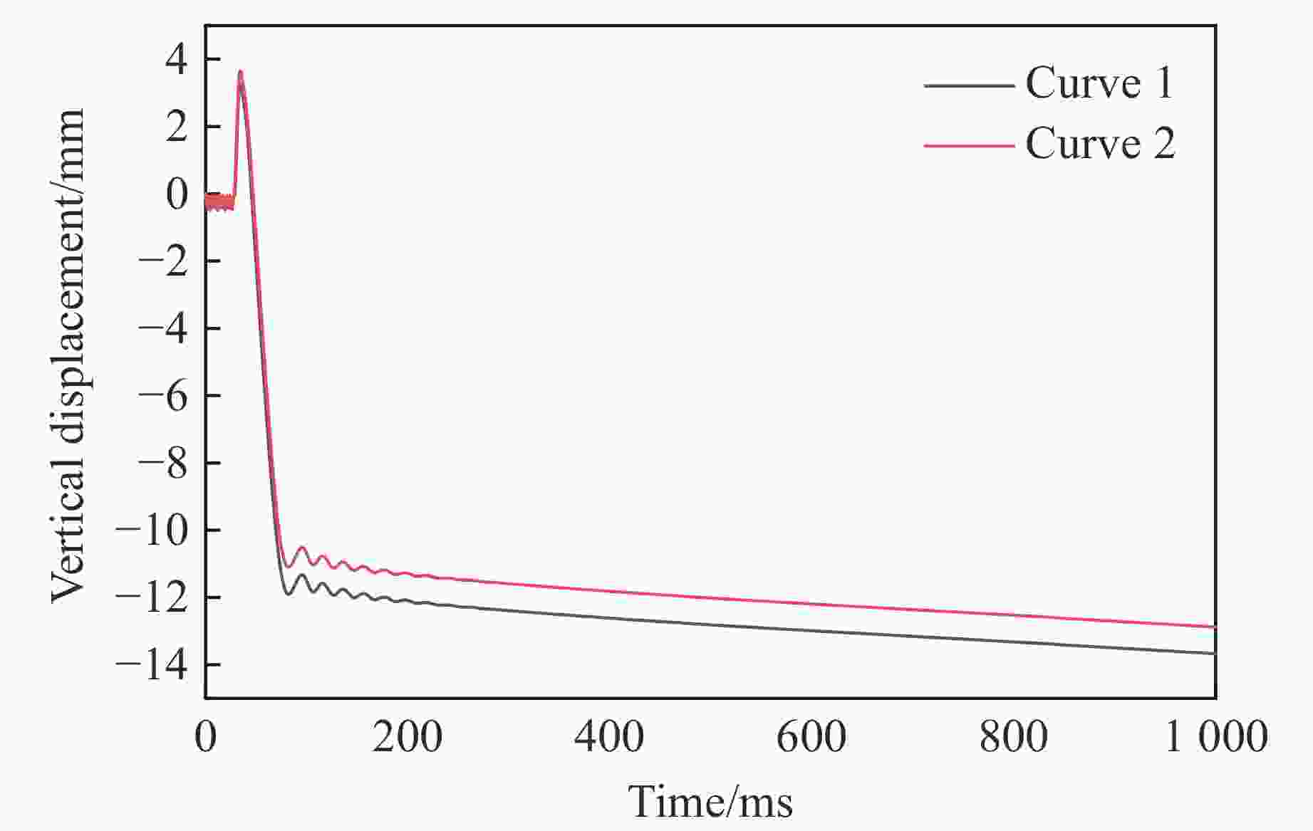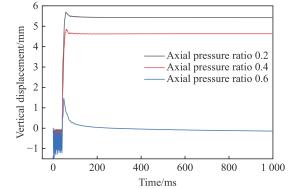 Parts Material model Material parameters Hammer *MAT_ELASTIC $\rho = 7\;800\;{\rm{kg/} }{ {\rm{m} }^{\rm{3} } },\;E = 200\;{\rm{GPa,} }\;\nu = 0.27$ Concrete *MAT_CSCM $\rho = 2\;400\;{\rm{kg/}}{{\rm{m}}^{\rm{3}}},\;{f_{\rm{c}}} = 30\;{\rm{MPa}},\;d = 20\;{\rm{mm}}$ Distributed reinforcement *MAT_PLASTIC_KINEMATIC $ \rho = 7\;800\;{\rm{kg/} }{ {\rm{m} }^{\rm{3} } },\;E = 200\;{\rm{GPa} },\;\nu = 0.27,$ $ {f_{\rm{y} } } = 490\;{\rm{MPa} },\;{f_{\rm{u} } } = 656\;{\rm{MPa} },\;{E_{\rm{t} } } = 1.1\;{\rm{GPa} }$ Stirrups *MAT_PLASTIC_KINEMATIC $ \rho = 7\;800\;{\rm{kg/} }{ {\rm{m} }^{\rm{3} } },\;E = 210\;{\rm{GPa} }, \nu = 0.27,$ $ {f_{\rm{y}}} = 340\;{\rm{MPa}},\;{f_{\rm{u}}} = 521\;{\rm{MPa}},\;{E_{\rm{t}}} = 1.1\;{\rm{GPa}}$ 表 2 梁跨中最大位移比较