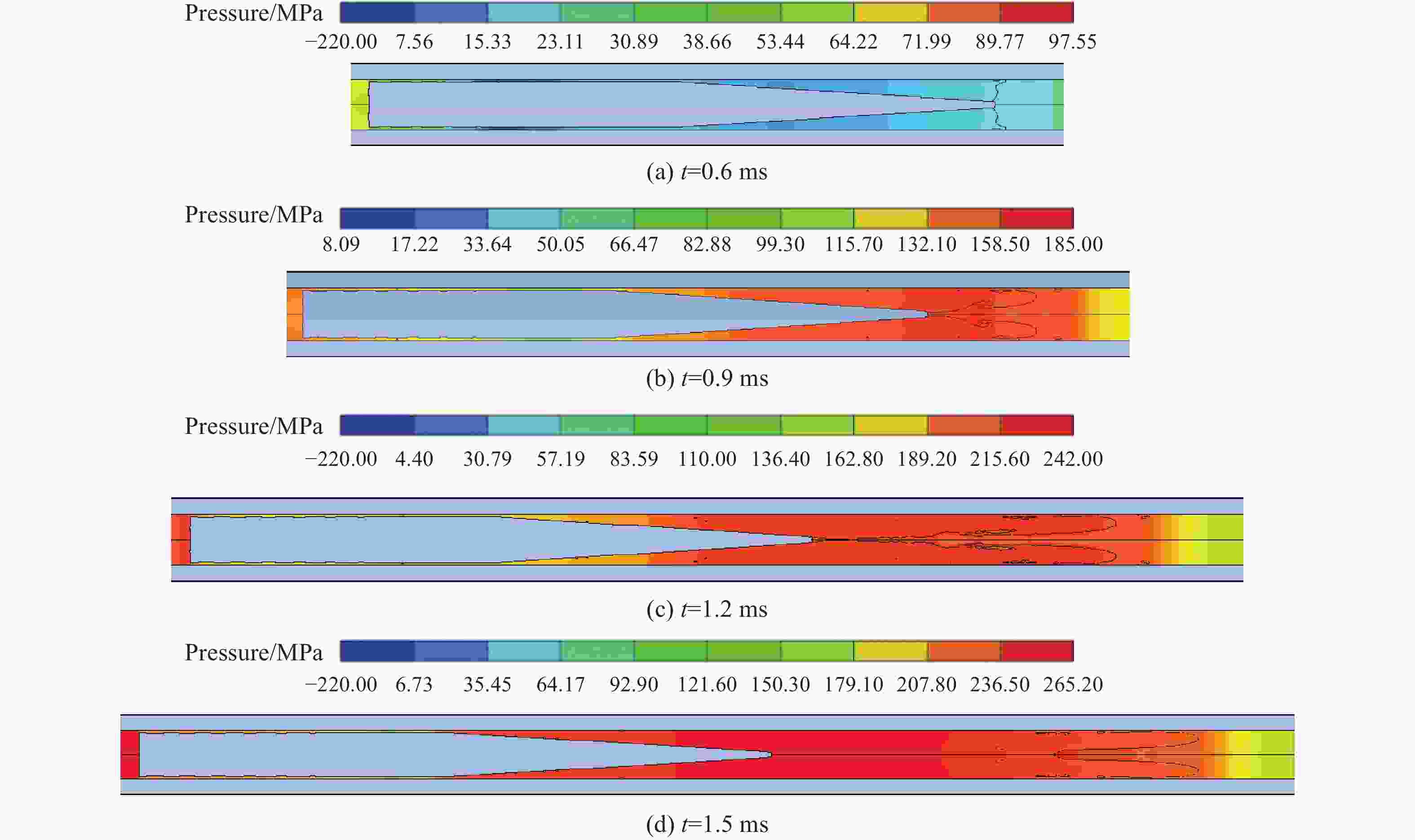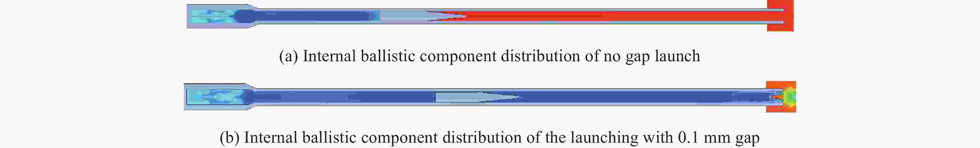 摘要: 为了研究枪炮全水下发射过程中枪弹耦合间隙对内弹道特性的影响,运用AUTODYN有限元仿真软件,针对滑膛水下枪枪弹耦合设置0.1 mm间隙与不设置间隙两种情况的内弹道过程进行了数值模拟;采用21、25和30 g装药量对水下枪全水下带间隙发射内弹道过程进行了仿真分析,获得了膛压、射弹速度以及过间隙燃气射流在内弹道过程中组分、压力与速度的分布规律;并设计了实弹射击实验用于验证仿真结果。仿真和实验结果表明,合适的枪炮耦合间隙能够有效地提高水下枪发射性能。当枪弹耦合设置0.1 mm间隙时,采用3种装药量发射均能产生弹前气幕,内弹道过程膛压下降明显,弹丸炮口速度提升较为显著,有利于产生稳定的超空泡包裹弹体,使其在水下运动时所受阻力大大降低,从而增加射弹水下行程。Abstract: In this paper, the influence of the gun-bullet coupling gap on the internal ballistic characteristics during the full underwater launch of the gun have been studied. The internal ballistic process of setting 0.1 mm gap and no gap is simulated by AUTODYN finite element simulation software. And the internal ballistic process of underwater gun with underwater clearance is simulated using 21, 25 and 30 g propellant. The projectile velocity, pressure inside the barrel and the distribution of components, pressure and velocity of over-gap gas jets during the internal ballistic process are obtained from the simulation, and the simulation results is verified by experiment. The simulation and experimental results show that the proper gun coupling gap can effectively improve the underwater gun launch performance. When the gun-bullet coupling gap is set as 0.1 mm, the gas curtain are all obtained from the propellant with three different masses. Meanwhile, the pressure decreased obviously during the internal ballistic process, and the projectile speed at muzzle is improved significantly, which is beneficial to the production of stable supercavitation warp projectile. The resistance of the projectile moving underwater reduces greatly and the travel of the projectile increases underwater.