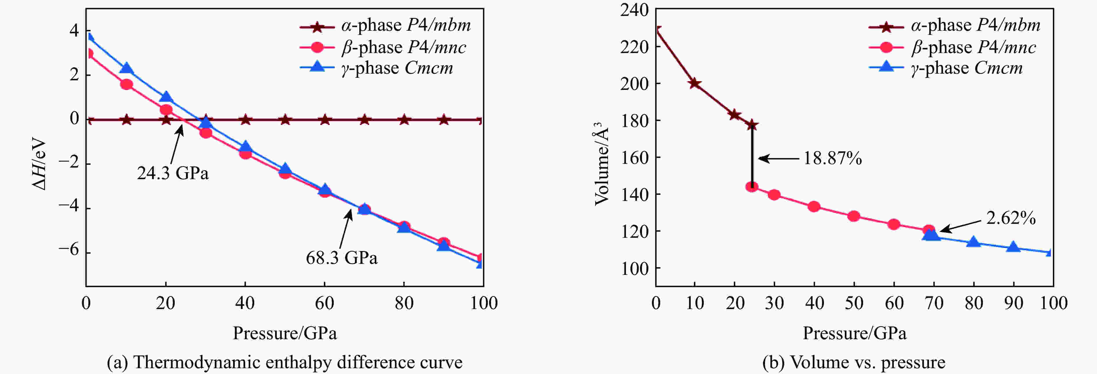 • 图  MgN8的焓差曲线以及α-MgN8β-MgN8γ-MgN8相体积随压强的变化关系