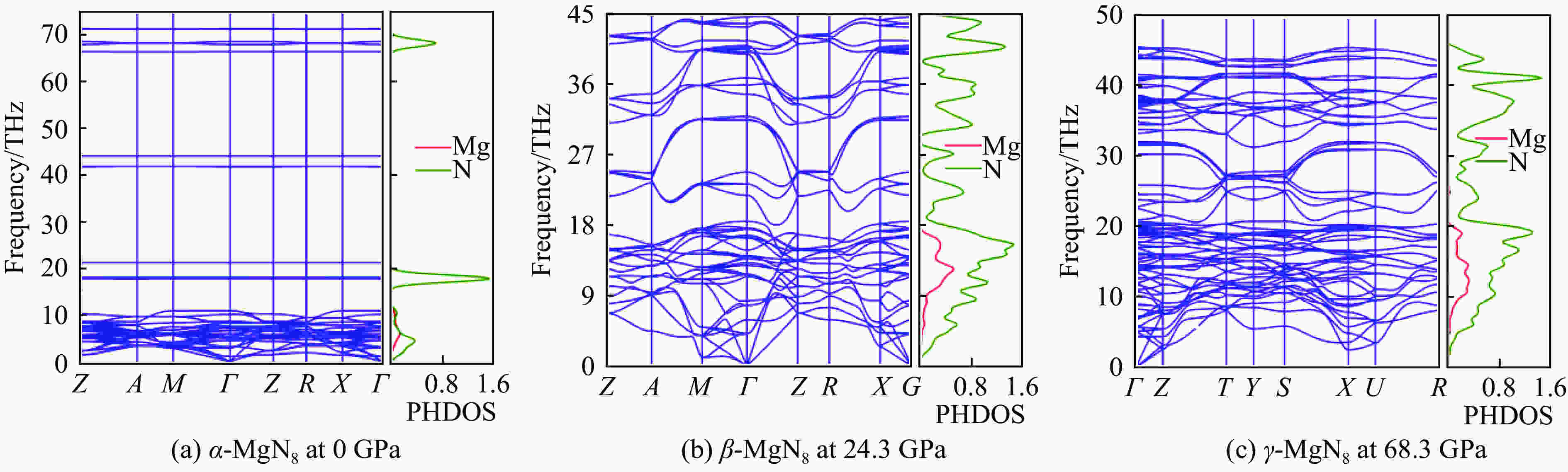 图  α-MgN8β-MgN8γ-MgN8相声子色散关系和声子态密度