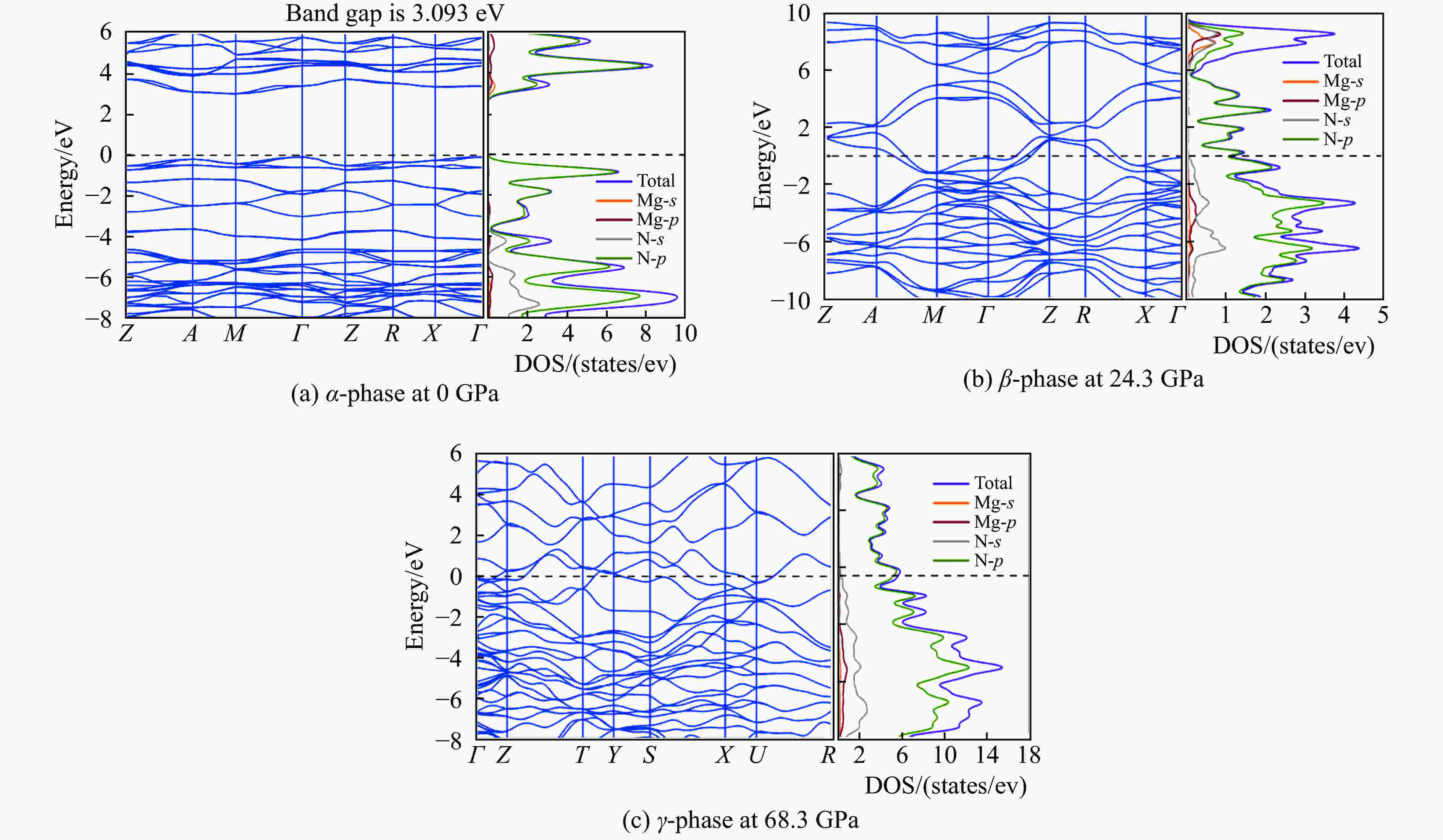 图  α-MgN8β-MgN8γ-MgN8相的能带结构和电子态密度