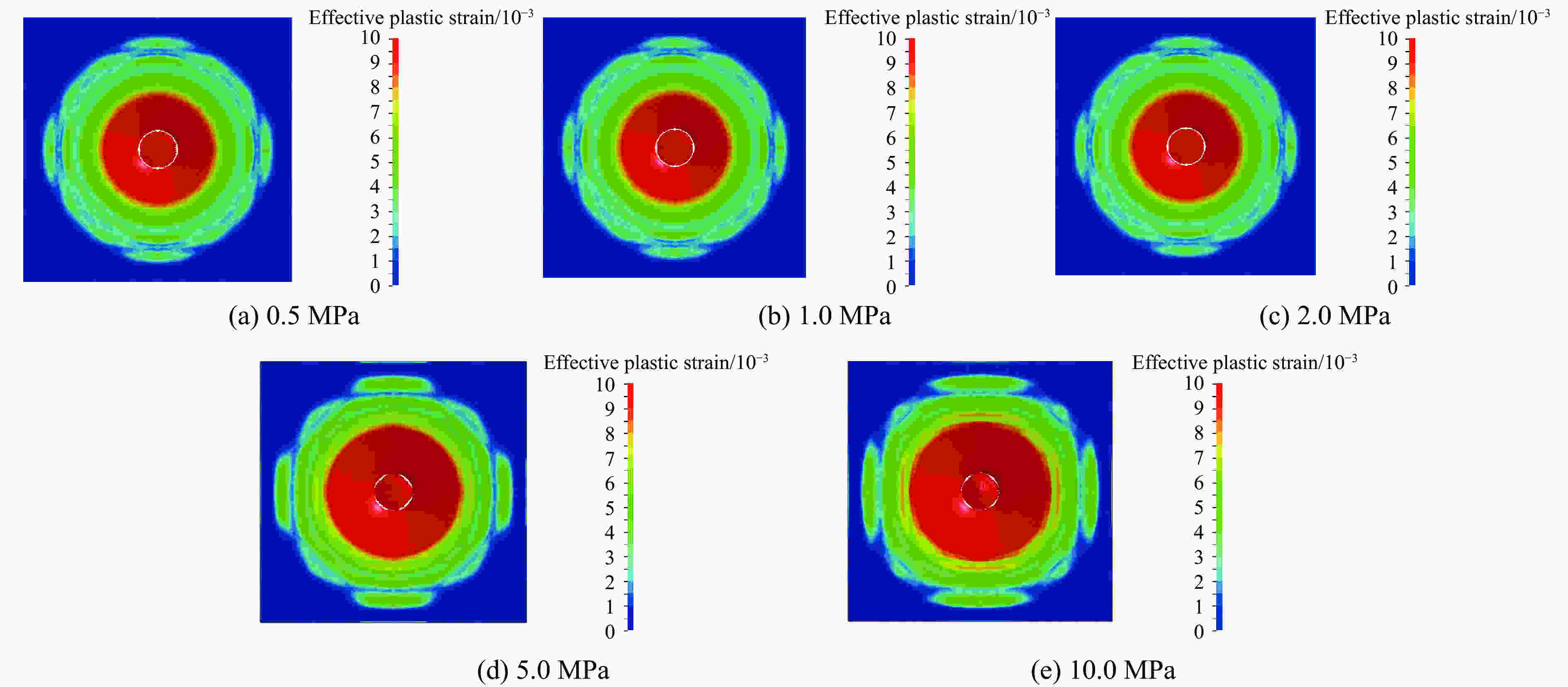 Material ρ/(g·cm–3) E/GPa μ cp/(J·kg–1·K–1) T0/K Tm/K Warhead shell 7.80 205 0.28 400.90 300 1 765 Target plate 7.80 200 0.30 452.00 298 1 881 Material $\dot \varepsilon $/s–1 A/MPa B/MPa n C m Warhead shell 1 760 500 0.53 0.014 1.13 Target plate 1 355 450 0.36 0.022 1.00 表 2 弹塑性硬化模型材料参数