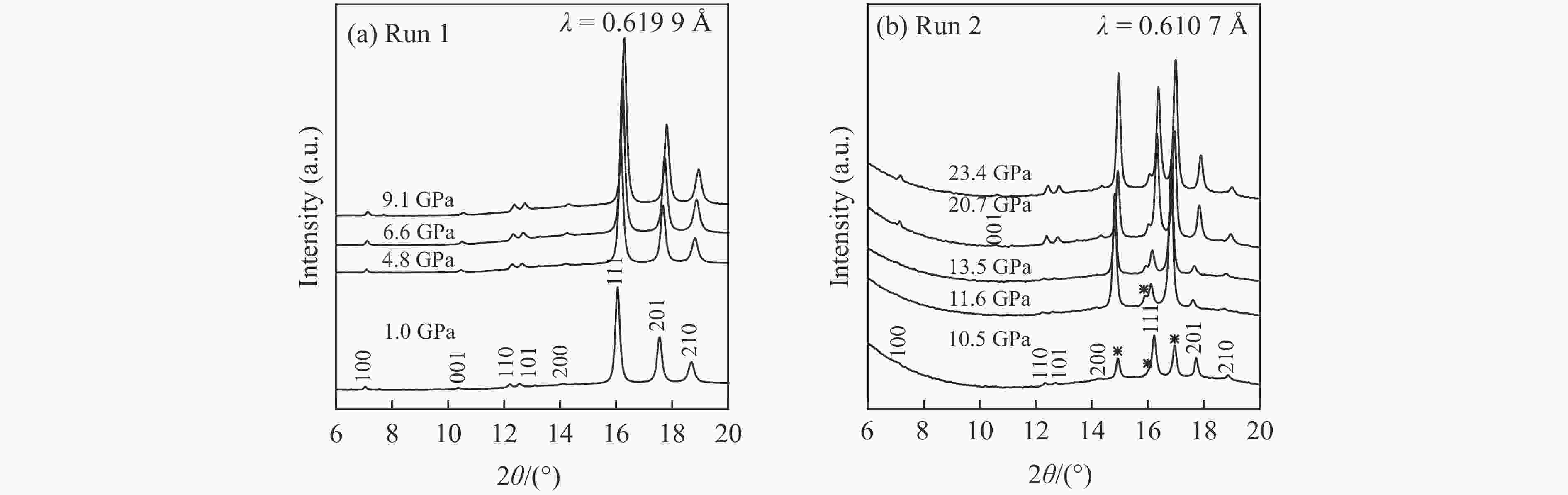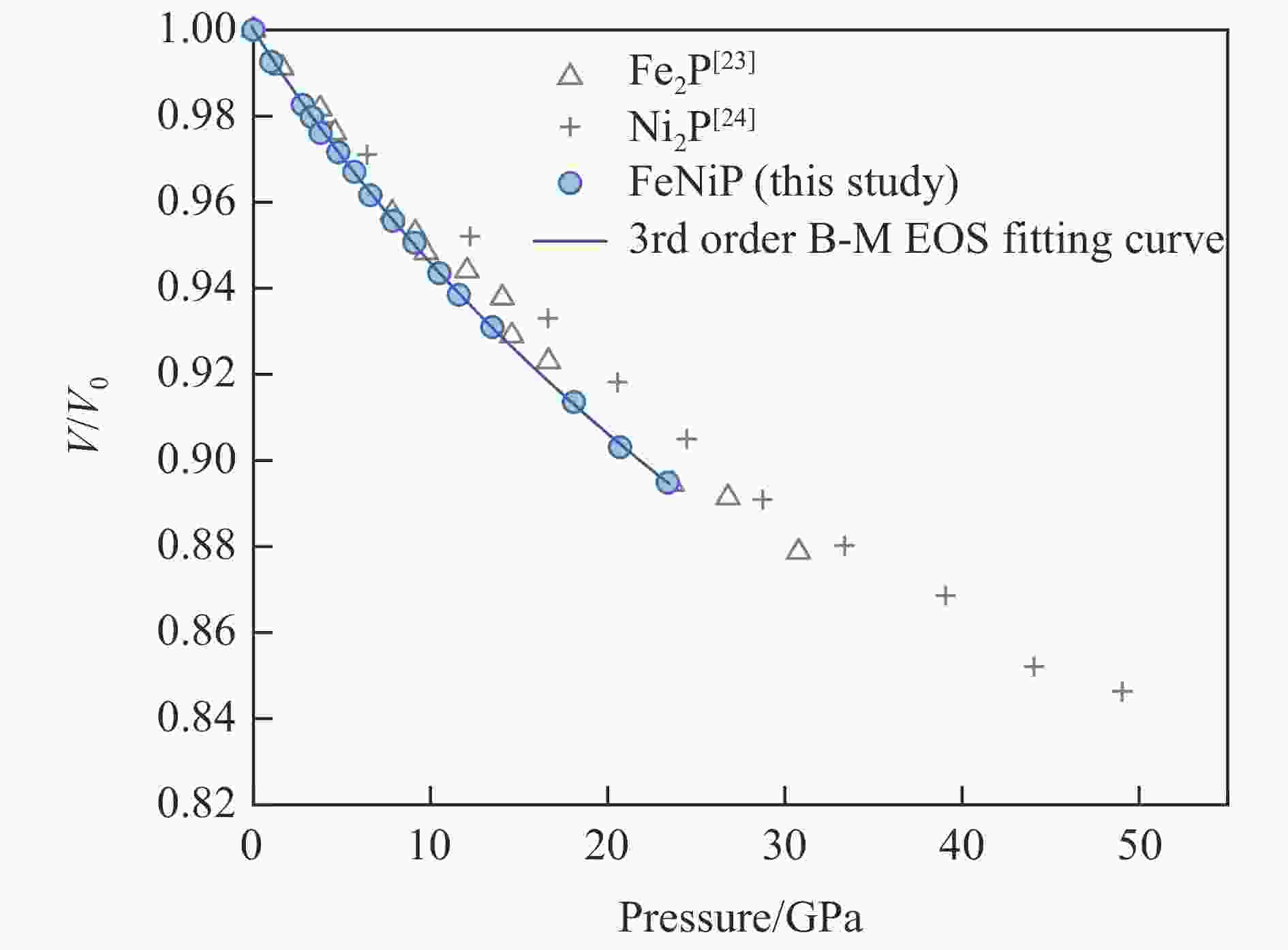 p/GPa a/Å c/Å V/Å3 p/GPa a/Å c/Å V/Å3 0.000 1 5.845(1) 3.433(1) 101.6(1) 7.9(1) 5.760(1) 3.379(1) 97.1(1) 1.0(1) 5.829(1) 3.426(1) 100.8(1) 9.1(1) 5.750(1) 3.372(1) 96.6(1) 2.8(1) 5.811(1) 3.413(1) 99.8(1) 10.5(1) 5.737(1) 3.362(1) 95.8(1) 3.3(1) 5.806(1) 3.410(1) 99.5(1) 11.6(1) 5.729(2) 3.353(2) 95.3(1) 3.8(1) 5.798(1) 3.406(1) 99.2(1) 13.5(1) 5.713(1) 3.346(1) 94.6(1) 4.8(1) 5.790(1) 3.400(1) 98.7(1) 18.1(1) 5.682(1) 3.320(1) 92.8(1) 5.7(1) 5.783(1) 3.392(1) 98.2(1) 20.7(1) 5.660(1) 3.306(1) 91.7(1) 6.6(1) 5.772(1) 3.385(1) 97.7(1) 23.4(1) 5.647(1) 3.292(1) 90.9(1) Note: Data of 1.0–9.1 GPa are from Run1, and data of 10.5–23.4 GPa are from Run 2; numbers in parentheses represent errors in the last digit. 表 2 Fe2P、Ni2P和FeNiP的B-M状态方程参数