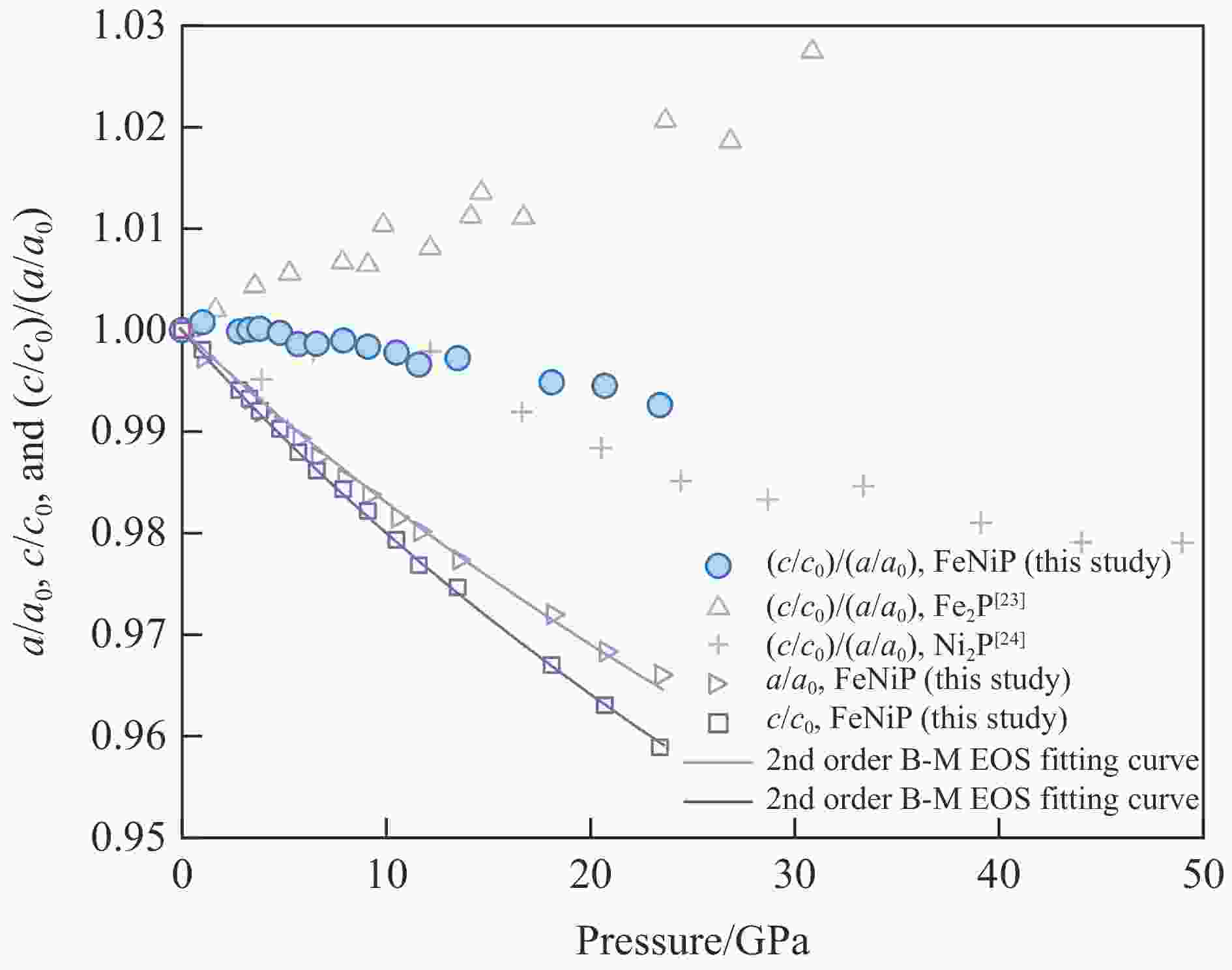 图 2 FeNiP的归一化轴长(a/a0和c/c0)及归一化轴长比值((c/c0)/(a/a0))随压力的变化关系(Fe2P和Ni2P的p-(c/c0)/(a/a0)数据[23–24]也被列出用于比较)