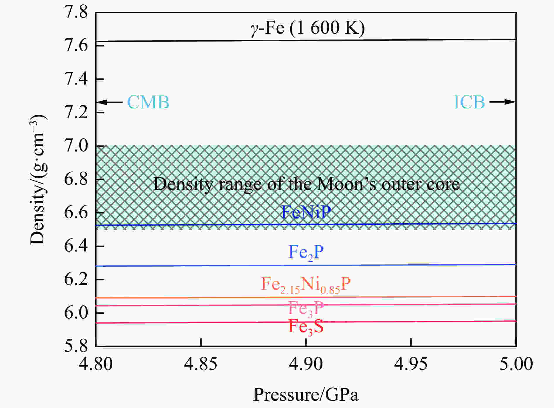图 5 月球外核温压(4.8~5.0 GPa,1 800 K)条件下FeNiP、Fe2P、Fe3P、Fe2.15Ni0.85P、Fe3P和Fe3S的估算密度(γ-Fe和月球外核密度也绘出用以比较)