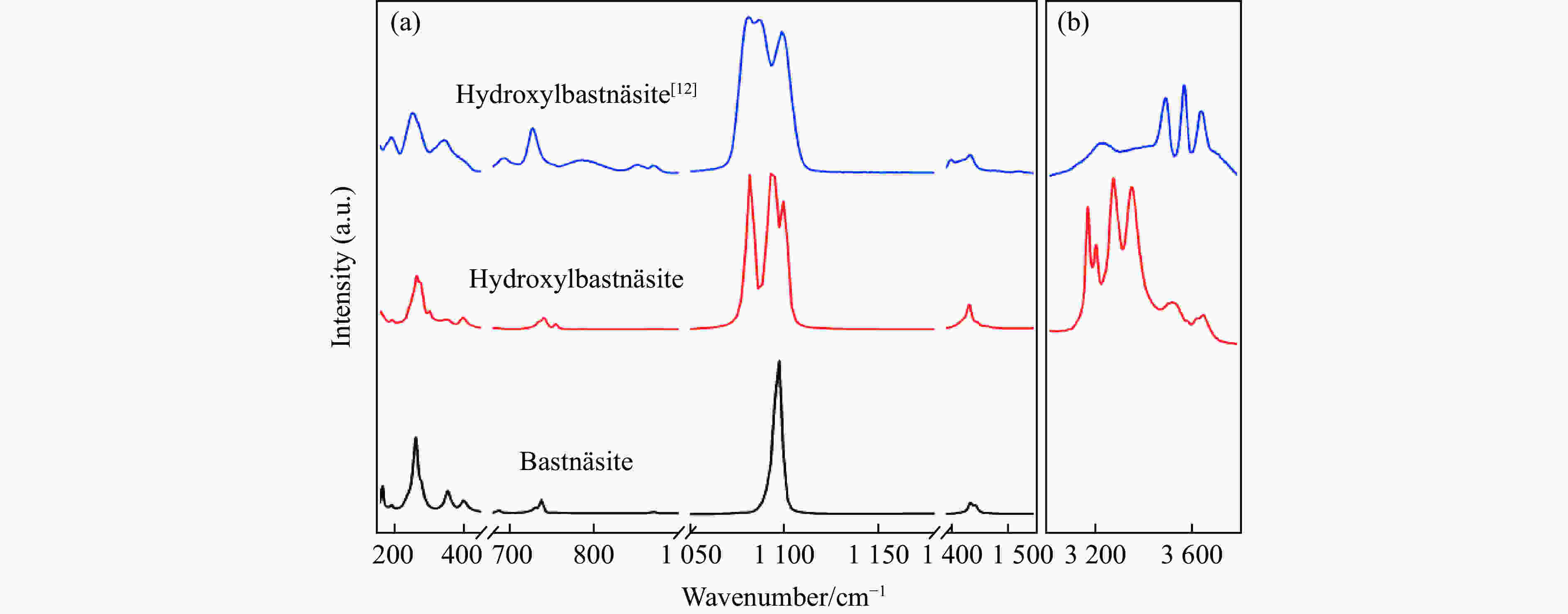Figure  1.  Raman spectra of hydroxylbastnäsite-(Ce) at ambient conditions (The solid blue line represents the data for the hydroxylbastnäsite-(Ce) in the RRUFF database[12]; the solid red line represents the hydroxylbastnäsite-(Ce) data measured in this experimental sample; the solid black line represents the data for bastnäsite.)