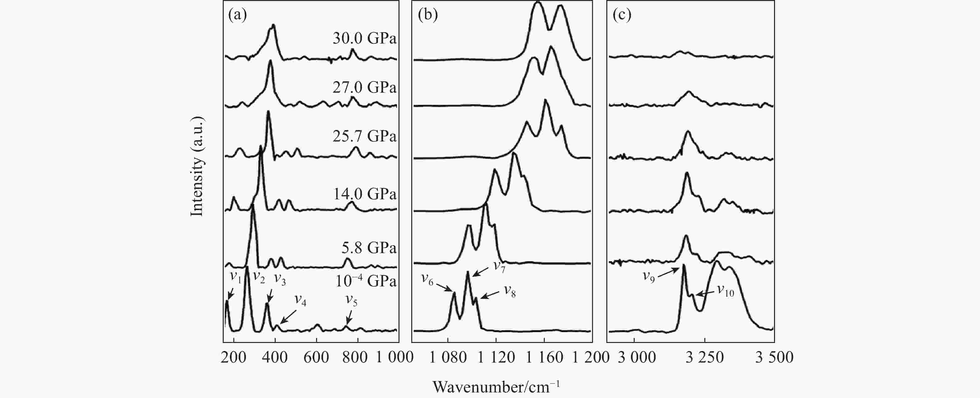 图  高压下羟碳铈矿的代表性拉曼光谱(压力范围0~30 GPa)