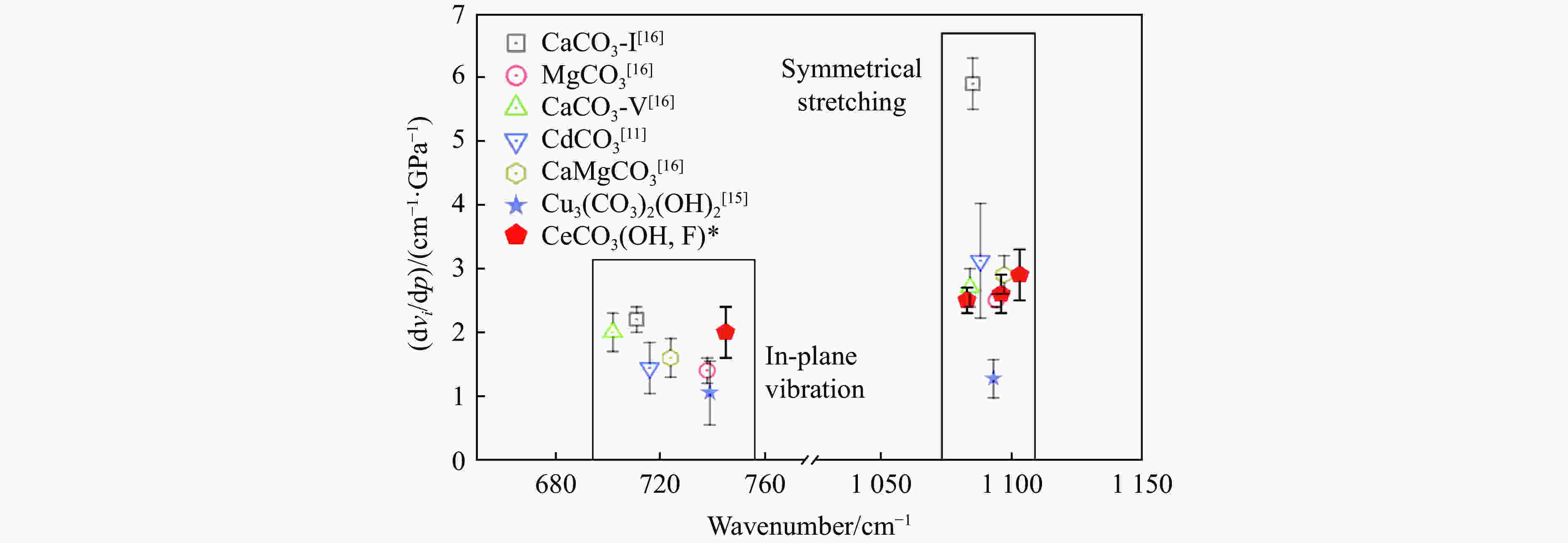 Figure  4.  dνi/dp of [CO3]2– in carbonate minerals (The open symbols represent several common anhydrous carbonates, the solid symbols represent aqueous carbonates, and * represents the experimental data.)