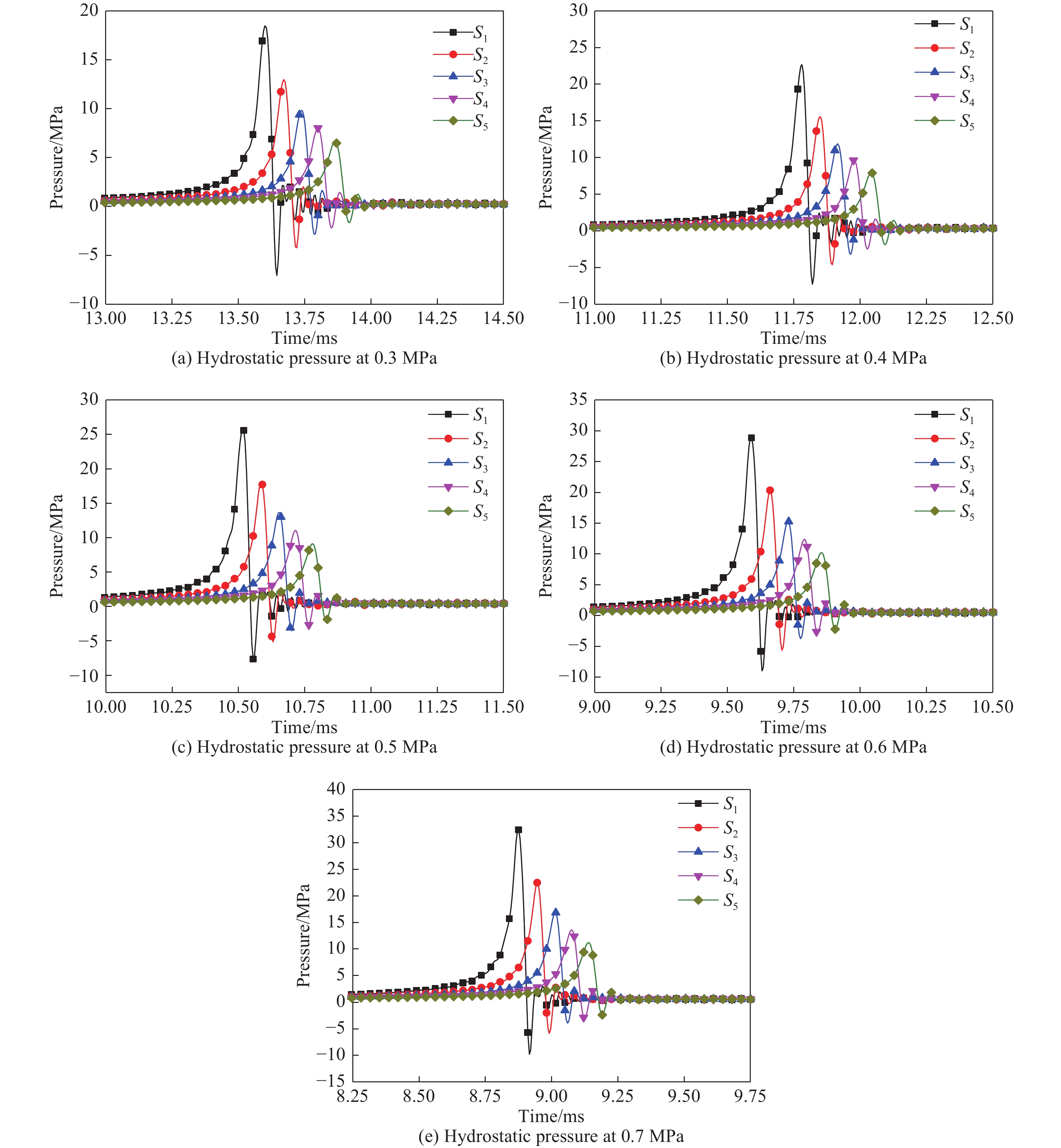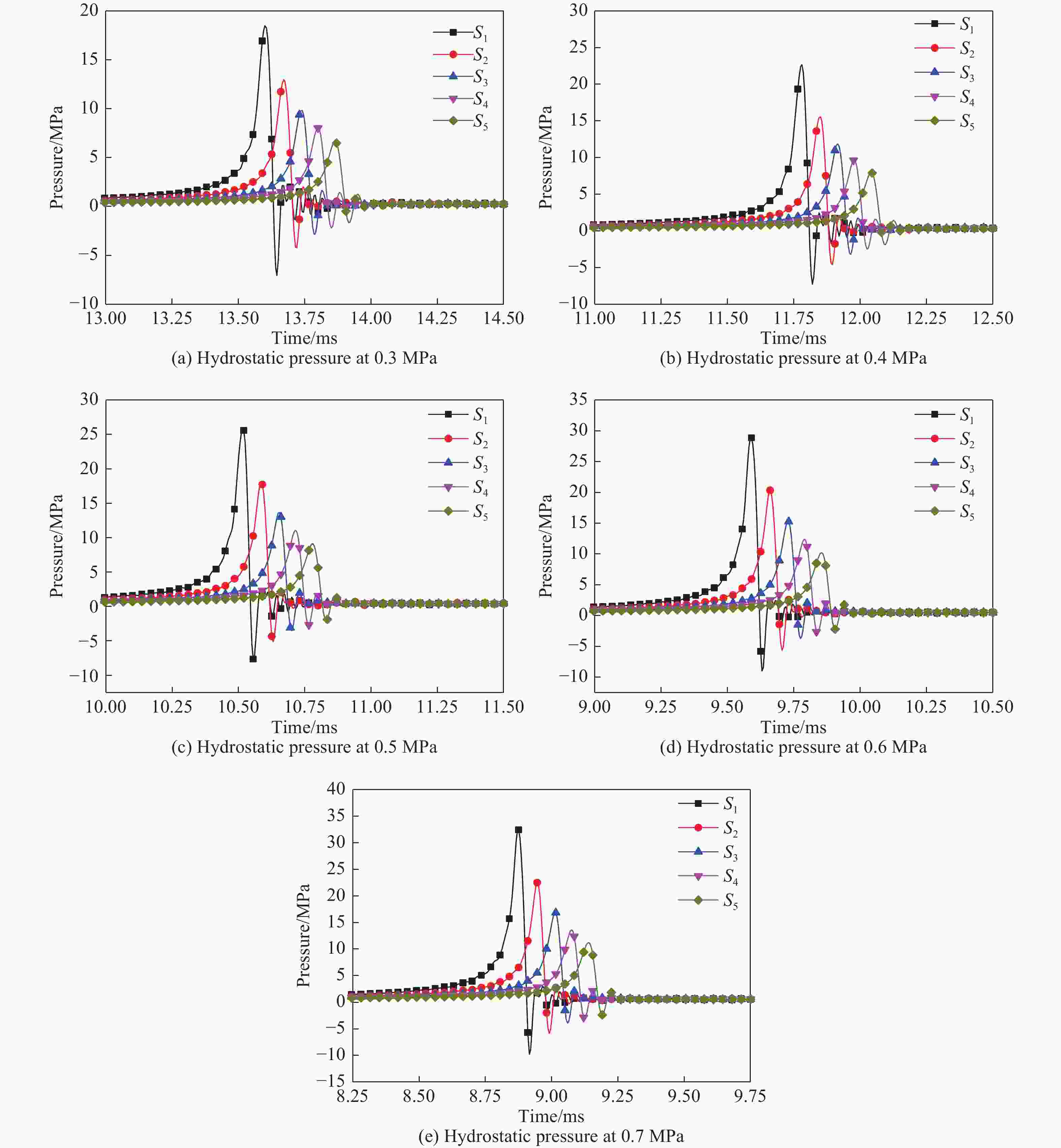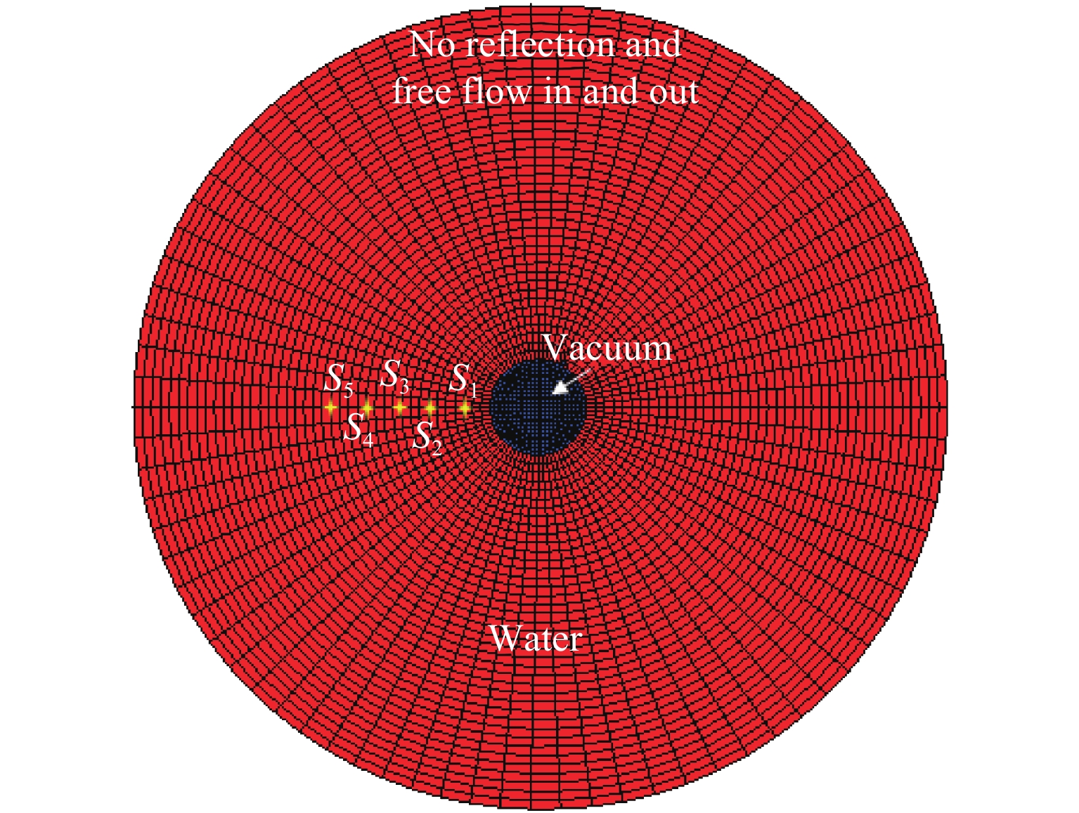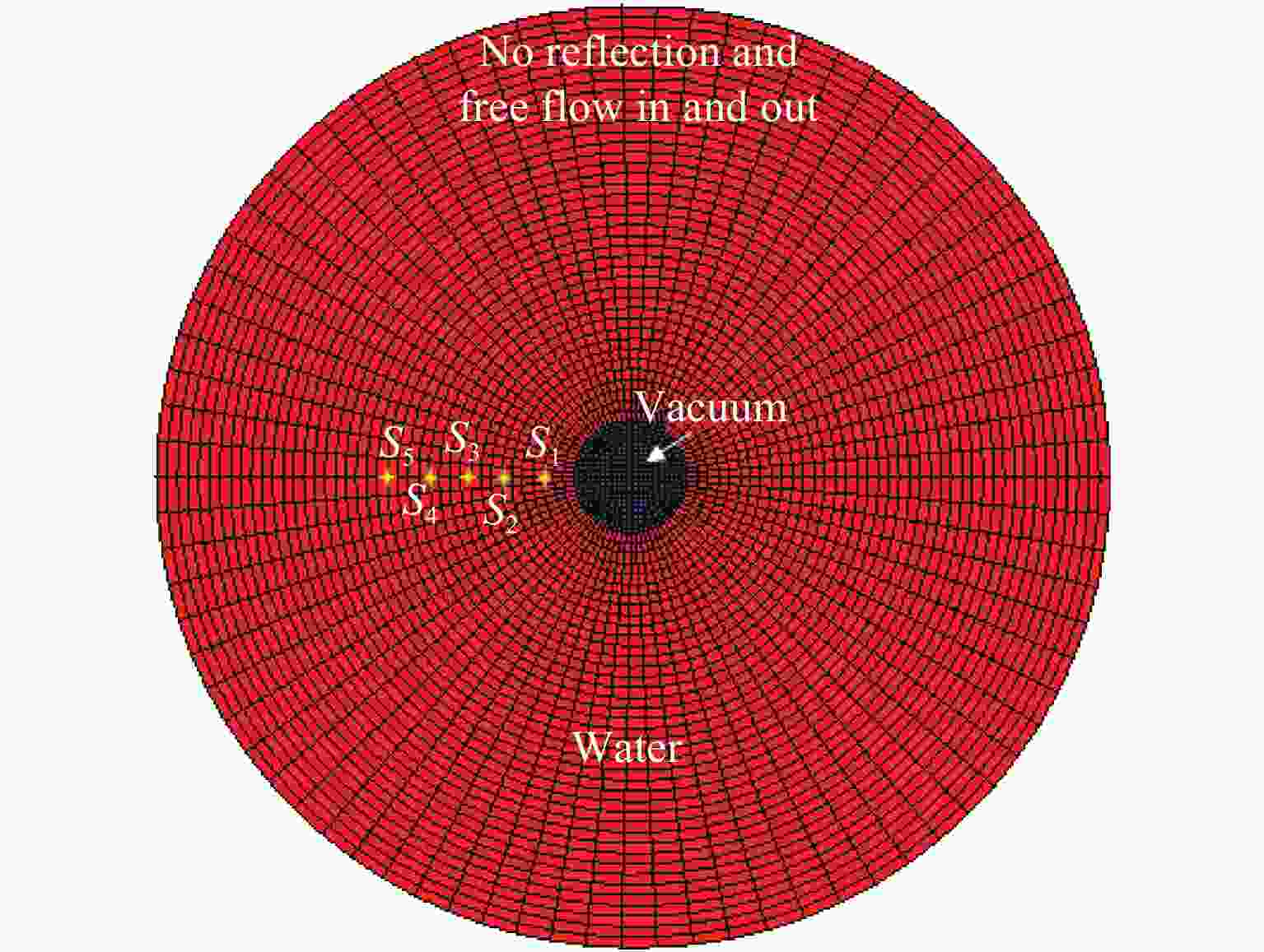 摘要: 在深水中工作的中空结构物承受巨大的静水压,突然被压溃时会发生内爆,产生冲击波,对周围结构造成损伤。针对内爆冲击波受静水压力、真空体积影响机理不清的问题,开展了光电倍增管水下内爆试验,验证了ABAQUS中CEL耦合计算方法满足光电倍增管内爆模拟精度的要求,并通过数值模拟分析了外界静水压、中空结构物的真空体积对内爆冲击波的影响规律。结果表明:随着静水压、真空体积的增加,冲击波压力峰值呈线性增加,且距离内爆中心越远,冲击波峰值增加越缓慢;冲击波脉宽随静水压力的增加基本保持不变,随真空半径的增加缓慢降低。Abstract: The hollow structure working in deep water is subjected to huge hydrostatic pressure. When it is suddenly crushed, it will explode and generate shock waves, and cause damages to the surrounding structure. Aiming at the problem that the implosion shock wave is affected unclearly by hydrostatic pressure and vacuum volume, the underwater implosion test of photomultiplier tube (PMT) was carried out. It was verified that the CEL coupling calculation method in ABAQUS satisfies the requirements of PMT implosion simulation accuracy, and then the effects of external hydrostatic pressure and vacuum volume of hollow structures on implosion shock waves were analyzed by simulation. The results show that with the increase of hydrostatic pressure and vacuum volume, the peak value of the shock wave increases linearly, and the farther away from the implosion center, the slower the increase of peak value of the shock wave. The pulse width of the shock wave remains basically unchanged with the increase of hydrostatic pressure, and decreases slowly with the increase of vacuum radius.