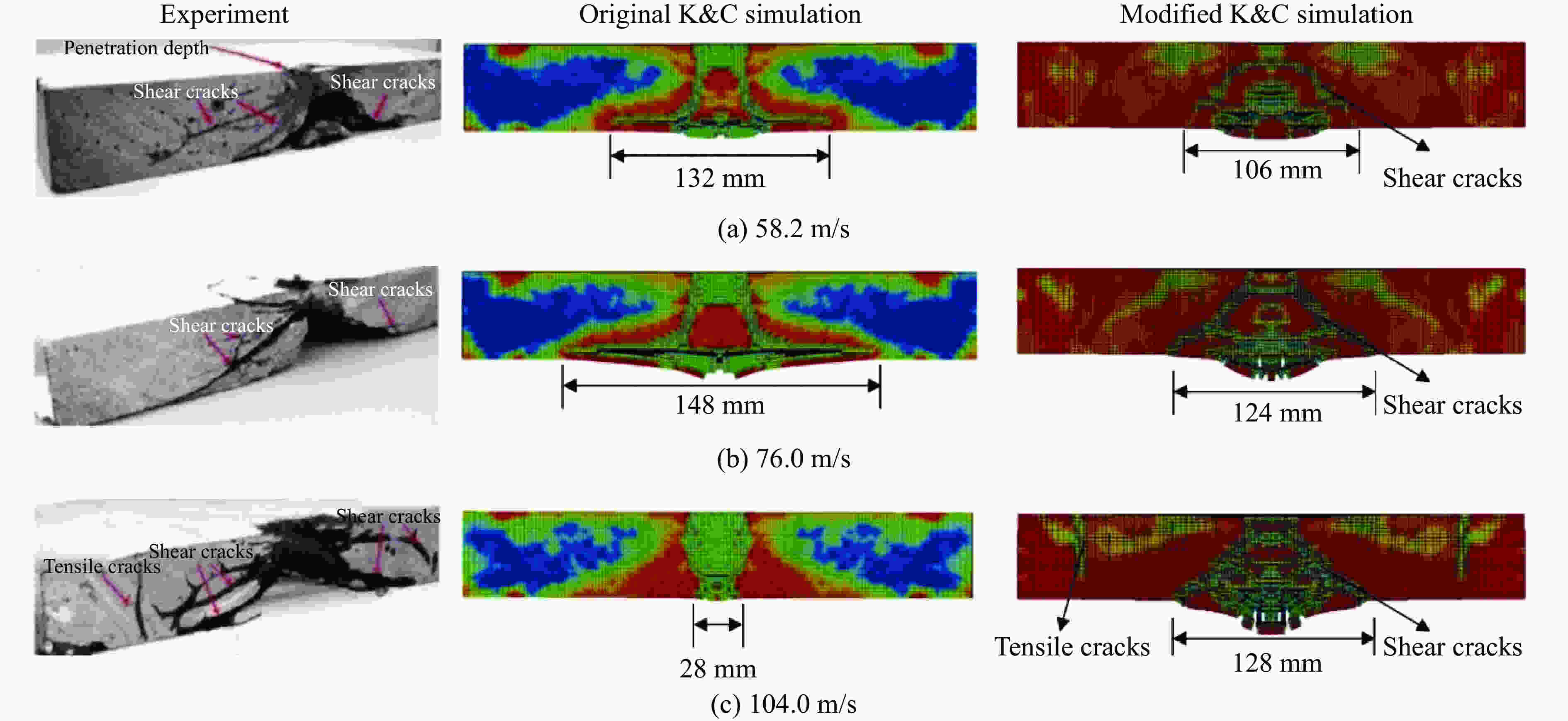 Projectile velocity/(m·s−1) Scabbed crater diameter/mm Model error/% Experiment Original K&C Modified K&C Original K&C Modified K&C 58.2 120.5 132 106 9.5 12.0 76.0 119.2 148 124 24.2 4.0 104.0 120.3 28 128 76.7 6.4 -