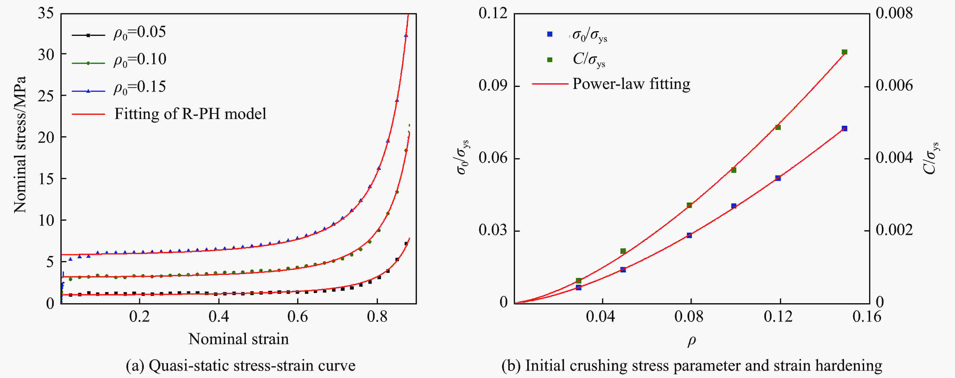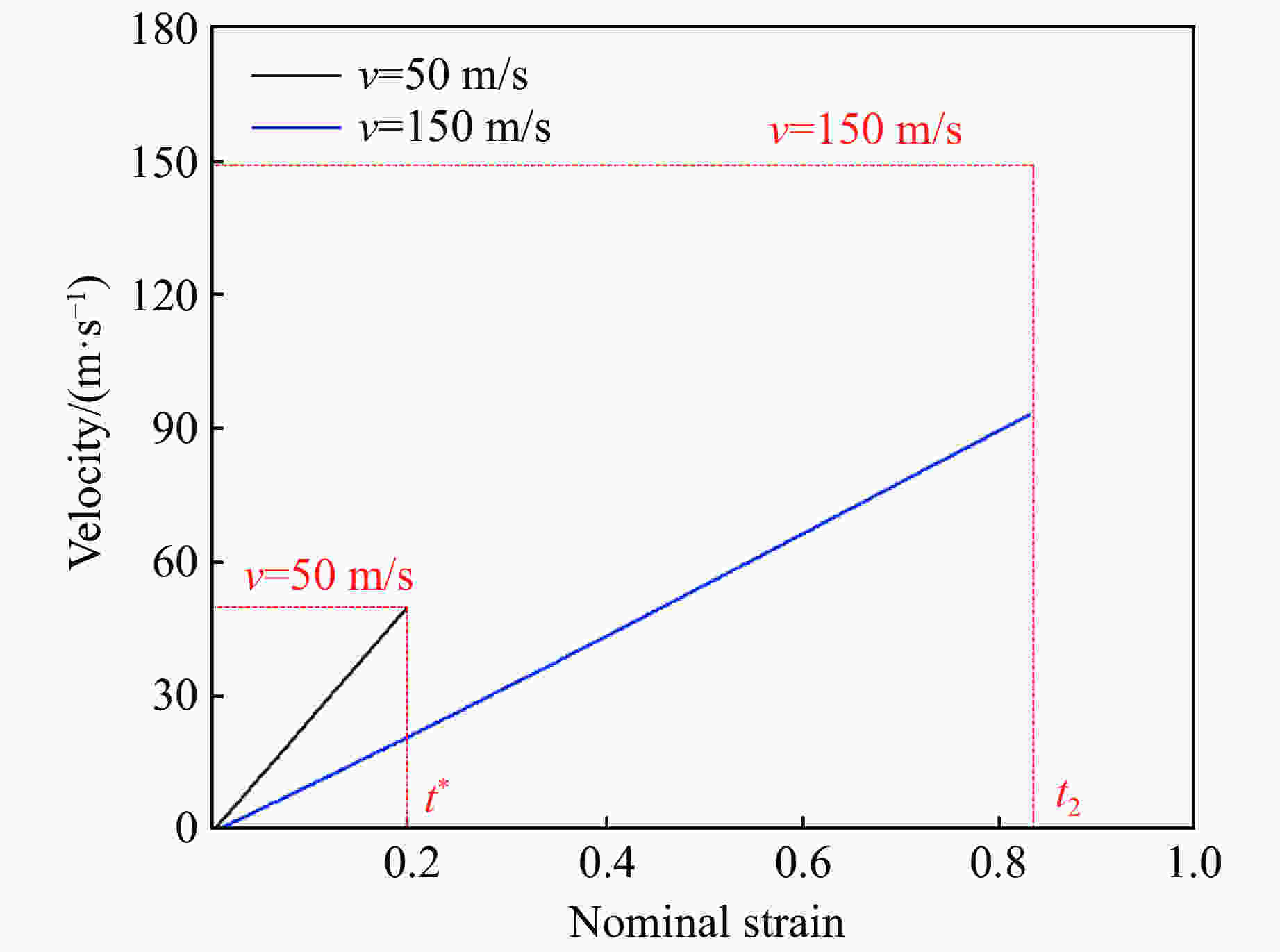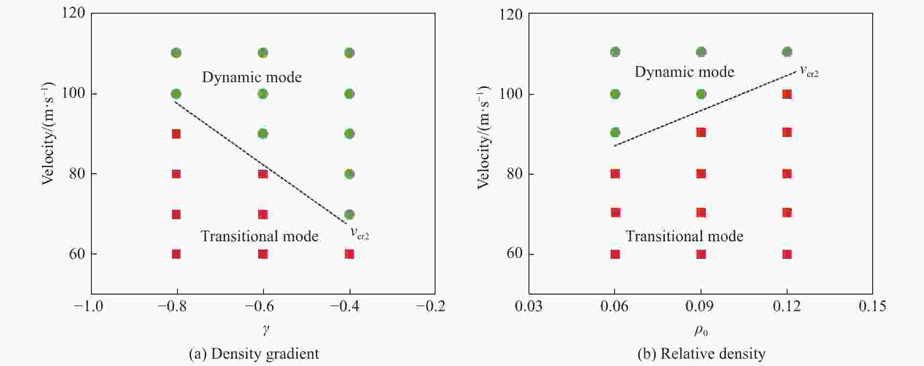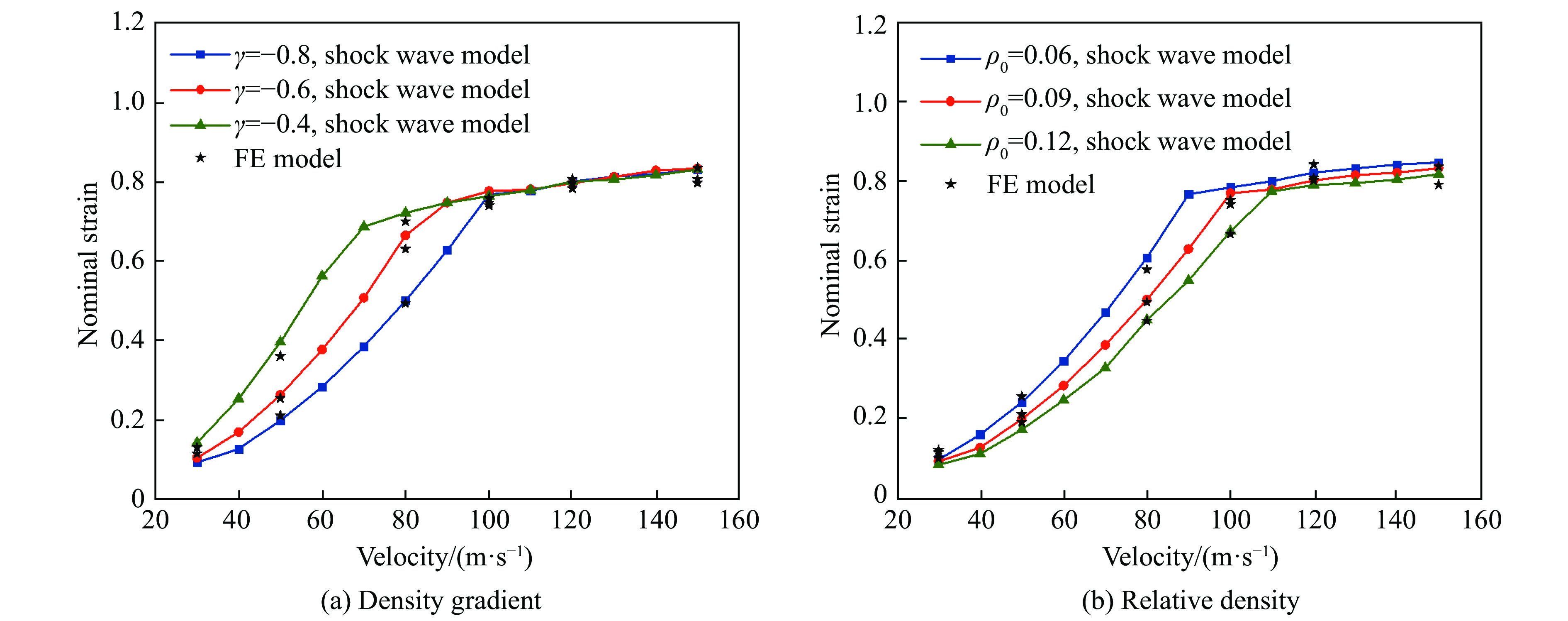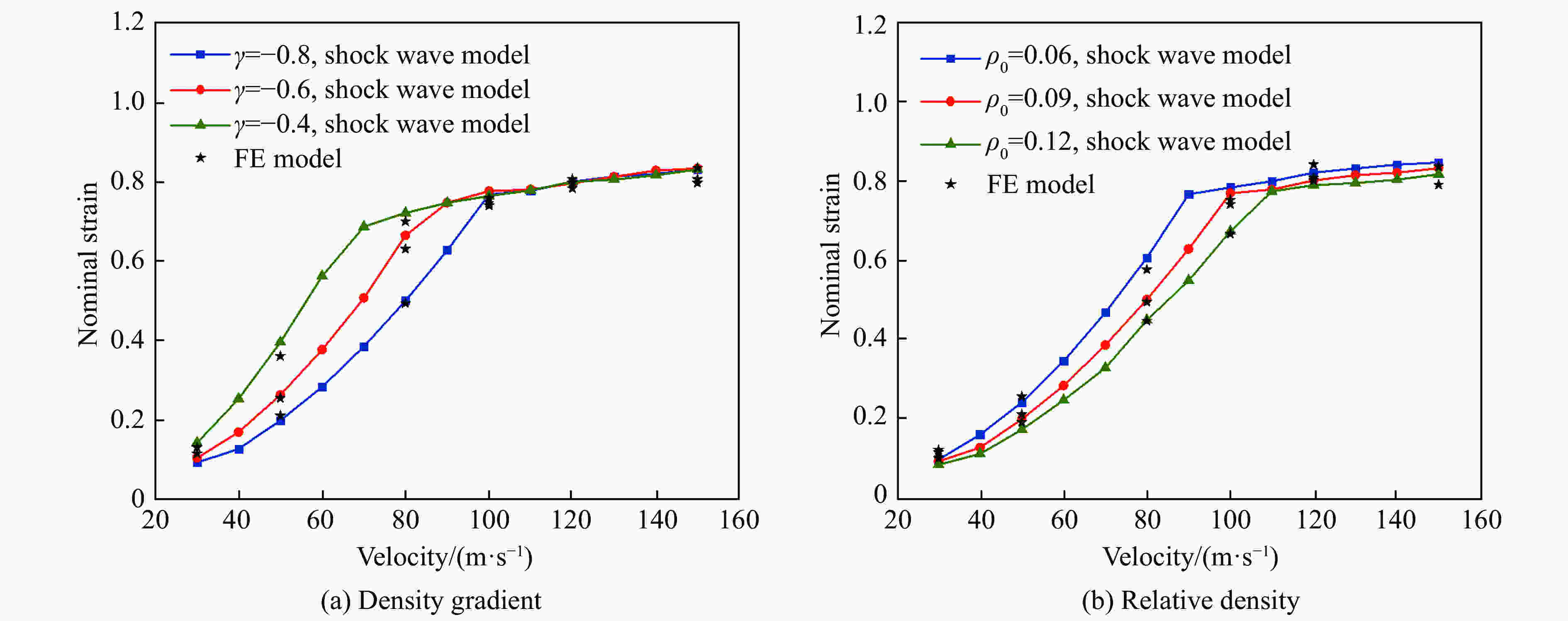 摘要: 基于一维非线性的刚性-塑性硬化模型,研究了在恒速冲击作用下负梯度泡沫的冲击波控制方程和传播特性。采用LS-DYNA有限元软件对三维随机Voronoi技术生成的梯度泡沫金属模型进行数值模拟,验证了理论预测,并定义了冲击波模型下梯度泡沫材料的局部密实化应变与第二临界速度。通过对冲击速度、密度梯度、相对密度参数的影响研究发现:冲击波模型的理论解与有限元模型的数值解吻合较好,基于R-PH模型的冲击波理论能较好地预测负梯度泡沫金属的力学性能;局部密实化应变在不同冲击速度下存在3个增长阶段;密度梯度绝对值和相对密度越大,局部密实化应变越小,第二临界速度越大。最后讨论了负梯度泡沫中局部密实化现象对支撑端应力的影响。Abstract: Based on the one-dimensional nonlinear rigid-plastic hardening (R-PH) model, the control equations and mechanical response characteristics of the shock wave propagation of the negative graded foam under constant velocity impact are studied. The LS-DYNA finite element software is used to numerically simulate the graded metal foam model generated by the three-dimensional stochastic Voronoi technology to verify the theoretical prediction. The local densification strain and the second critical velocity of the graded foam material under the shock wave model are defined. By studying the effects of impact velocity, density gradient and relative density parameters, it is found that the theoretical solution of the shock wave model is in good agreement with the numerical solution of the finite element model. The shock wave theory based on the R-PH model can better predict the negative graded foam metal. The mechanical properties of the local densification strain have three growth stages at different impact velocities; the larger the absolute value of the density gradient and the relative density, the smaller the local densification strain and the larger the second critical velocity. Finally, the effect of local densification on the stress at the support end in the negative graded foam is explained.
