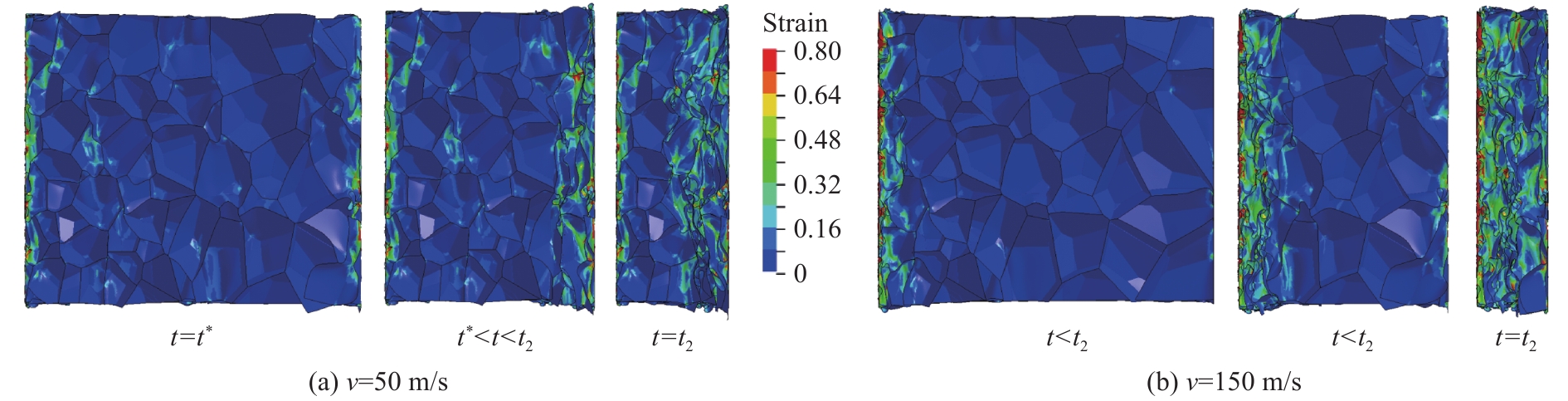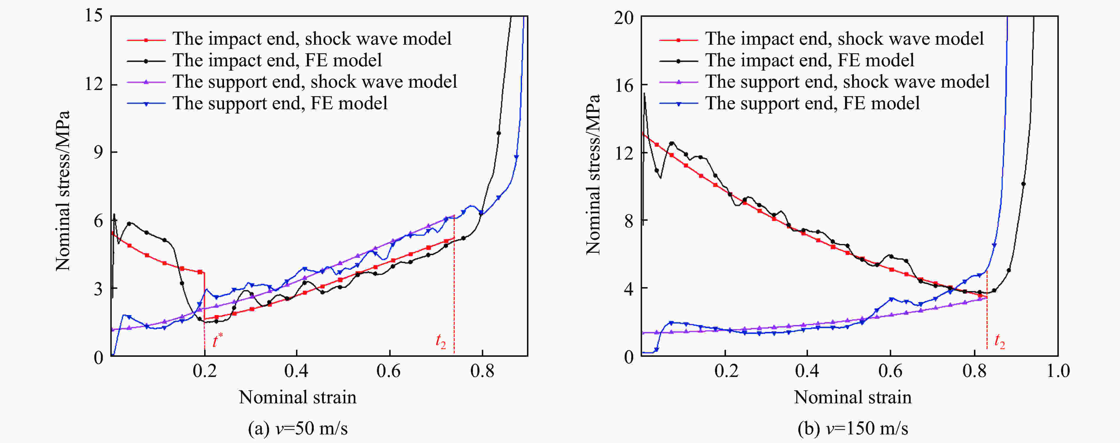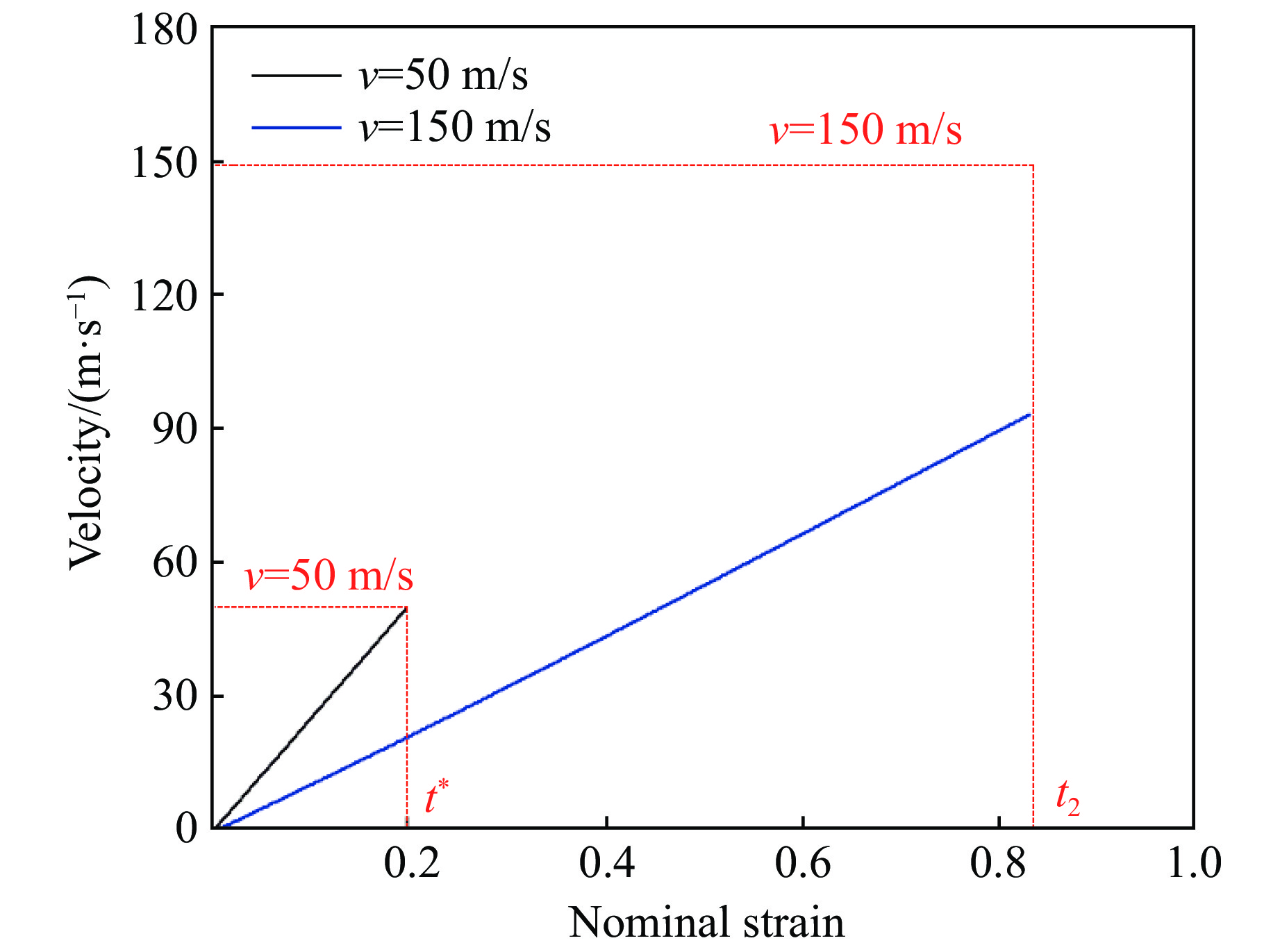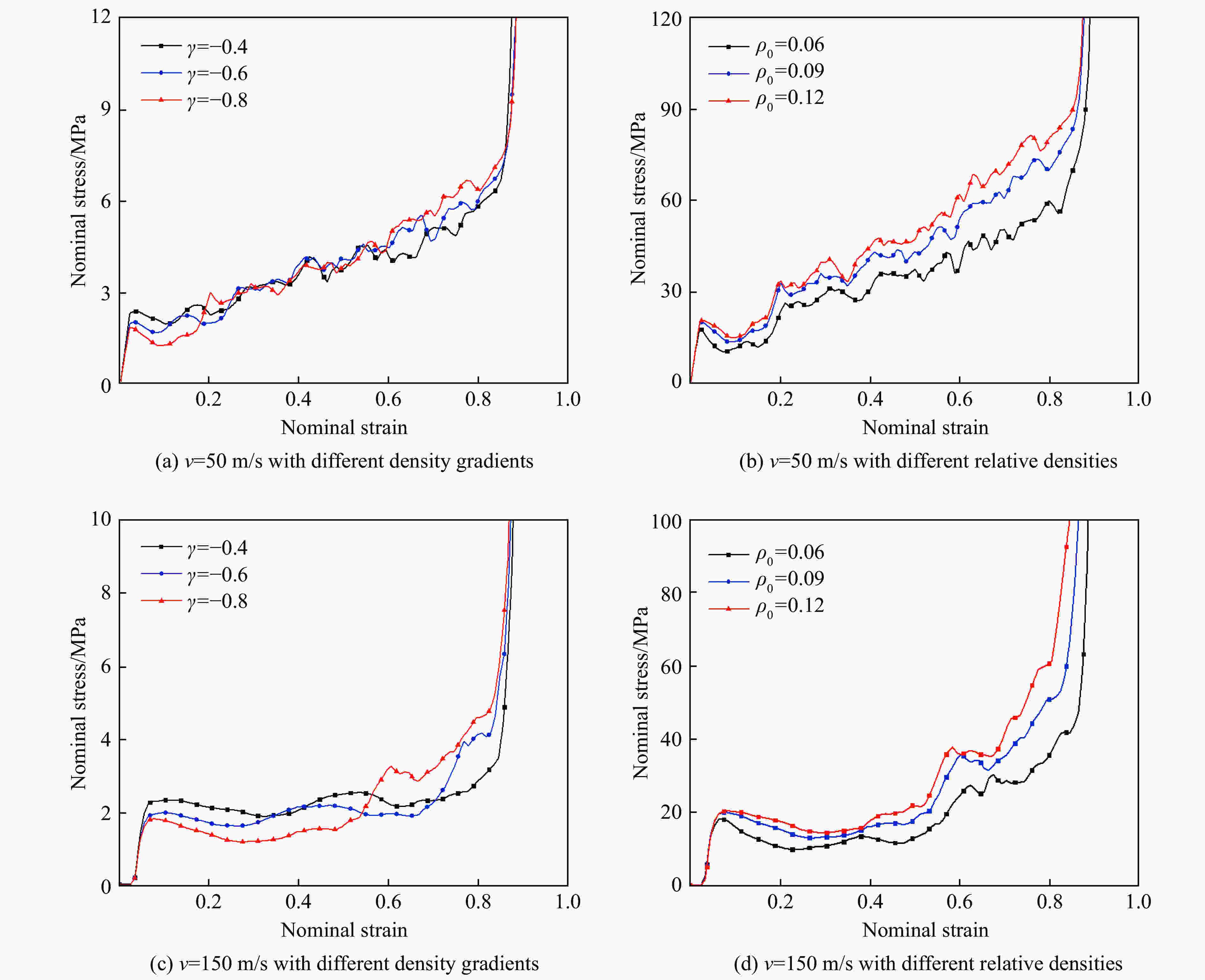 摘要: 基于一维非线性的刚性-塑性硬化模型,研究了在恒速冲击作用下负梯度泡沫的冲击波控制方程和传播特性。采用LS-DYNA有限元软件对三维随机Voronoi技术生成的梯度泡沫金属模型进行数值模拟,验证了理论预测,并定义了冲击波模型下梯度泡沫材料的局部密实化应变与第二临界速度。通过对冲击速度、密度梯度、相对密度参数的影响研究发现:冲击波模型的理论解与有限元模型的数值解吻合较好,基于R-PH模型的冲击波理论能较好地预测负梯度泡沫金属的力学性能;局部密实化应变在不同冲击速度下存在3个增长阶段;密度梯度绝对值和相对密度越大,局部密实化应变越小,第二临界速度越大。最后讨论了负梯度泡沫中局部密实化现象对支撑端应力的影响。Abstract: Based on the one-dimensional nonlinear rigid-plastic hardening (R-PH) model, the control equations and mechanical response characteristics of the shock wave propagation of the negative graded foam under constant velocity impact are studied. The LS-DYNA finite element software is used to numerically simulate the graded metal foam model generated by the three-dimensional stochastic Voronoi technology to verify the theoretical prediction. The local densification strain and the second critical velocity of the graded foam material under the shock wave model are defined. By studying the effects of impact velocity, density gradient and relative density parameters, it is found that the theoretical solution of the shock wave model is in good agreement with the numerical solution of the finite element model. The shock wave theory based on the R-PH model can better predict the negative graded foam metal. The mechanical properties of the local densification strain have three growth stages at different impact velocities; the larger the absolute value of the density gradient and the relative density, the smaller the local densification strain and the larger the second critical velocity. Finally, the effect of local densification on the stress at the support end in the negative graded foam is explained.