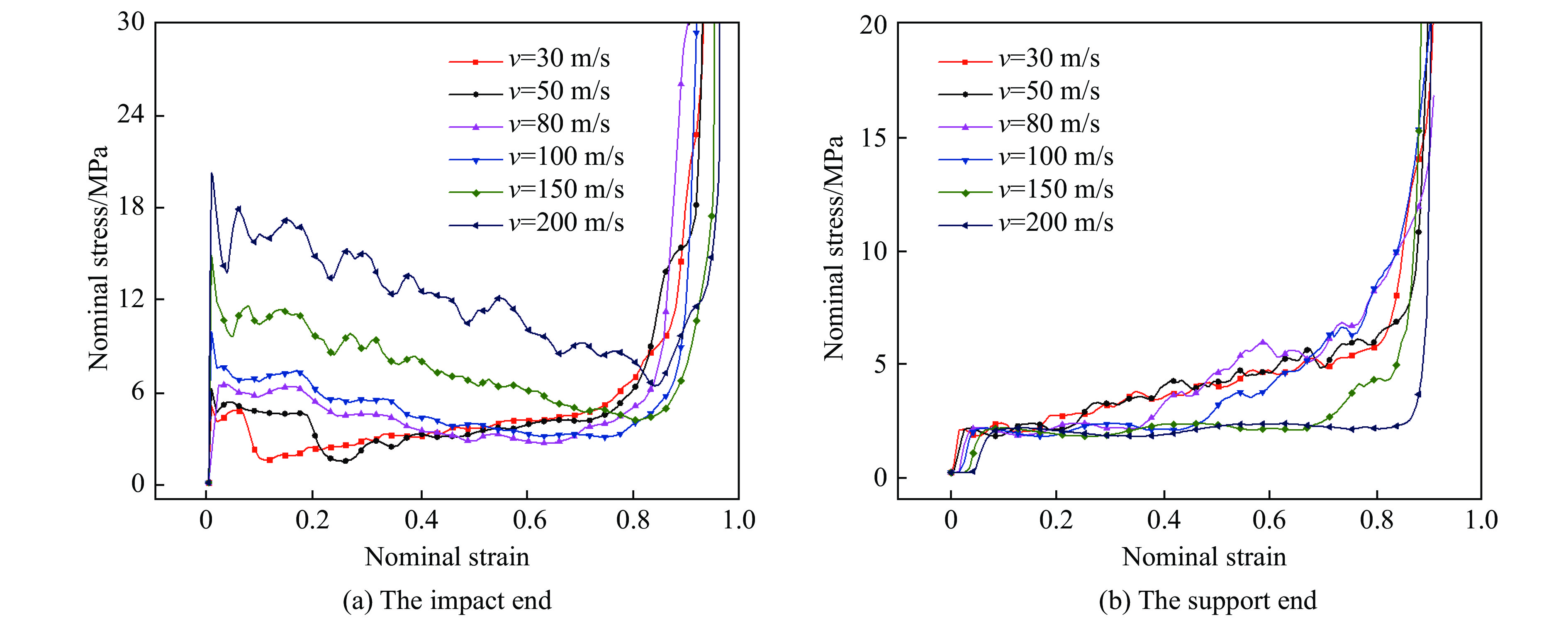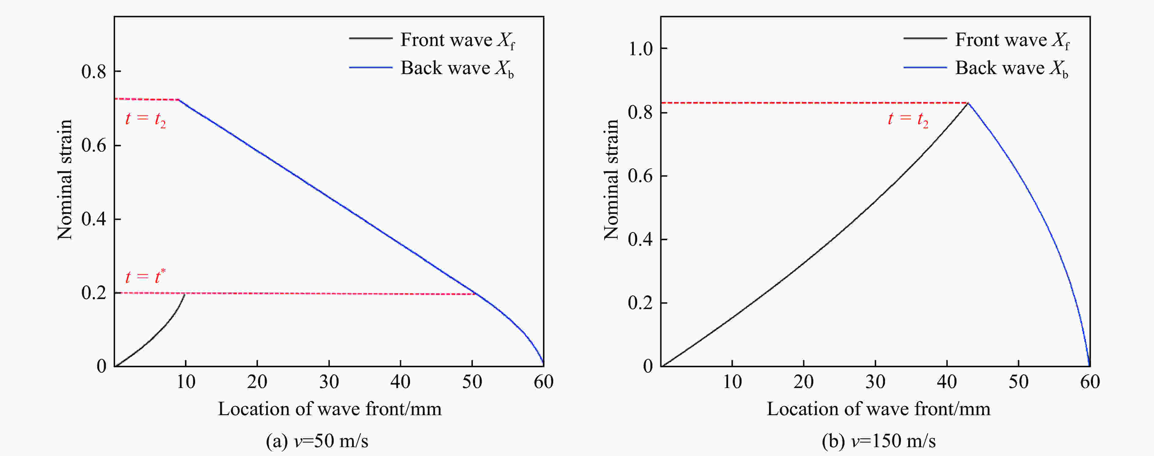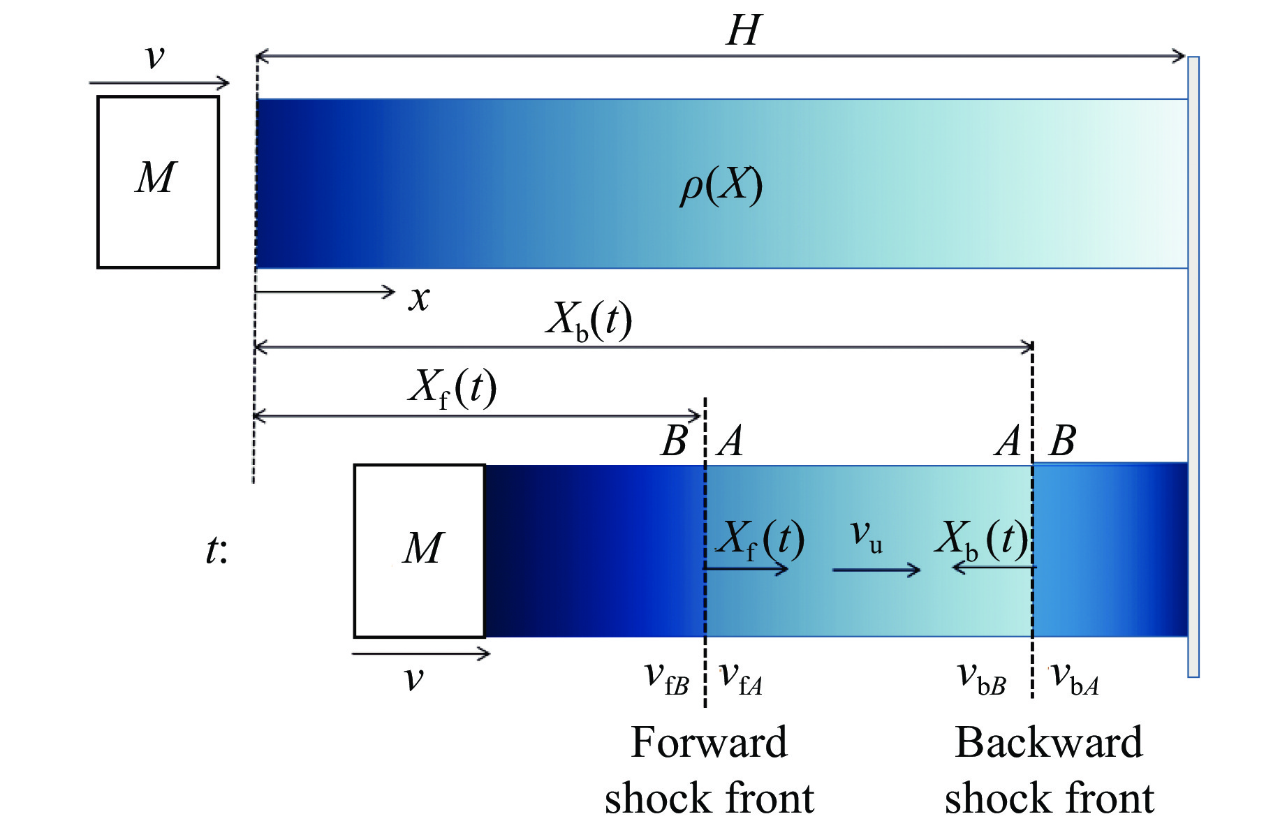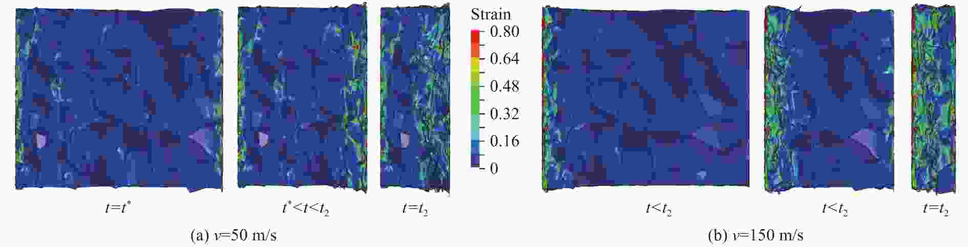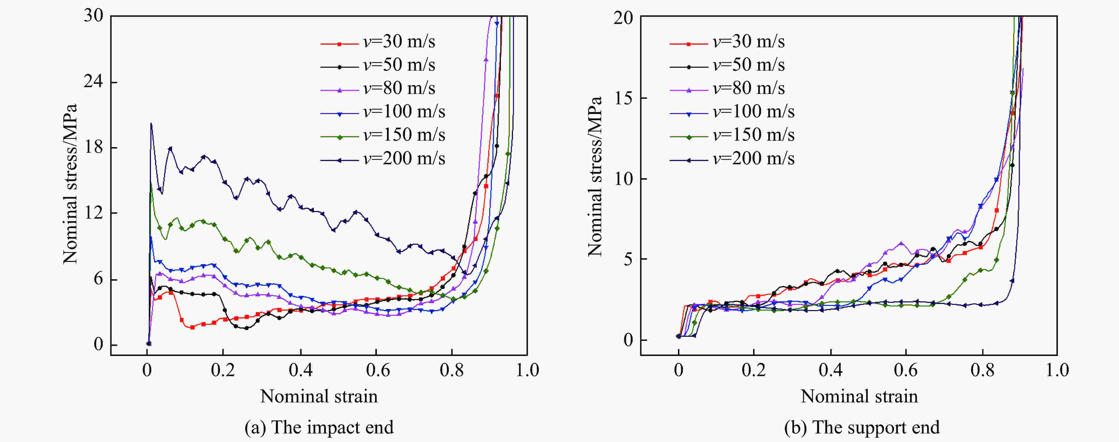 摘要: 基于一维非线性的刚性-塑性硬化模型,研究了在恒速冲击作用下负梯度泡沫的冲击波控制方程和传播特性。采用LS-DYNA有限元软件对三维随机Voronoi技术生成的梯度泡沫金属模型进行数值模拟,验证了理论预测,并定义了冲击波模型下梯度泡沫材料的局部密实化应变与第二临界速度。通过对冲击速度、密度梯度、相对密度参数的影响研究发现:冲击波模型的理论解与有限元模型的数值解吻合较好,基于R-PH模型的冲击波理论能较好地预测负梯度泡沫金属的力学性能;局部密实化应变在不同冲击速度下存在3个增长阶段;密度梯度绝对值和相对密度越大,局部密实化应变越小,第二临界速度越大。最后讨论了负梯度泡沫中局部密实化现象对支撑端应力的影响。Abstract: Based on the one-dimensional nonlinear rigid-plastic hardening (R-PH) model, the control equations and mechanical response characteristics of the shock wave propagation of the negative graded foam under constant velocity impact are studied. The LS-DYNA finite element software is used to numerically simulate the graded metal foam model generated by the three-dimensional stochastic Voronoi technology to verify the theoretical prediction. The local densification strain and the second critical velocity of the graded foam material under the shock wave model are defined. By studying the effects of impact velocity, density gradient and relative density parameters, it is found that the theoretical solution of the shock wave model is in good agreement with the numerical solution of the finite element model. The shock wave theory based on the R-PH model can better predict the negative graded foam metal. The mechanical properties of the local densification strain have three growth stages at different impact velocities; the larger the absolute value of the density gradient and the relative density, the smaller the local densification strain and the larger the second critical velocity. Finally, the effect of local densification on the stress at the support end in the negative graded foam is explained.