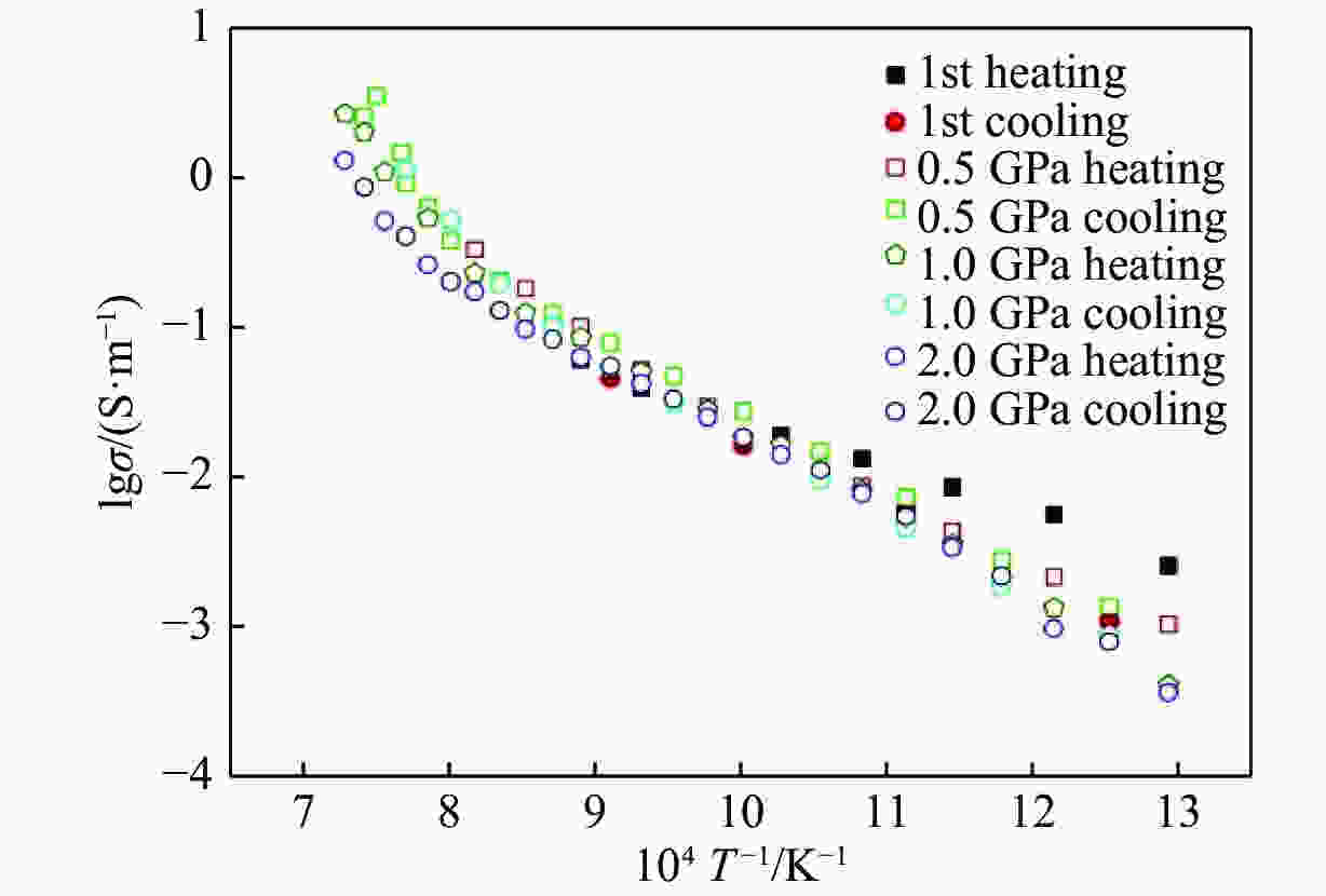 p/GPa T/K lg $\sigma $0/(S·m−1) ΔH/eV 0.5 773-1 223 3.53 ± 0.08 1.01 ± 0.01 1 223-1 373 11.66 ± 1.00 2.97 ± 0.26 1.0 773-1 223 3.82 ± 0.09 1.09 ± 0.02 1 223-1 373 8.38 ± 0.63 2.16 ± 0.16 2.0 773-1 223 3.64 ± 0.09 1.06 ± 0.02 1 223-1 373 8.22 ± 0.59 2.21 ± 0.13 -