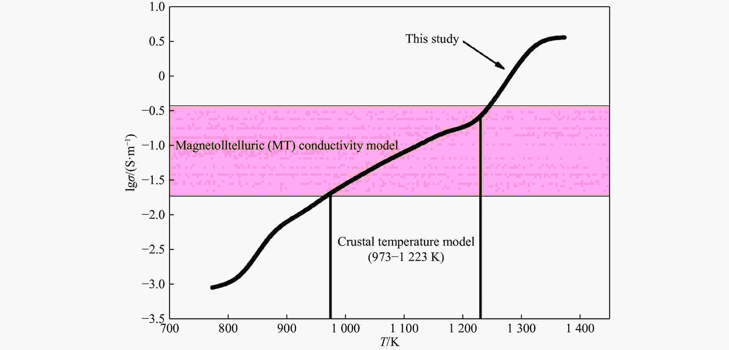 摘要: 大地电磁测深结果显示青藏高原中上地壳存在高导层,而花岗岩是地壳岩石的主要组成部分,在地壳演化过程中发挥着重要作用。在高温高压下开展花岗岩部分熔融时电导率实验对认识青藏高原地壳电性结构及地壳演化过程具有重要意义。在0.5~2.0 GPa压力、773~1 373 K温度条件下测量花岗岩的电导率。实验结果表明:在温度为773~1 223 K时,样品的活化焓为1.01~1.09 eV;在温度为1 223~1 373 K时,样品的活化焓为2.16~2.97 eV。不同温度段内活化焓的变化可能与花岗岩样品中黑云母的脱水熔融有关,推断花岗岩部分熔融时导电机制为离子导电,Na+起主导作用。将实验测得的电导率与西藏高导层地壳温度背景结合发现:在973~1 223 K范围内实验电导率值在0.016~0.310 S/m范围内,与大地电磁测深数据吻合较好,表明西藏地壳高导层的成因与花岗岩部分熔融关系较为密切。Abstract: Magnetotelluric (MT) surveys reveal that high conductivity layer appear in the upper crust beneath Tibet. Granite is the main rocks composed of upper crust, playing an important role in the process of crustal evolution. Electrical conductivity of granite during partial melting is of great significance to understanding the conductivity structure of Tibetan Plateau crust and the crustal evolution process. Electrical conductivity of granite collected from the Tibet was conducted under the conditions of 0.5-2.0 GPa and 773-1 373 K. The activation enthalpies of 1.01-1.09 eV and 2.16-2.97 eV are derived from 773 to 1 223 K and from 1 223 to 1 373 K, respectively. The change of activation enthalpy in different temperature zones may be related to the partial melting of granite induced by the biotite dehydration. Combining the experimental results and geothermal gradient of Tibet, we found that the experimental conductivity values fell between 0.016 S/m and 0.310 S/m in the temperature range of 973-1 223 K, which was in good agreement with the magnetotelluric sounding data. This may indicate that there is a close relationship between the genesis of the high conductivity layer and the partial melting of granite.