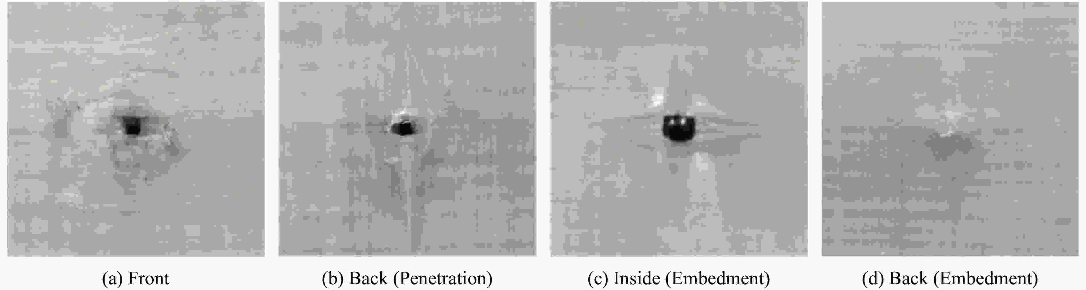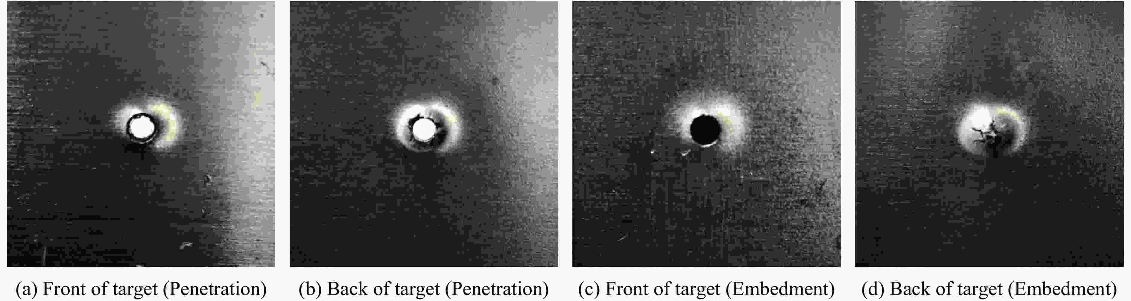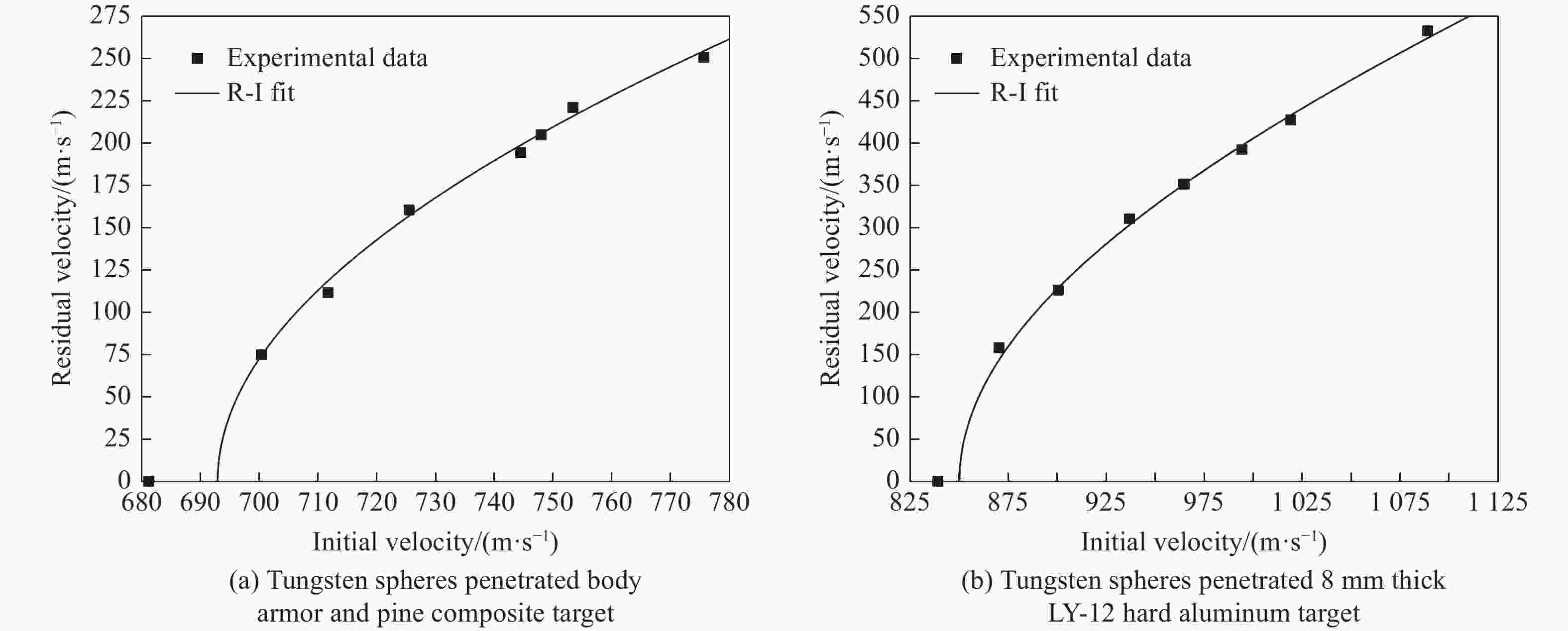 Type of tungsten sphere Target type Ballistic limit/(m·s−1) Relative error/% 0.21 g, $ \varnothing $2.8 mm Body armor + Pine composite target 692.9 1.8 6.2 mm thick LY-12 hard aluminum target 705.2 0.17 g, $ \varnothing $2.6 mm Body armor + Pine composite target 742.3 2.2 6.2 mm thick LY-12 hard aluminum target 758.7 表 5 确定弹道极限的主要物理量