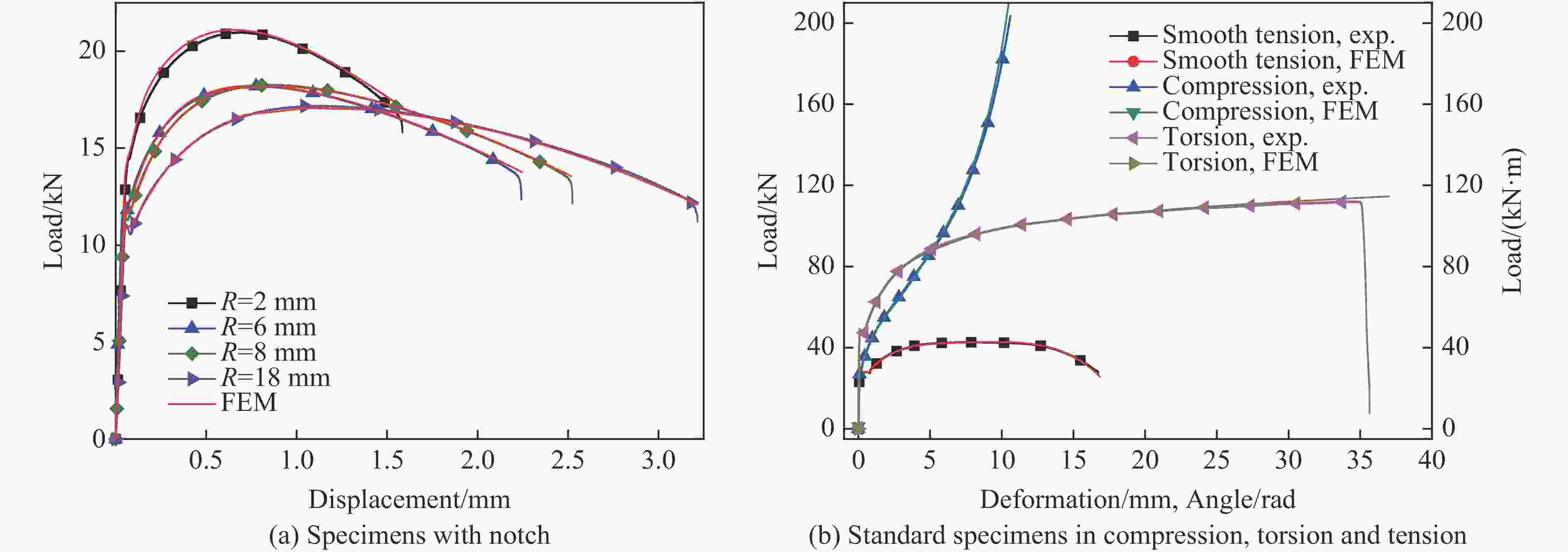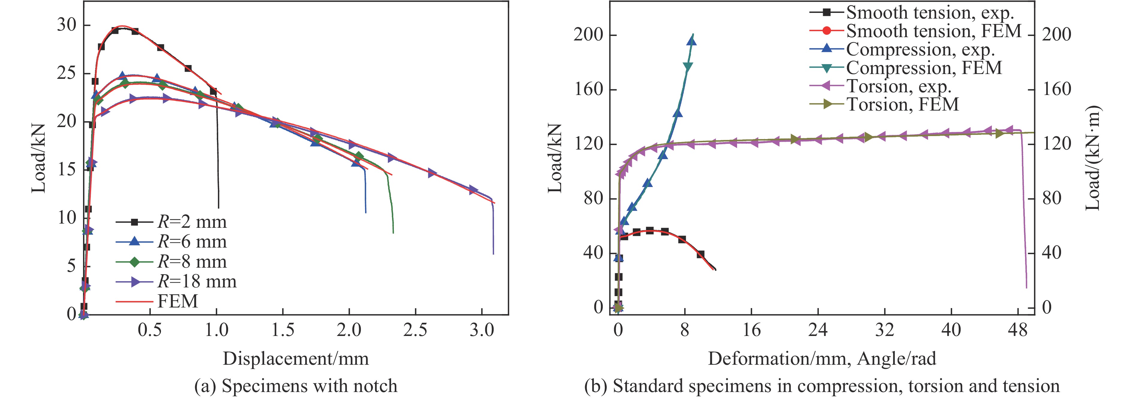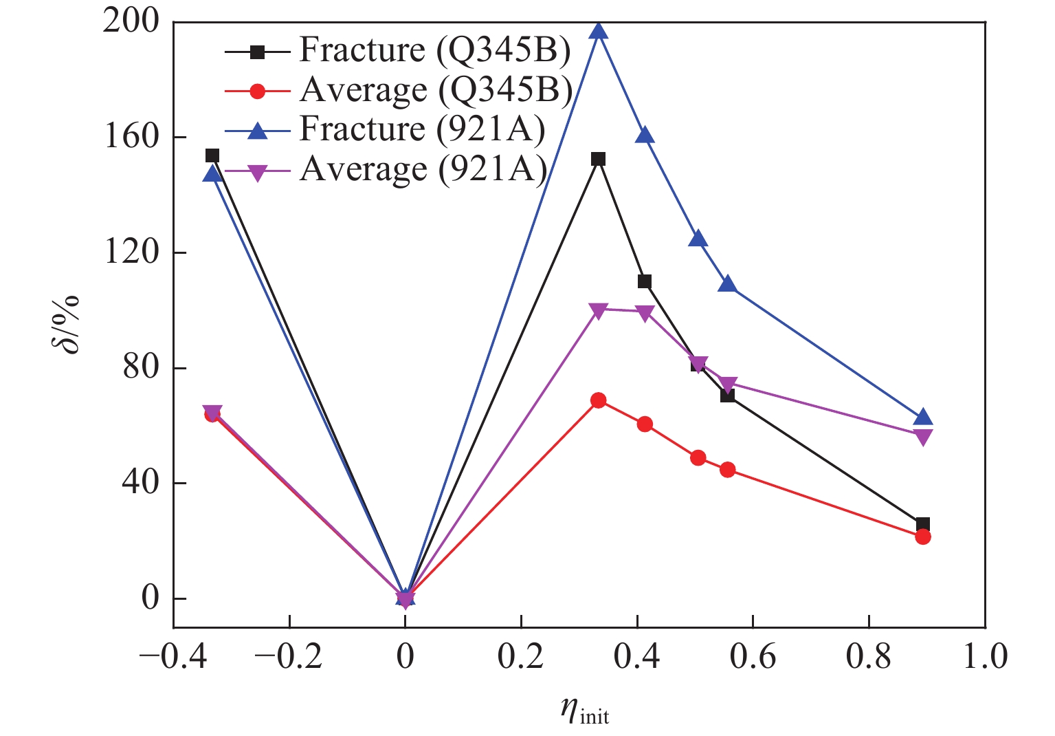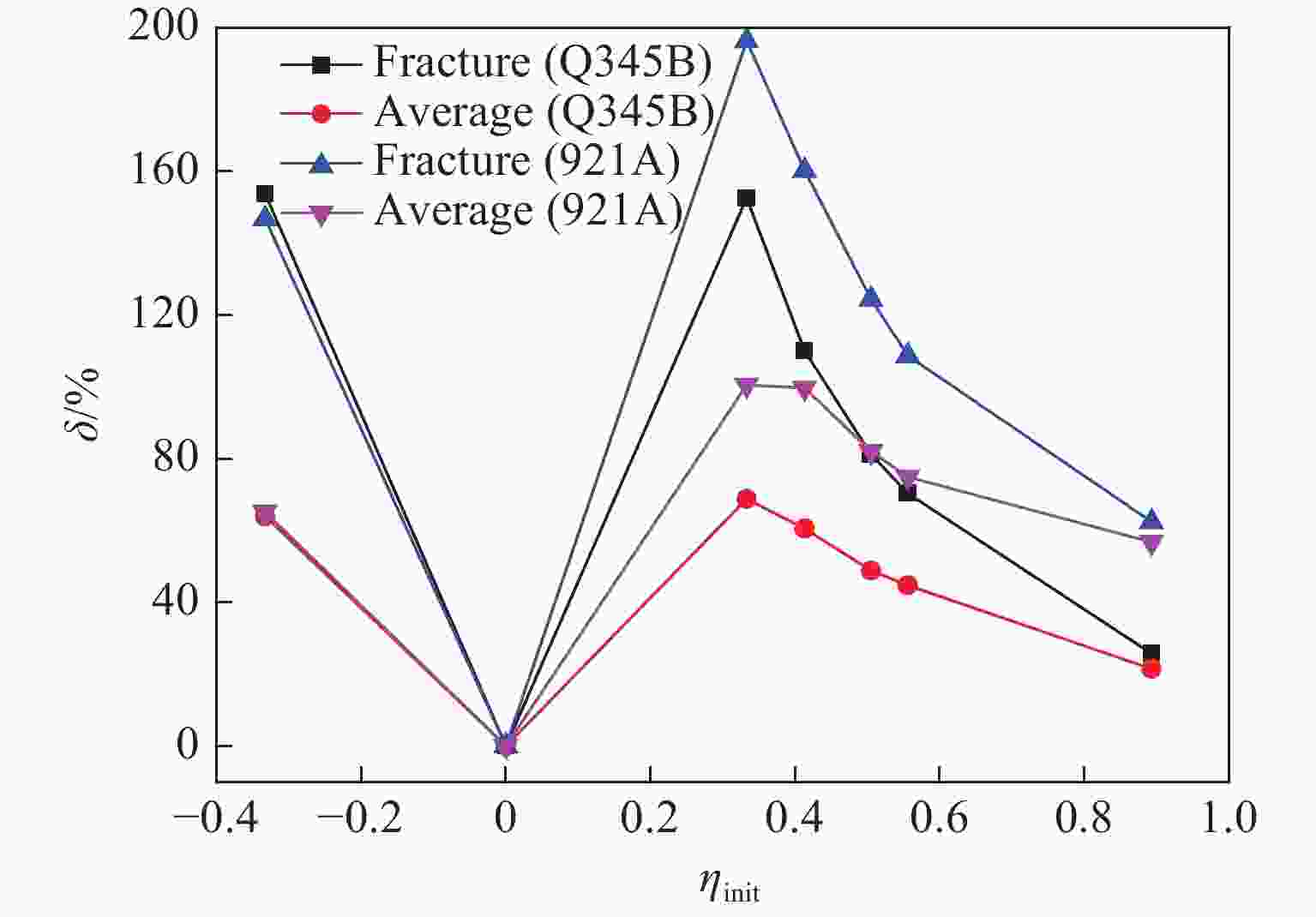 Specimen type Stress triaxiality (Q345B steel) Stress triaxiality (921A steel) Initial Fracture Average Initial Fracture Average Compression −0.333 0.179 −0.120 −0.333 0.156 −0.116 Torsion 0 0 0 0 0 0 Smooth tension 0.333 0.841 0.562 0.333 0.987 0.668 With a 18 mm notch 0.413 0.867 0.663 0.413 1.075 0.825 With a 8 mm notch 0.505 0.915 0.752 0.505 1.133 0.919 With a 6 mm notch 0.556 0.947 0.805 0.556 1.160 0.973 With a 2 mm notch 0.893 1.123 1.085 0.893 1.451 1.400 表 3 各类试件Lode参数不同表征方法对比