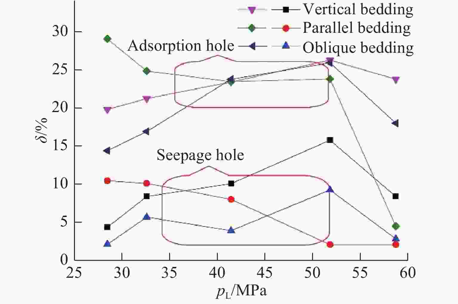摘要: 为了揭示冲击荷载对无烟煤微观孔隙结构的影响规律,利用分离式霍普金森压杆(SHPB)冲击实验系统模拟了冲击应力在不同衰减过程中的冲击波和应力波,基于冲击前后压汞实验及低温液氮实验测试数据,运用分形理论,研究了赵固二矿不同方向煤体(与层理方向分别呈垂直、平行、45°斜交)冲击前后孔隙结构的分形特征。结果表明:对于渗流孔,冲击荷载提高了瓦斯的渗流与运移速度,对于吸附孔,冲击荷载减小了吸附孔的吸附能力,促进了瓦斯的解吸;分形维数具有明显的冲击方向性,且吸附孔的分形维数明显小于渗流孔;不同方向无烟煤的最佳冲击荷载不同,垂直和斜交层理方向的最佳冲击荷载为51.80 MPa,平行层理方向的最佳冲击荷载为28.46 MPa。研究结果可为冲击荷载促进瓦斯抽采机理的探讨提供参考。Abstract: In order to reveal the influence of impact loading on the microscopic pore structure of anthracite, the shock and stress waves of the impact stress in different attenuation processes were simulated by using the split Hopkinson pressure bar (SHPB) impact loading system, and the fractal characteristics of the pore structures of anthracite in different directions of Zhaogu No.2 Mine (vertical, parallel and 45° oblique to the bedding direction) were studied by using the fractal theory based on the test data of mercury intrusion and low-temperature liquid nitrogen before and after impacting. The results show that for the seepage hole, the impact loading increases the gas seepage and migration velocity. For the adsorption hole, the impact loading reduces the adsorption capacity of the adsorption hole, which promotes the desorption of gas. Fractal dimension has obvious impact directionality, and the fractal dimension of the adsorption hole is obviously smaller than that of the seepage hole; the optimal impact loadings of anthracite in different directions are different. The optimal loading in the vertical bedding direction and the oblique bedding direction is 51.80 MPa, and the optimal impact loading in the parallel bedding direction is 28.46 MPa. The research results can provide support for the discussion of the mechanism of impact loading to promote gas drainage.