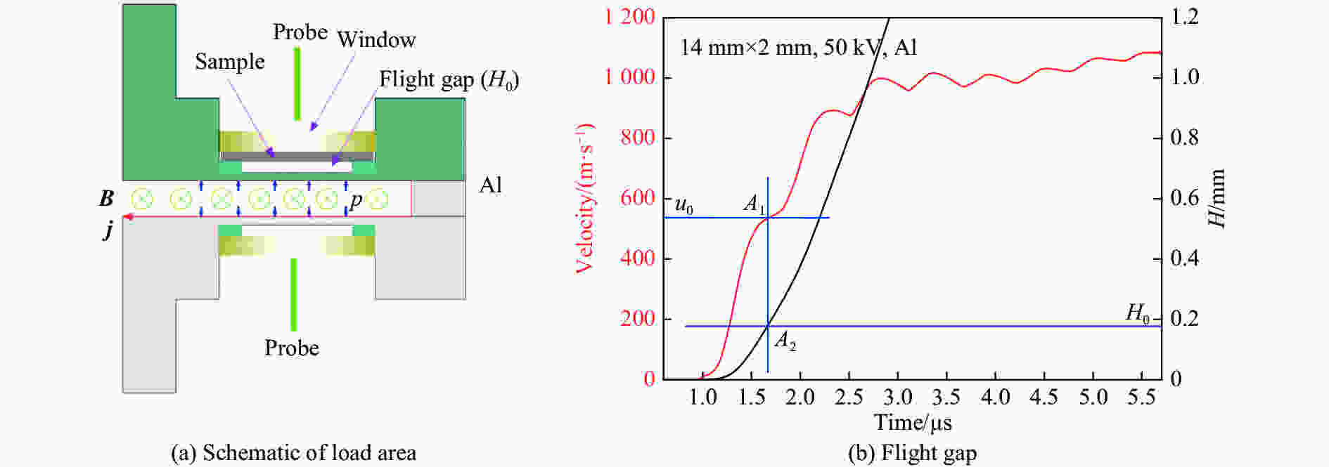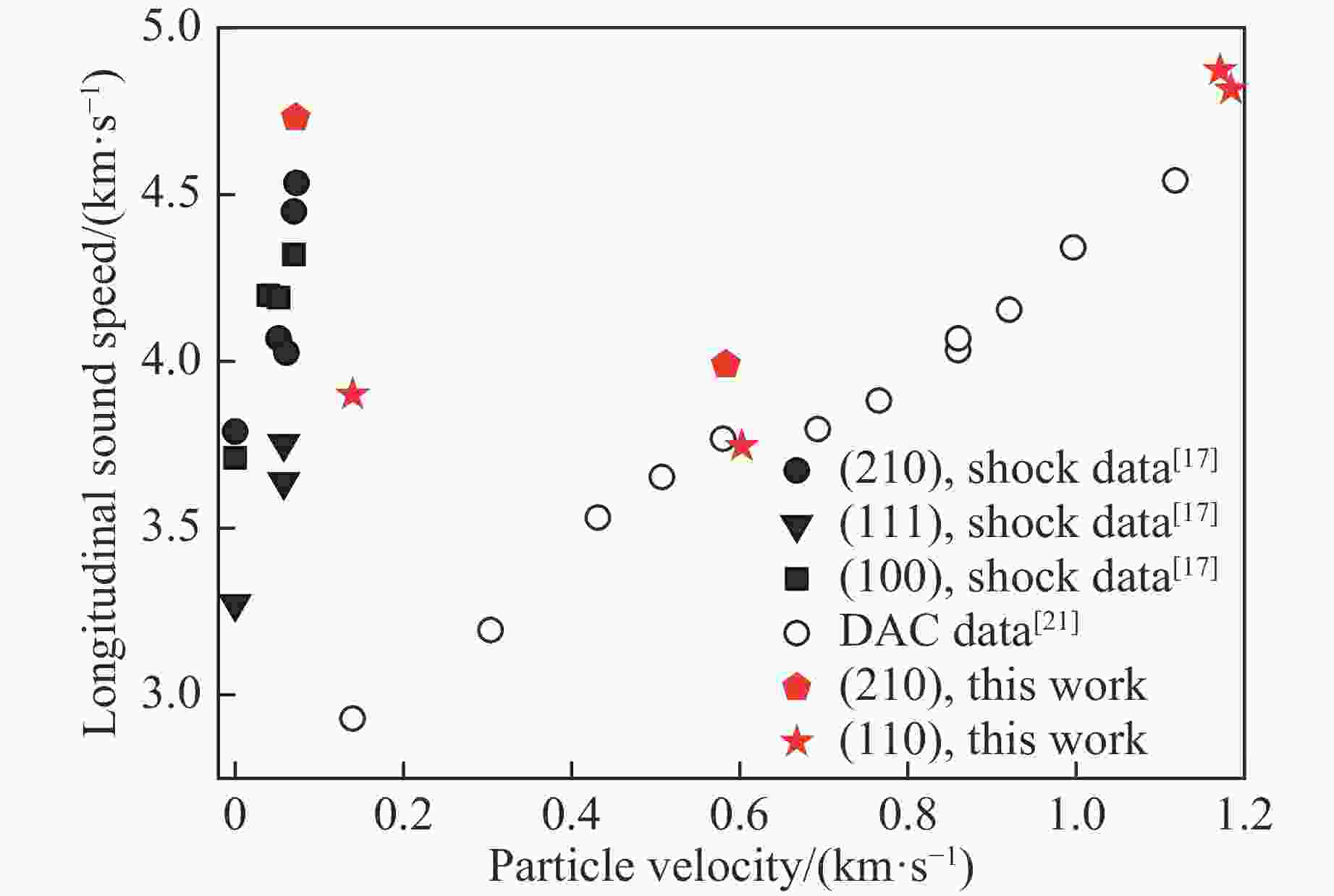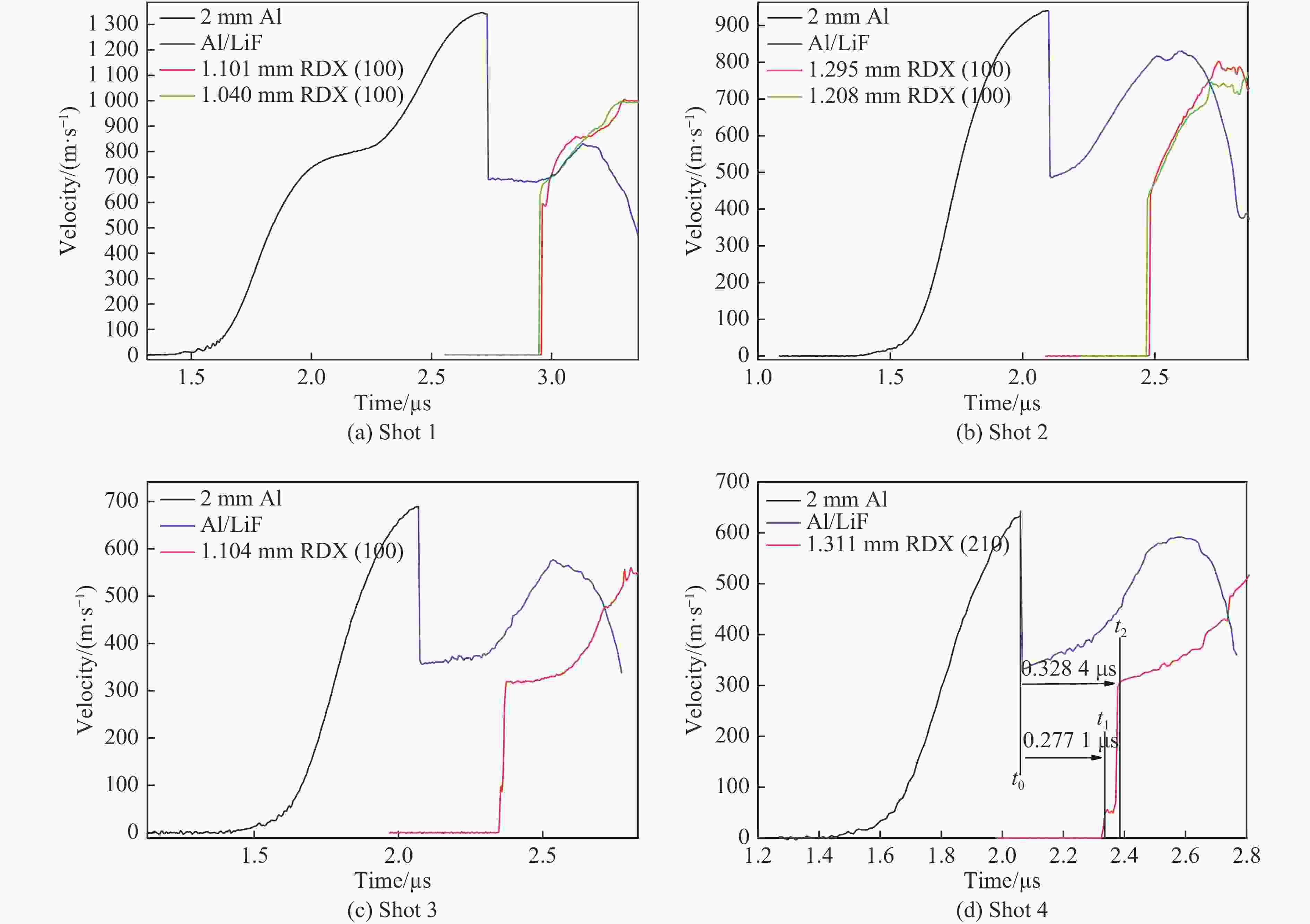 摘要: 基于磁驱动加载装置CQ-4,完成了冲击-斜波复杂加载实验设计,开展了RDX单晶(210)、(100)两个晶向在不同加载压力下的冲击-斜波压缩实验,获得了RDX单晶样品与LiF窗口界面的速度历史曲线和纵波声速。实验结果显示:速度波剖面可分为冲击压缩、斜波压缩和卸载3部分;当冲击压力较高时,冲击压缩段中不再出现弹塑性转变以及4 GPa附近相变的速度特征波形;当冲击压力较低时,在冲击压缩段观测到了弹-黏塑性波形。Abstract: The shock-ramp wave loading experiment is fulfilled using pulsed power generator CQ-4. For RDX single crystal samples with the orientations of (210) and (100), the interfacial velocity profiles between the RDX sample and LiF window are obtained by photonic Doppler velocimetry (PDV). The experimental results show that the interfacial velocity profile is divided into three parts: shock compression, ramp wave compression and unloading waves. At the shock pressure of 4 GPa, an elastic-viscoplastic waveform is observed. When the shock pressure is as high as 7 GPa, the characteristic waveform corresponding to the elastic-plastic transition disappears in the measured wave profile.