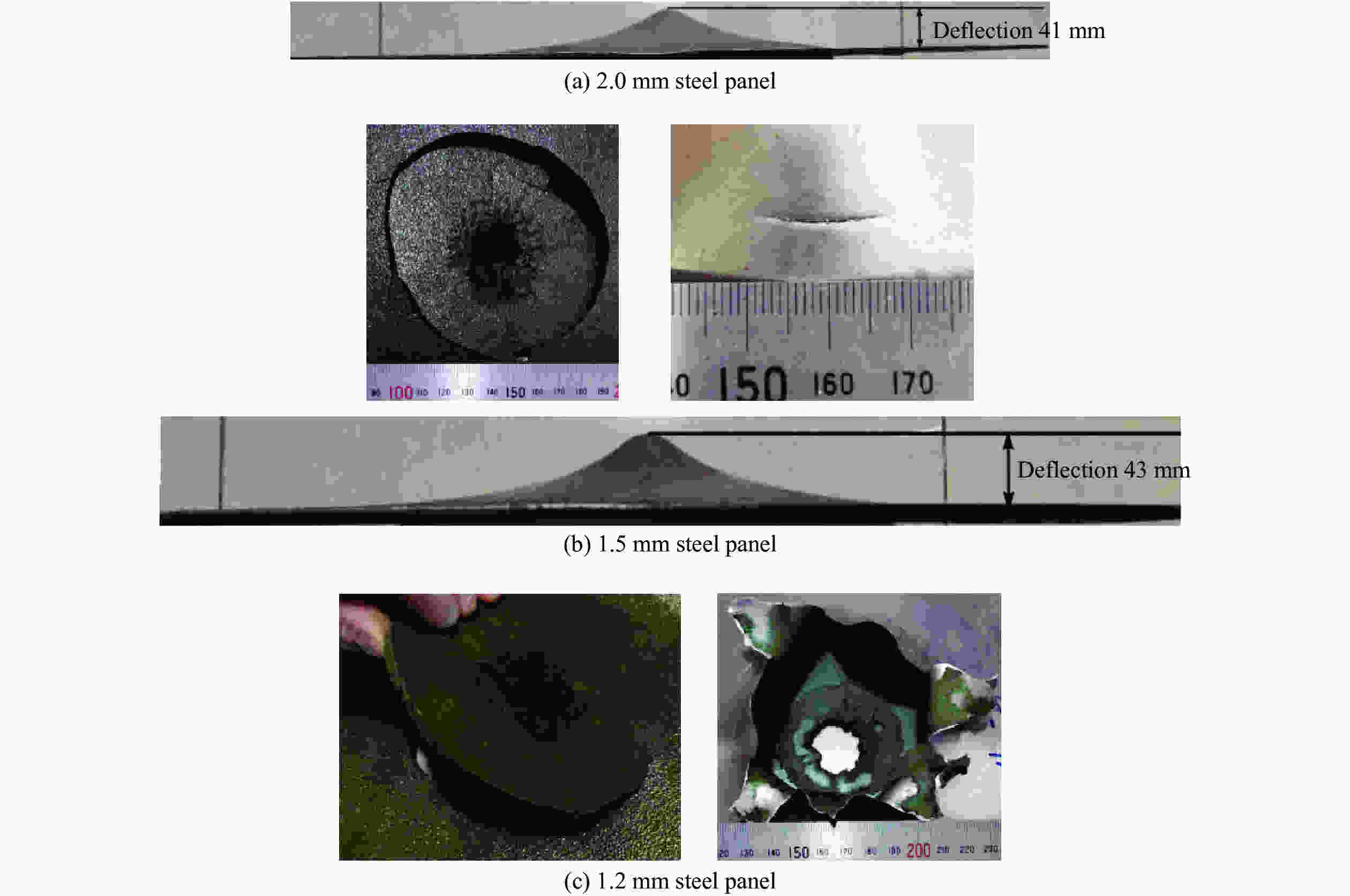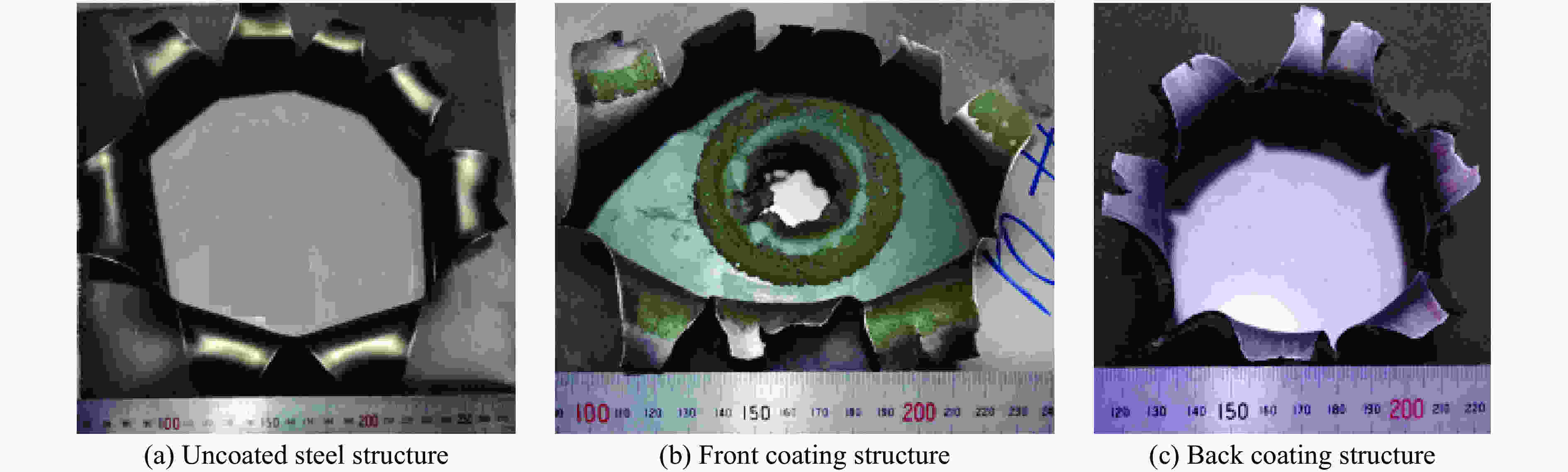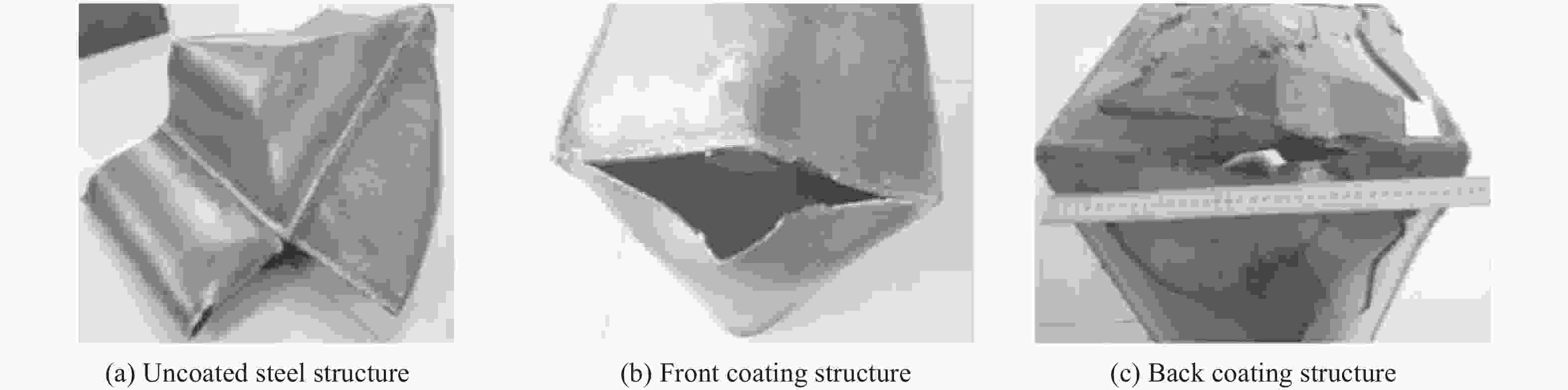 摘要: 为研究不同涂覆方式下聚脲涂覆钢复合结构的抗爆性能及聚脲涂层的吸能机理。针对等面密度、等钢板厚度的无涂覆、迎爆面涂覆和背爆面涂覆3种结构,分别开展抗40和60 g TNT爆炸加载试验。通过对比复合结构破坏模式,分析聚脲涂层对复合结构抗爆性能的影响以及聚脲涂层防护机理。研究表明:等面密度条件下,迎爆面涂覆聚脲涂层不能提高复合结构的抗爆性能;等钢板厚度条件下,聚脲涂层可以提高复合结构的抗爆性能,且背爆面涂覆效果最佳;聚脲涂覆钢板复合结构的抗爆性能与聚脲涂层的本构弥散、界面弥散以及热软化效应等相关。Abstract: In order to investigate the antiknock performance of polyurea coated steel composite structures and the energy absorption mechanism of polyurea coatings, the 40 and 60 g TNT explosion loading tests were carried out for the uncoated, equal-face coating and back-explosion coating structures with equal surface density and other steel plate thicknesses. Then the polyurea coatings’ effects on the antiknock performance of composite structures and their protective mechanism were analyzed in comparison of the failure modes of composite plates. It was found that the anti-explosion performance decreases with the thickening polyurea coating for the composite structure with uniform surface density, while improves under the same steel plate thickness conditions. In addition, coating on the rear surface proves to be the best. It was also shown that the antiknock performance of polyurea-coated steel composite structures is closely related to the characteristics of constitutive dispersion, interface dispersion and softening effect of the polyurea protective coating.
