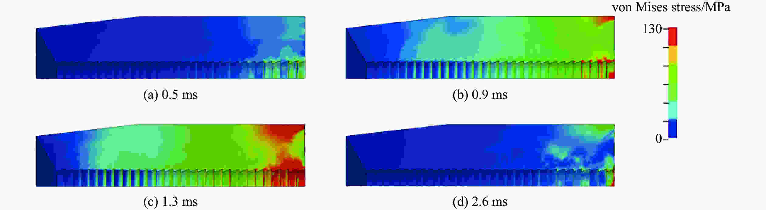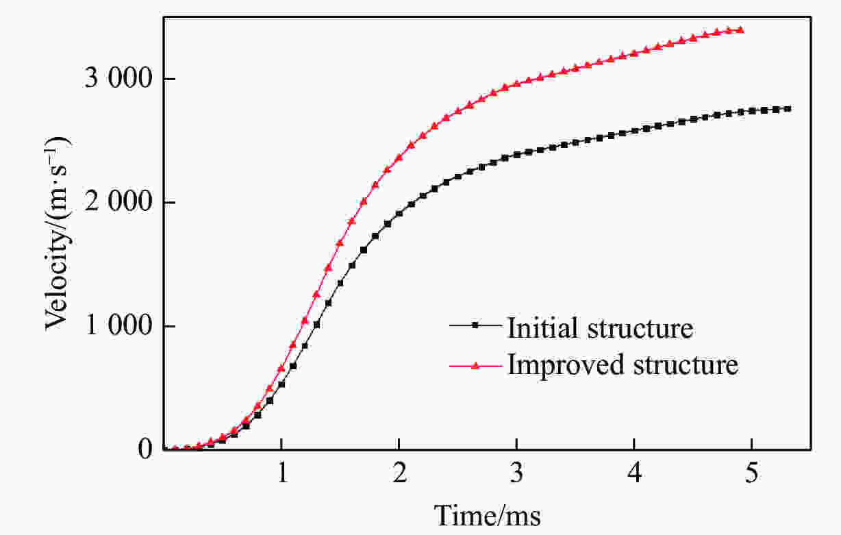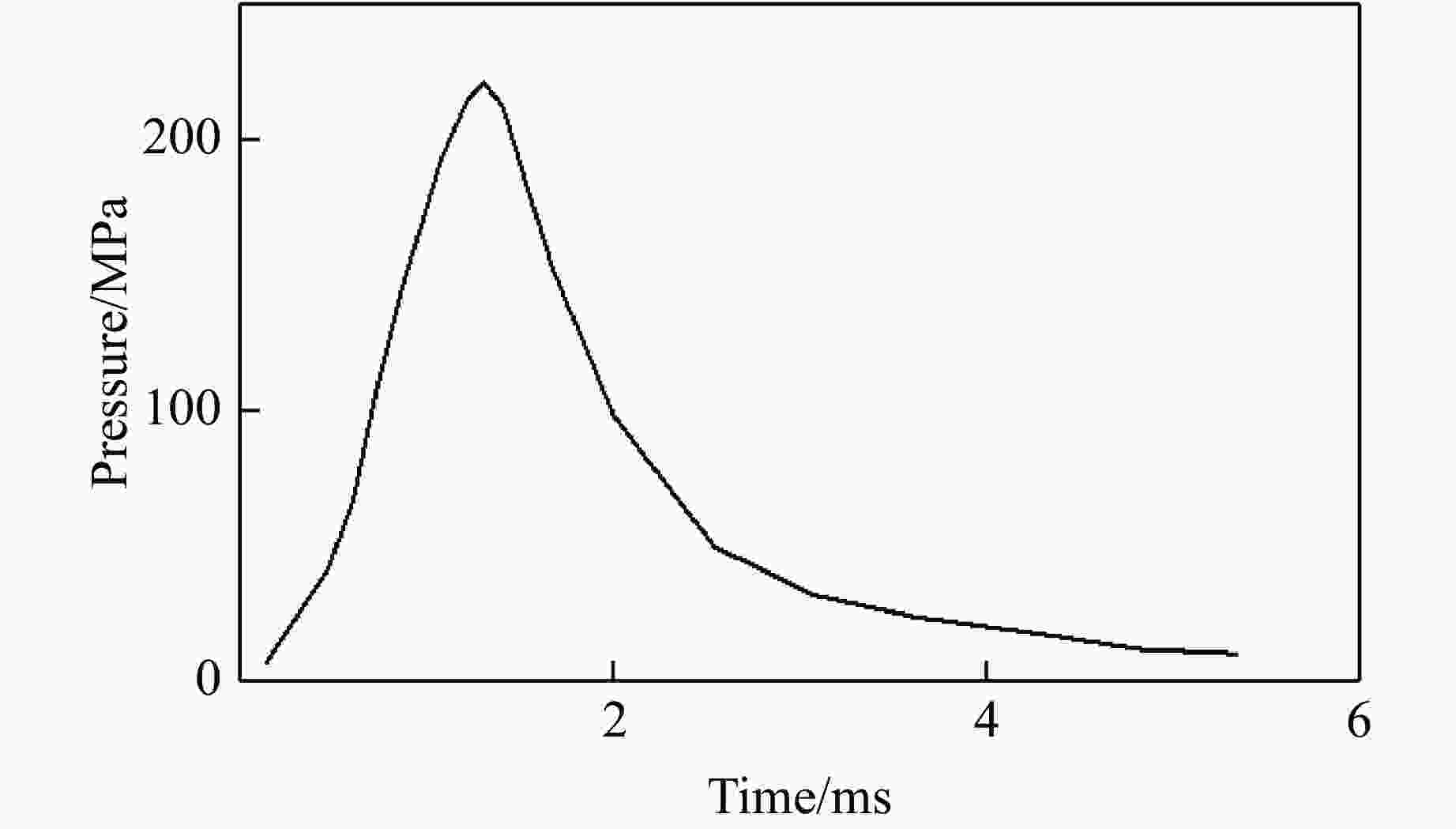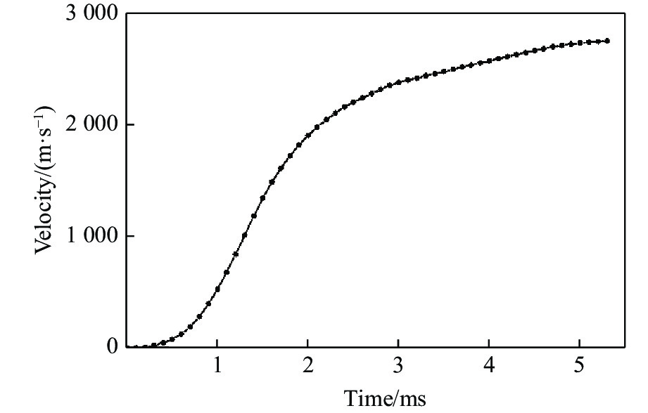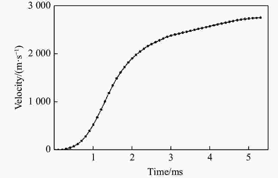 摘要: 建立了长杆弹的动力学计算模型,弹托采用新型玻璃纤维增强聚醚酰亚胺复合材料,利用LS-DYNA软件模拟了长杆弹在轻气炮膛压载荷下的运动过程,分析了复合材料弹托的动力学响应规律,并对弹托结构进行了改进。结果表明:最大膛压时弹托各处应力达到最大,高应力区分布在弹托尾部外围附近及后齿齿根上,齿根、齿顶应力大小不同;弹托头部强度裕度较大,通过改进弹托结构,在满足发射强度的同时,弹托质量减少了16 g,弹丸初速提高了612.2 m/s。Abstract: A dynamic calculation model for launching a long rod projectile was established in this paper, where the sabot used a new type of glass fiber reinforced polyetherimide composite material, and then the dynamic deformation of the sabot under the light gas gun pressure load was analyzed by the LS-DYNA software. The results show that the maximum stress inside the sabot occurs at the maximum bore pressure. The high stress area is distributed on the outer periphery and the root tooth of the sabot tail. The stresses at the tooth root and tooth tip are different with the overplus of material strength at the sabot head. By improving the structure of the sabot, the mass of the sabot is reduced by 16 g with the extra velocity gain of 612.2 m/s at given launching pressure.