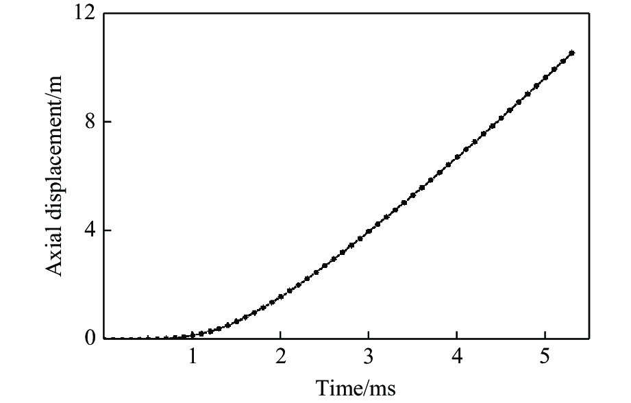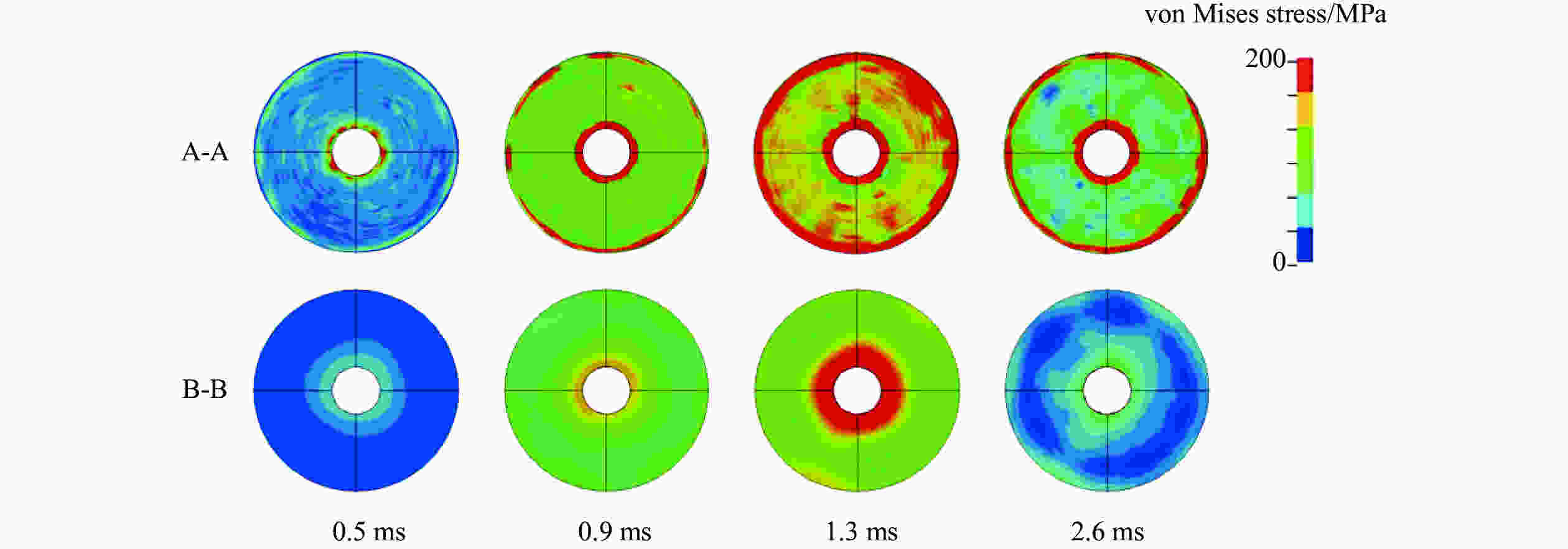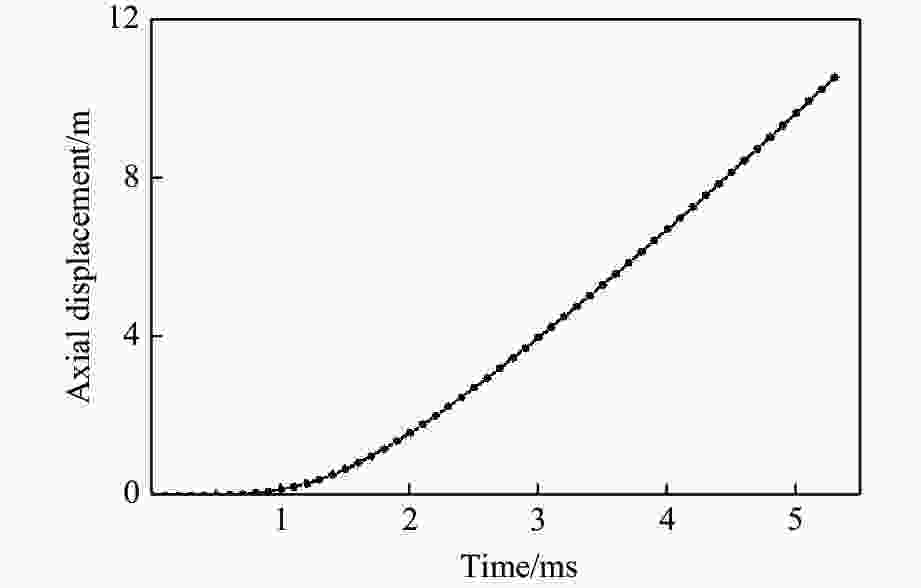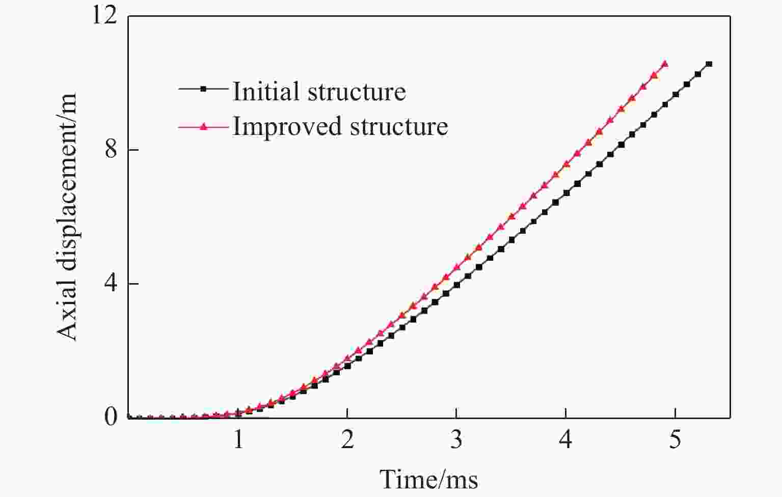 摘要: 建立了长杆弹的动力学计算模型,弹托采用新型玻璃纤维增强聚醚酰亚胺复合材料,利用LS-DYNA软件模拟了长杆弹在轻气炮膛压载荷下的运动过程,分析了复合材料弹托的动力学响应规律,并对弹托结构进行了改进。结果表明:最大膛压时弹托各处应力达到最大,高应力区分布在弹托尾部外围附近及后齿齿根上,齿根、齿顶应力大小不同;弹托头部强度裕度较大,通过改进弹托结构,在满足发射强度的同时,弹托质量减少了16 g,弹丸初速提高了612.2 m/s。Abstract: A dynamic calculation model for launching a long rod projectile was established in this paper, where the sabot used a new type of glass fiber reinforced polyetherimide composite material, and then the dynamic deformation of the sabot under the light gas gun pressure load was analyzed by the LS-DYNA software. The results show that the maximum stress inside the sabot occurs at the maximum bore pressure. The high stress area is distributed on the outer periphery and the root tooth of the sabot tail. The stresses at the tooth root and tooth tip are different with the overplus of material strength at the sabot head. By improving the structure of the sabot, the mass of the sabot is reduced by 16 g with the extra velocity gain of 612.2 m/s at given launching pressure.