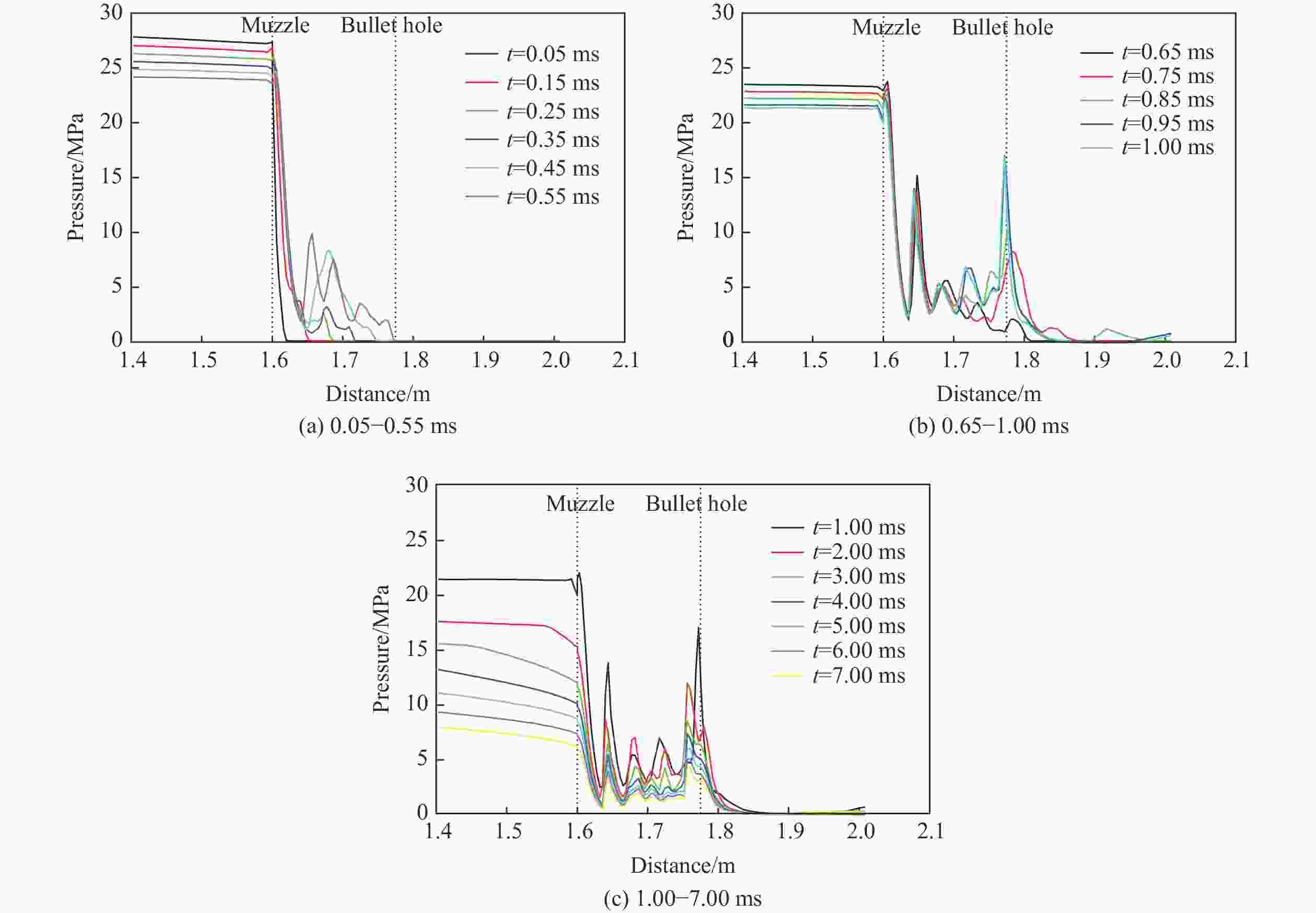Figure  6.  Pressure distributions along central axis of gun at different moments