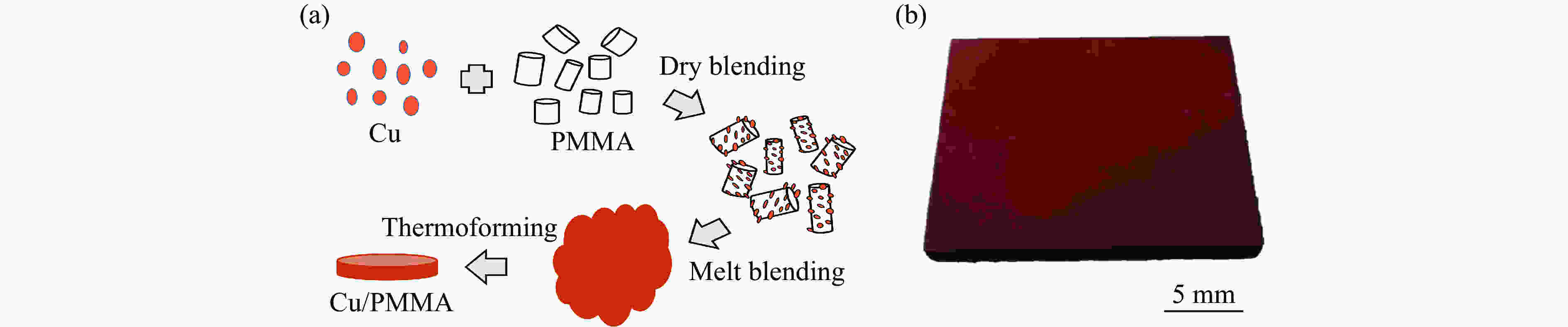 图  Cu/PMMA体系复合材料的制备流程(a)和40%Cu/PMMA实物(b)