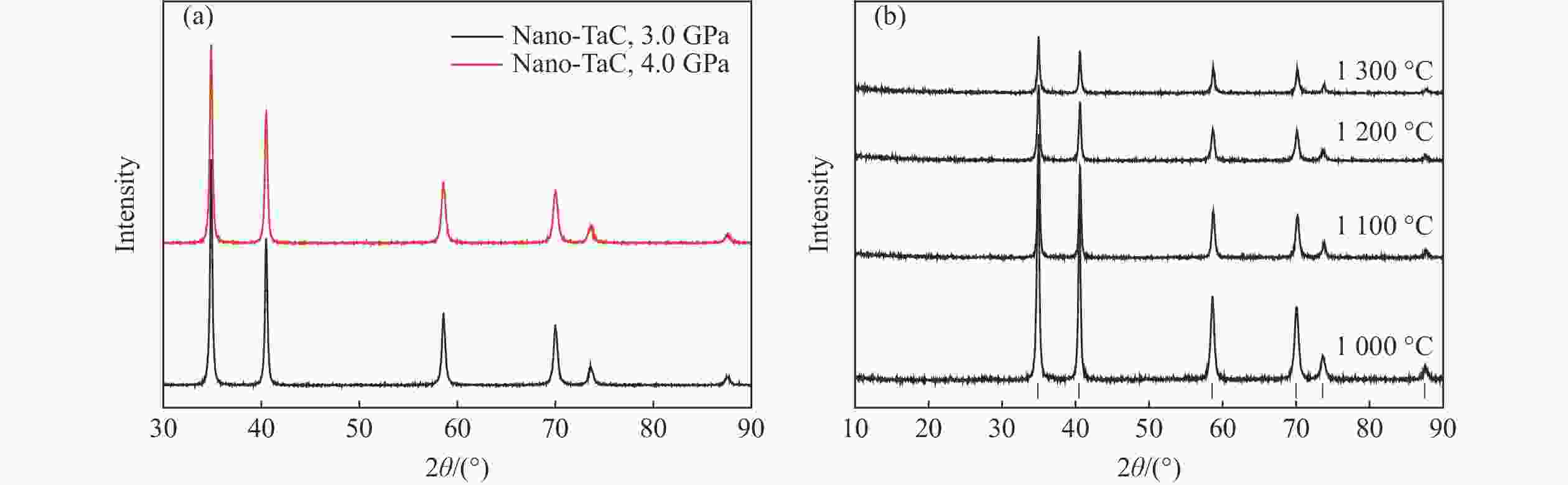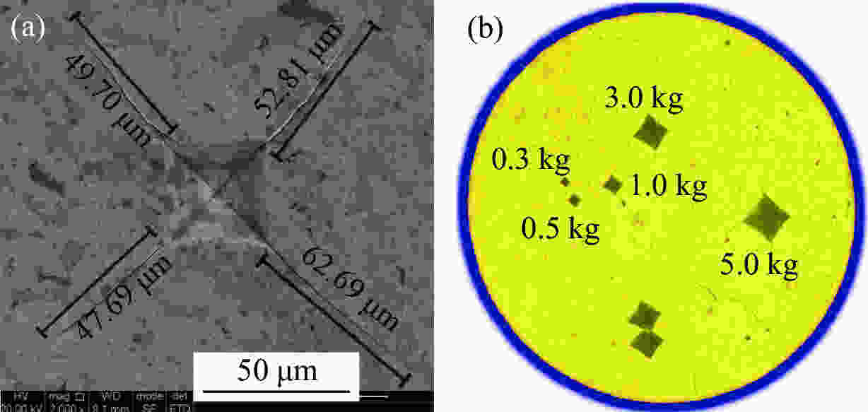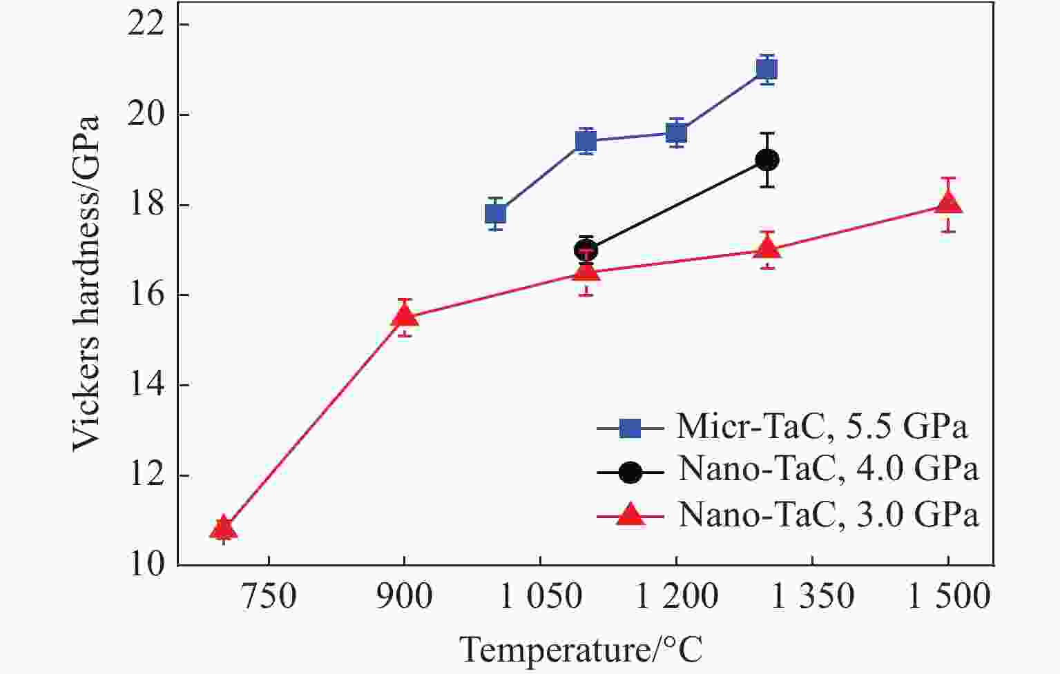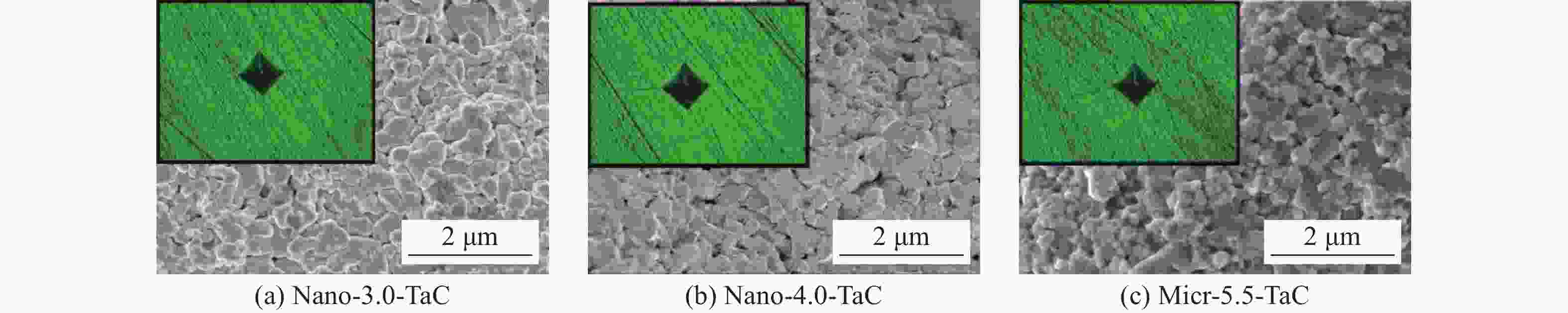 摘要: 为了探究烧结压力对不同晶粒尺寸碳化钽(TaC)力学性能的影响,通过高温高压技术对纳米、微米尺寸TaC粉末进行高温高压烧结,制备不同烧结条件下的块状TaC陶瓷。利用X射线衍射等表征方法对烧结样品的物相、元素分布、压痕形态进行表征,结果表明:TaC在烧结过程中物相稳定,且无杂质渗入。利用维氏硬度计对不同烧结压力(3.0、4.0和5.5 GPa)条件下的3种陶瓷样品进行维氏硬度测试,并进行微观结构分析,结果表明:随着烧结压力由3.0 GPa提升到5.5 GPa,微米尺寸TaC的维氏硬度(21.0 GPa)优于3.0、4.0 GPa下的纳米尺寸TaC维氏硬度(17.5、19.2 GPa)。此外,研究发现,测试维氏硬度时,3.0 kg应用载荷对测试TaC维氏硬度更加精确。研究结果对结构陶瓷烧结和超高温陶瓷硬度研究具有指导意义。Abstract: To study the effects of the sintering pressure on the mechanical properties of TaC with various grain sizes, nano- and micro-sized TaC powders are sintered at high pressure and high temperature (HPHT) to acquire bulk TaC ceramics under different sintering conditions. Different characterization approaches, such as X-ray diffraction (XRD), are used to observe phase, elements distribution, and indentation state. The observations reveal that the TaC phase is stable during the sintering process and there is no impurity infiltration. Three ceramic samples at the various sintering pressures (3.0, 4.0, 5.5 GPa) are measured by the Vickers hardness tester and their microstructures are also analyzed. The results show that as the sintering pressure increases from 3.0 GPa to 5.5 GPa, the Vickers hardness of Micro-5.5-TaC (21.0 GPa) is higher than that of Nano-3.0-TaC (17.5 GPa) and Nano-4.0-TaC (19.2 GPa). In addition, it is found that 3.0 kg is the most accurate load for measuring the Vickers hardness. This study has a guiding significance for sintering structural ceramics and exploring the Vickers hardness of ultra-high temperature ceramics (UHTCs).