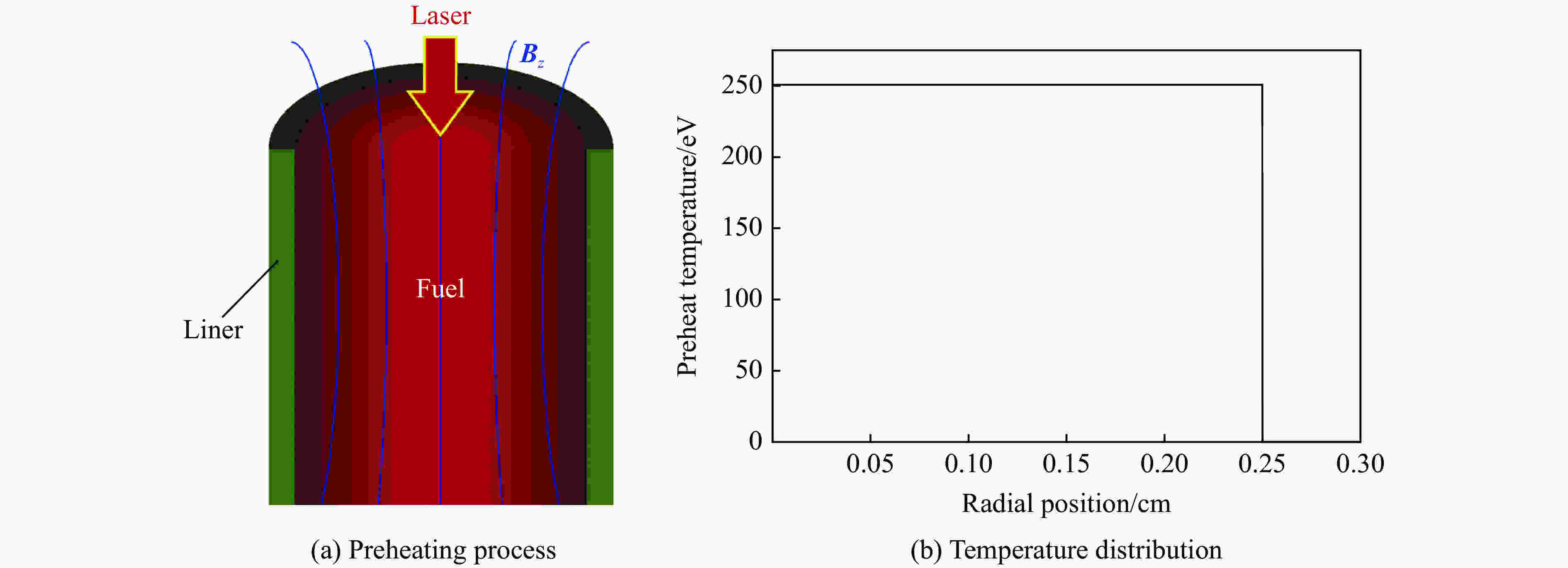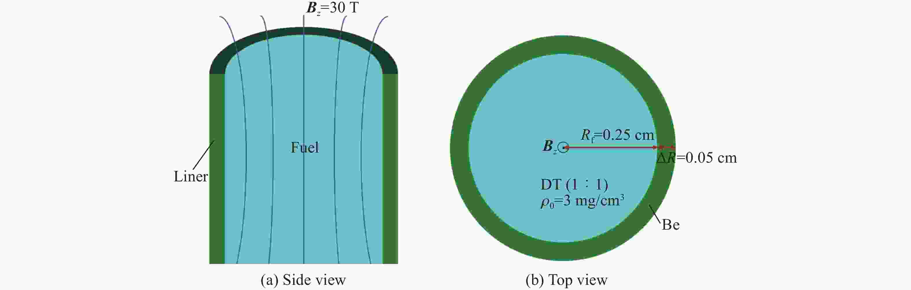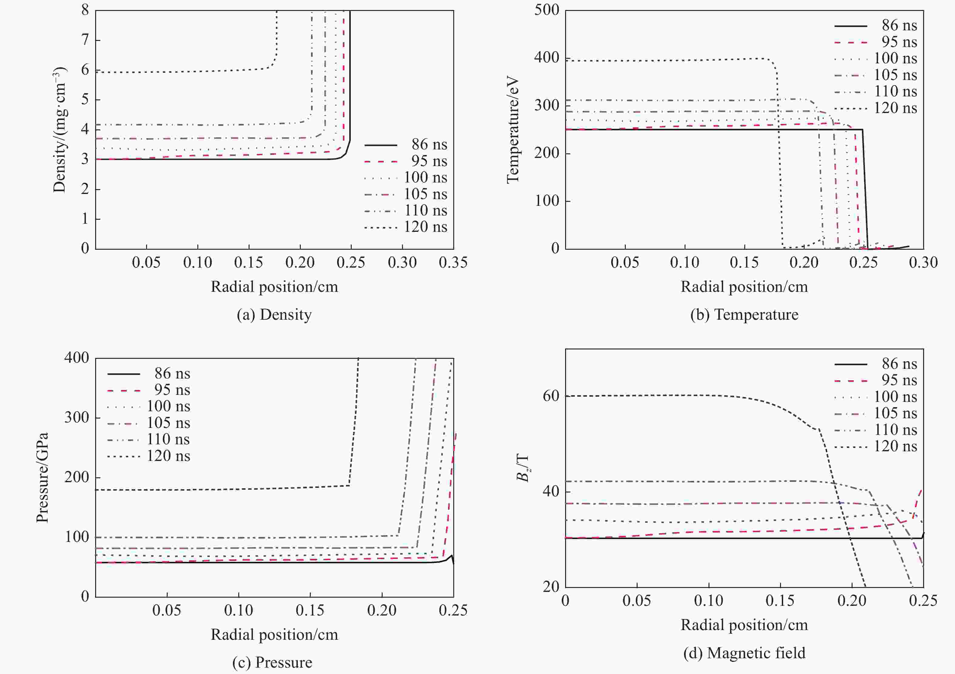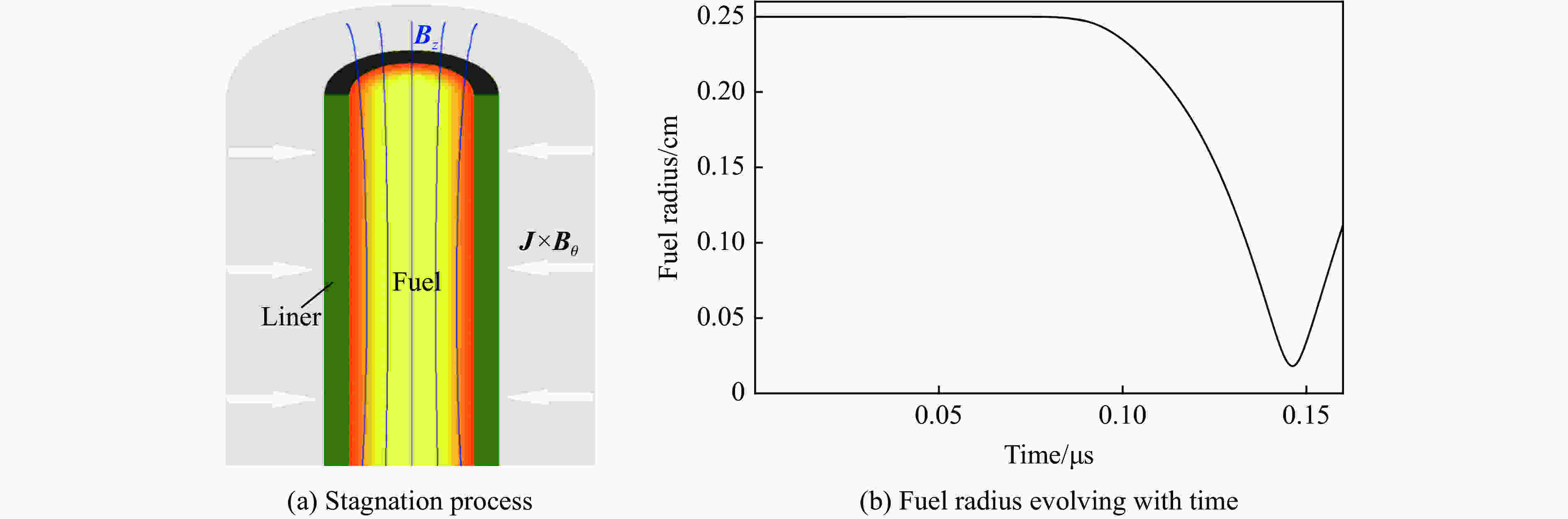 Configuration Driving pressure/TPa Implosion velocity/(km·s−1) Compression ratio Volume ratio Traditional ICF(spherical) 14−16 350−380 35−45 43 000−91 000 MagLIF(cylindrical) About 160 79 14.7 210 Fuel$\;\rho $R/(g·cm−2) Hall parameter BR/(T·cm−1) Burning time/ns Ion temperature > 0.3 0.15−0.20 > 4 About 0.009 400 > 45 3.0 > 7 -