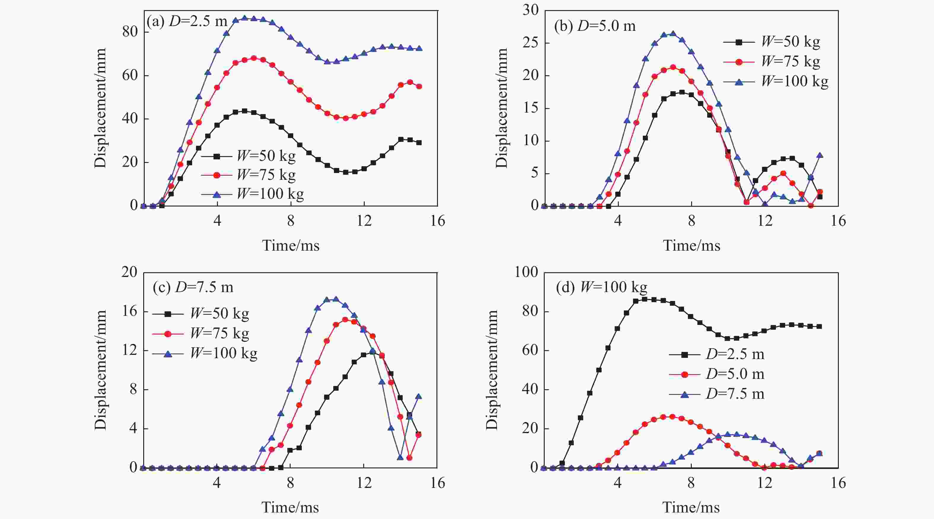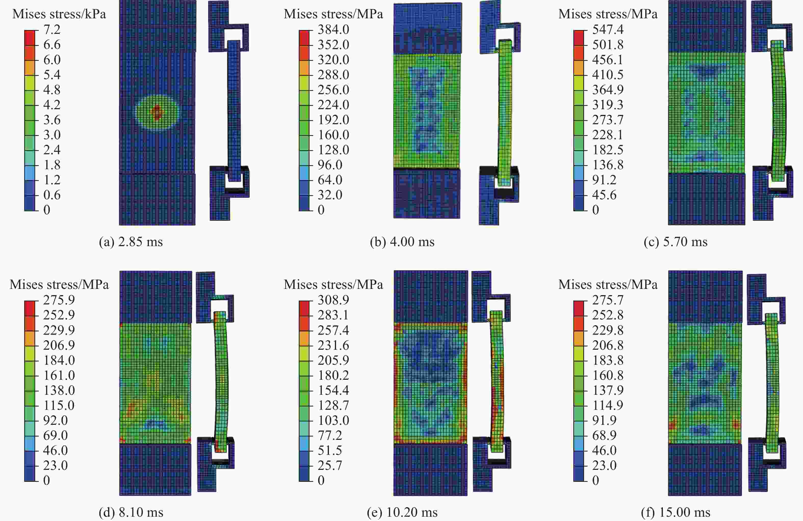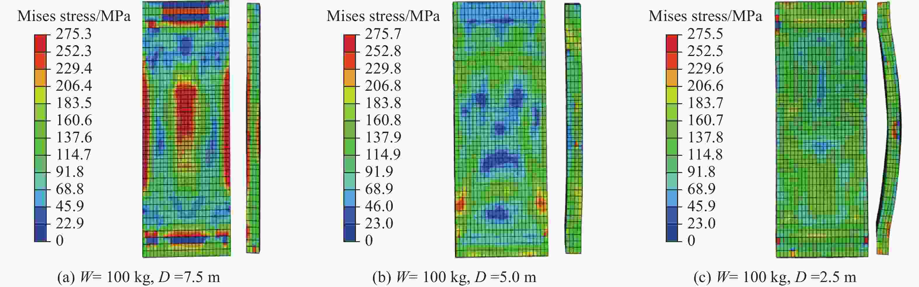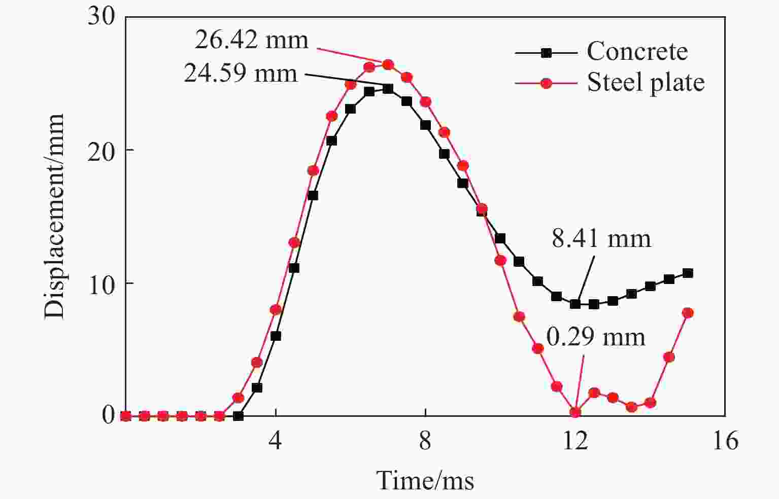 Material $\;\rho $/(kg·m−3) E/GPa $\sigma{{\rm{_y} } }$/MPa $\sigma{{\rm{_t} } }$/MPa $\;\mu$ Steel 7 850 206.0 275–300 0.25 Concrete 2 300 19.5 3.5 0.19 表 2 计算工况