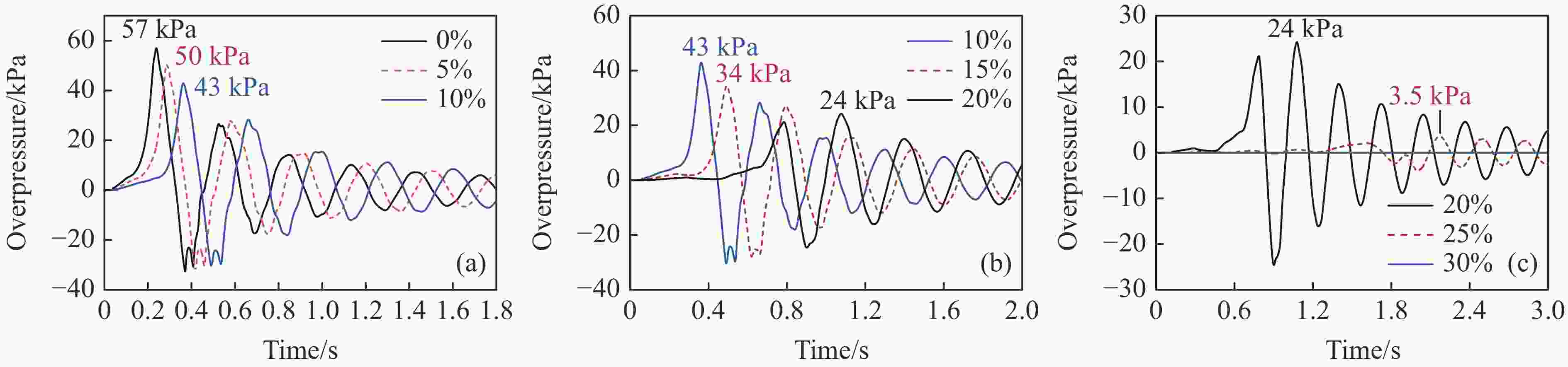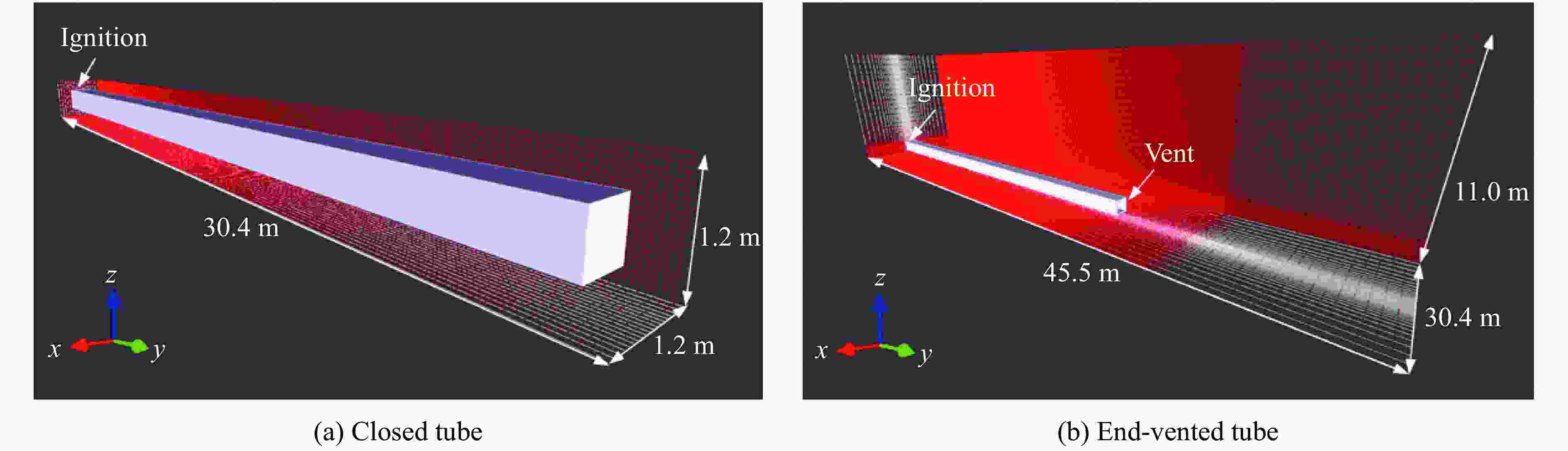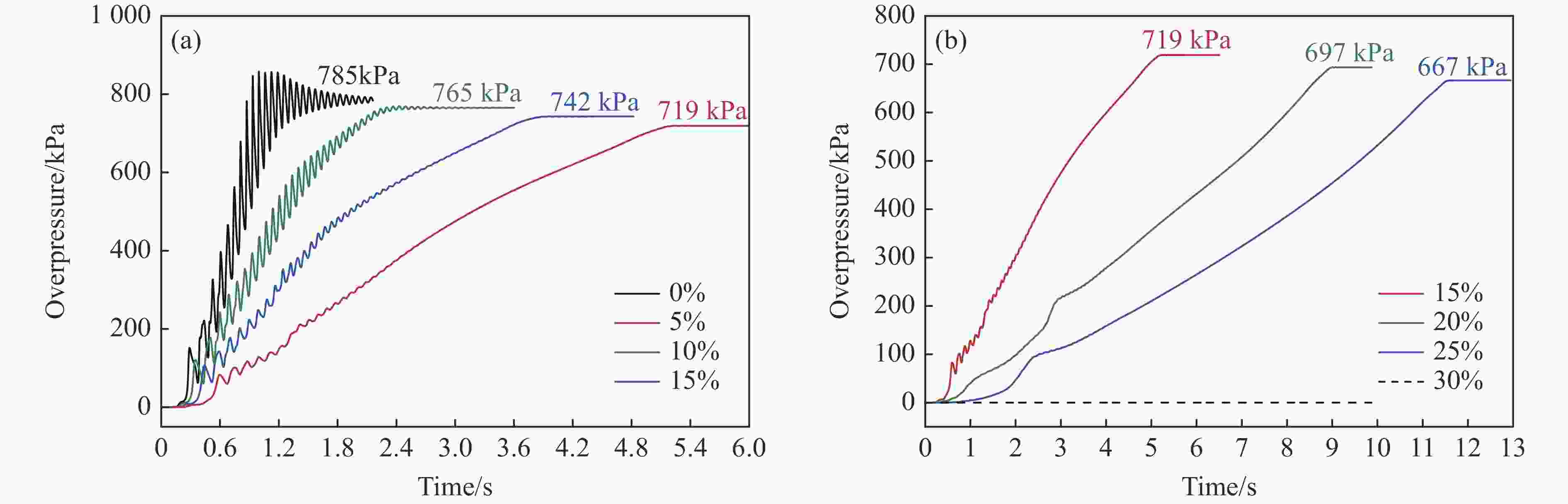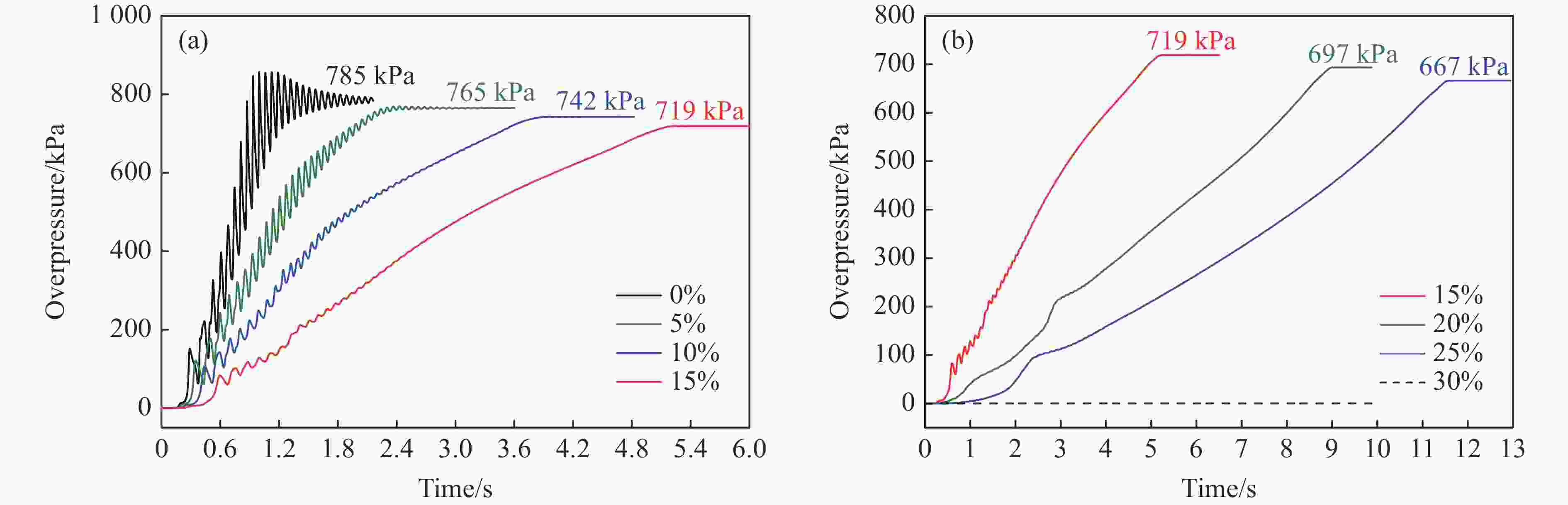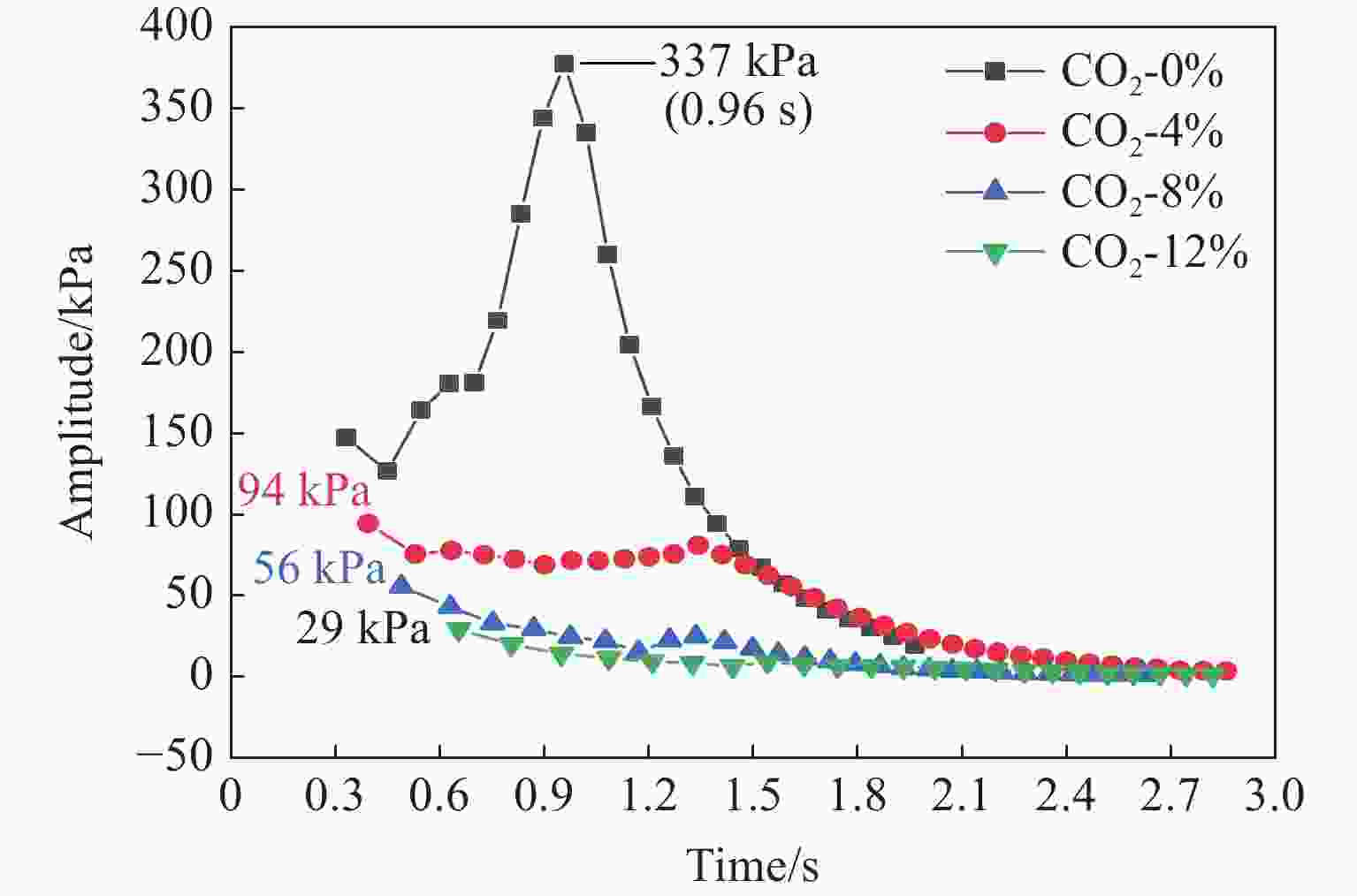 摘要: 长直空间燃气爆炸超压及其振荡将对人员和结构安全产生不利影响。为减轻燃气爆炸危害,基于CFD软件FLACS建立了长直管道空间燃气爆炸数值模型,并对模型进行了验证。利用已验证的数值模型,研究了添加不同体积分数CO2、N2和水蒸气的化学当量比CH4/空气混合气体的爆炸,讨论了惰性气体和水蒸气的体积分数对爆炸超压及其振荡的影响,并对比了3种气体的抑爆效果。结果表明:CO2、水蒸气和N2的体积分数每增加10%,密闭管道气体爆炸的最终超压将分别下降81、47、65 kPa,尾端泄爆管道分别下降24、25、20 kPa,3种气体的体积分数分别为25%、26%、30%时,爆炸被完全抑制;CO2、水蒸气和N2均能有效抑制爆炸超压的振荡,压力振幅和压力振荡频率均随添加气体体积分数的增加而减小;CO2对爆炸超压及其振荡的抑制效果最好,水蒸气次之,N2最弱,这与3种气体的物理特性及其抑爆机理的差异有关。Abstract: The overpressure and its oscillation of gas explosion in long straight space will endanger personnel and structures. In order to reduce the potential hazards, a numerical model of gas explosions in long straight tube was established based on the CFD software FLACS and was verified by using the existing experimental data. Based on the validated numerical models, the suppression of CO2, N2 and water vapor on the CH4/air mixture explosions with stoichiometric concentration was investigated. The influence of the volume fraction of inert gas and water vapor on the explosion overpressure and its oscillation was considered and discussed. It is shown that for every 10% increase in the volume fraction of CO2, water vapor and N2, the final overpressure of the gas explosion in the closed tube drops by 81, 47 and 65 kPa, the final overpressure in the end-vented tube decreases by 81, 47 and 65 kPa. When the volume fractions of CO2, water vapor and N2 are 25%, 26%, and 30%, respectively, the explosion is completely suppressed. CO2, water vapor and N2 can effectively suppress the oscillation of explosive overpressure, both the pressure amplitude and the pressure oscillation frequency decrease with the increase of the volume fraction of added gas. CO2 has the best suppression effect on explosion overpressure and its oscillation, followed by water vapor, and N2 is the weakest. This phenomenon is related to the differences in the physical properties of the three gases and the suppression mechanisms.