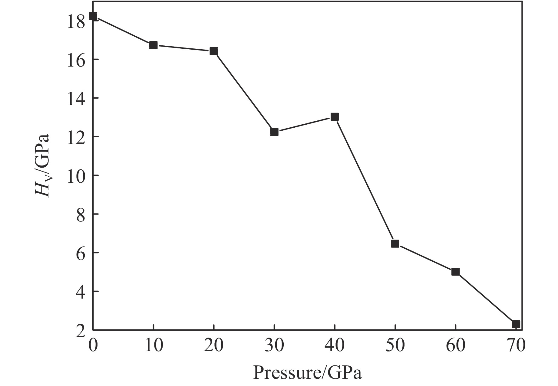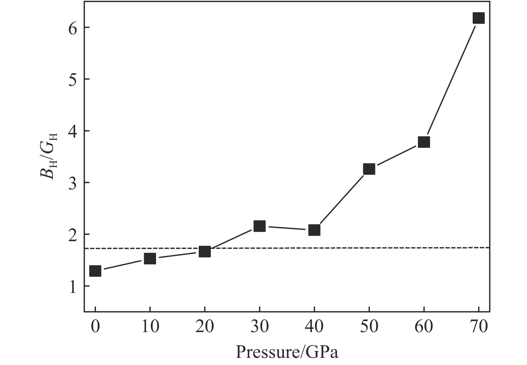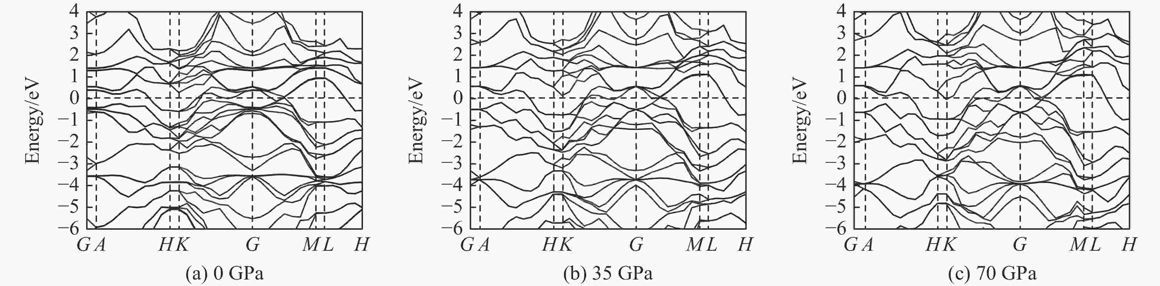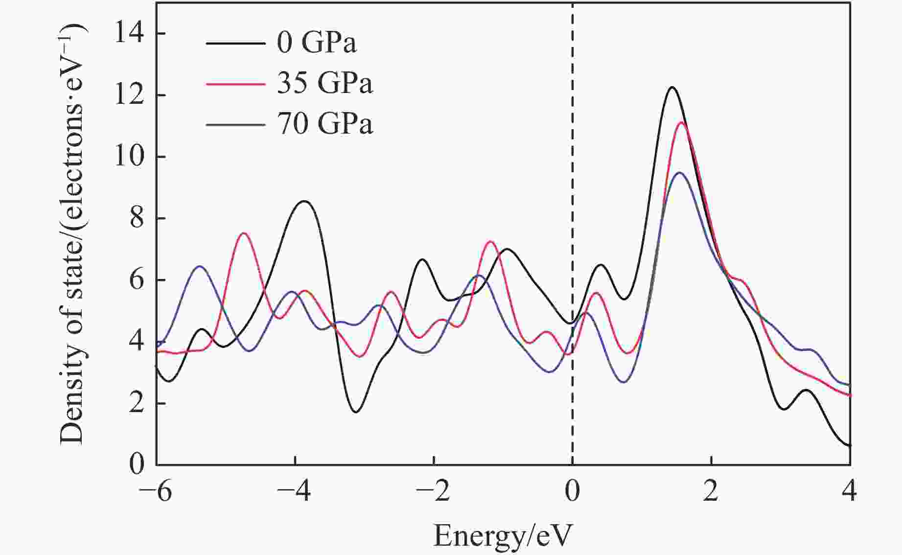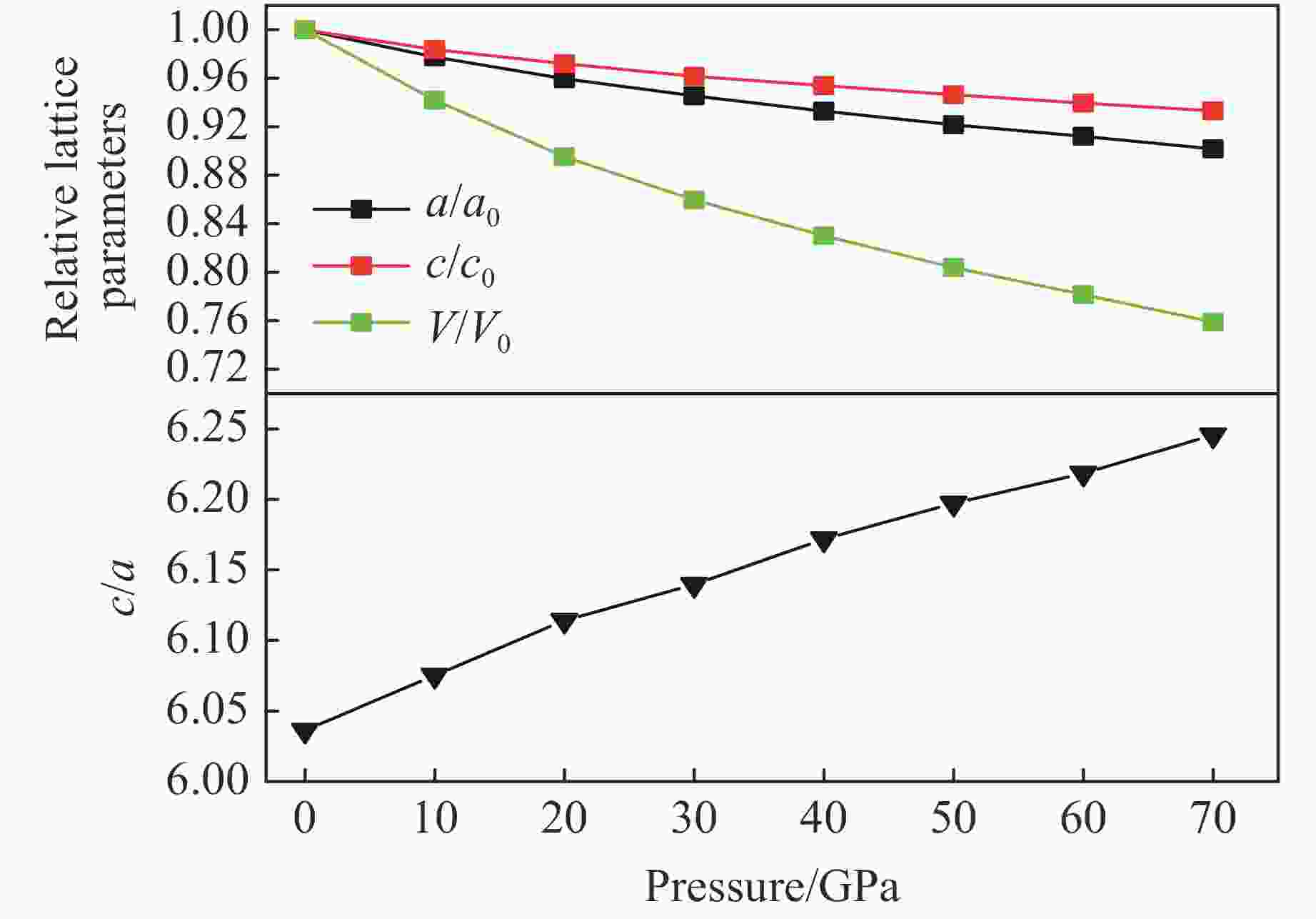 摘要: 基于密度泛函理论的第一性原理,研究了压强对双“A”层MAX相V2Ga2C晶体结构、弹性和电子性质的影响,并利用玻恩稳定准则预测了V2Ga2C力学稳定状态下的压强范围。计算结果表明:在0~70 GPa下,V2Ga2C的晶体结构处于力学稳定状态;随着压强的增大,V2Ga2C的晶格常数和体积均有不同程度的缩小,a轴随压强的增大收缩得最快,晶胞体积收缩了24%左右;随着压强的增加,V2Ga2C材料的维氏硬度从0 GPa压强下的18.23 GPa减小为70 GPa压强下的2.30 GPa,在20.15 GPa时从脆性材料转变为韧性材料;V2Ga2C的态密度和能带结构等电子性质随压强的变化较小,即压强对V2Ga2C的电子性质影响不大。Abstract: The structural, elastic and electronic properties of double “A” layer MAX phase V2Ga2C under high pressure were studied by the first-principles calculations of density functional theory, and the stable state of V2Ga2C was predicted by using the Born stability criteria. The results show that V2Ga2C crystal structure at the state of mechanical stability within the pressure range of 0–70 GPa. With the increase of pressure, the lattice parameters and volumes of V2Ga2C decreased. V2Ga2C is more compressible in the a-axis direction than c-axis direction, and the volume shrinks by about 24%. With increasing pressure, Vickers hardness of V2Ga2C material decreased from 18.23 GPa (0 GPa) to 2.30 GPa (70 GPa), and from brittle material transform into ductile material at 20.15 GPa. With the change of pressure, the electronic properties have changed slightly such as density of states and band structures, which have almost no effect on the electronic properties of V2Ga2C.