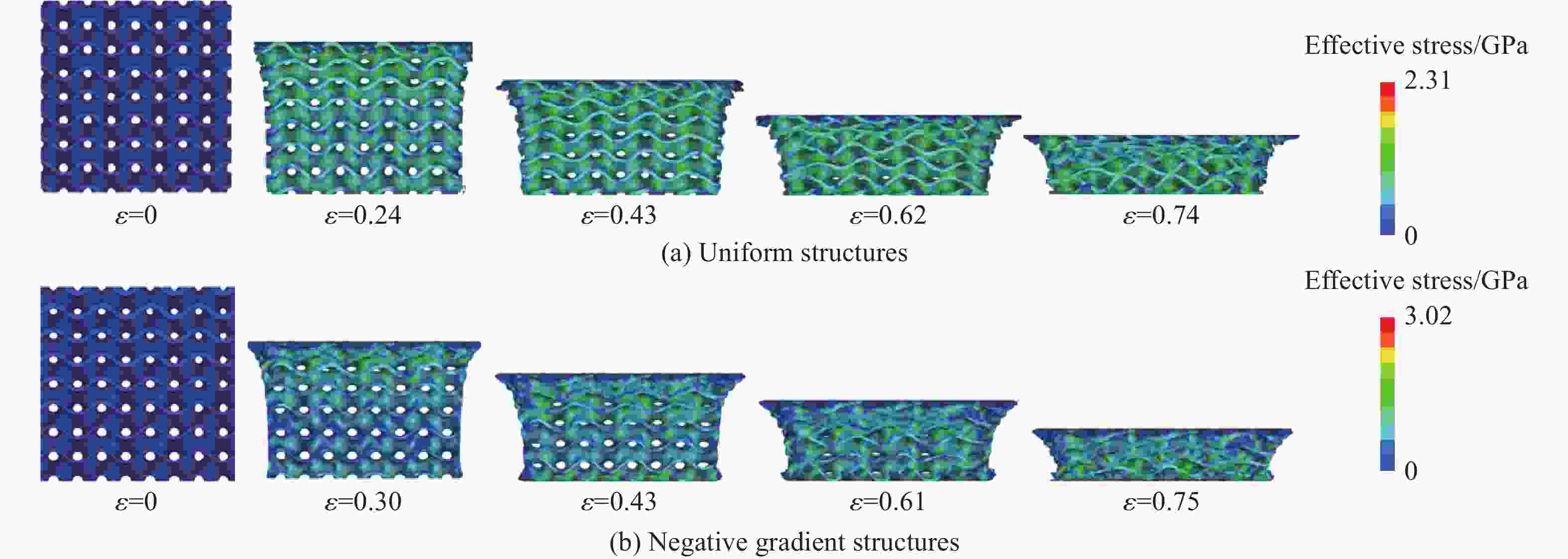 • 摘要: 利用ANSYS/LS-DYNA对均匀及梯度Gyroid结构进行准静态与动态压缩数值模拟,分析其应力分布、变形模式、承载能力以及吸能特性。对3D打印的316L不锈钢试样实施了单轴拉伸实验,获取了相应的材料参数,建立了Gyroid结构有限元模型,进而对其动态力学响应进行了数值仿真。结果表明:均匀结构呈现出较均匀的变形模式,梯度结构为低密度端向高密度端传播的逐层变形模式;两种结构均呈现明显的应变率敏感性,且负梯度结构的应变率敏感性最明显;在相同的加载速度下,负梯度结构的吸能效率最高,且具有最低的支撑端应力,是最佳的防护结构。研究结果可为冲击载荷下防护结构的设计选型提供参考。