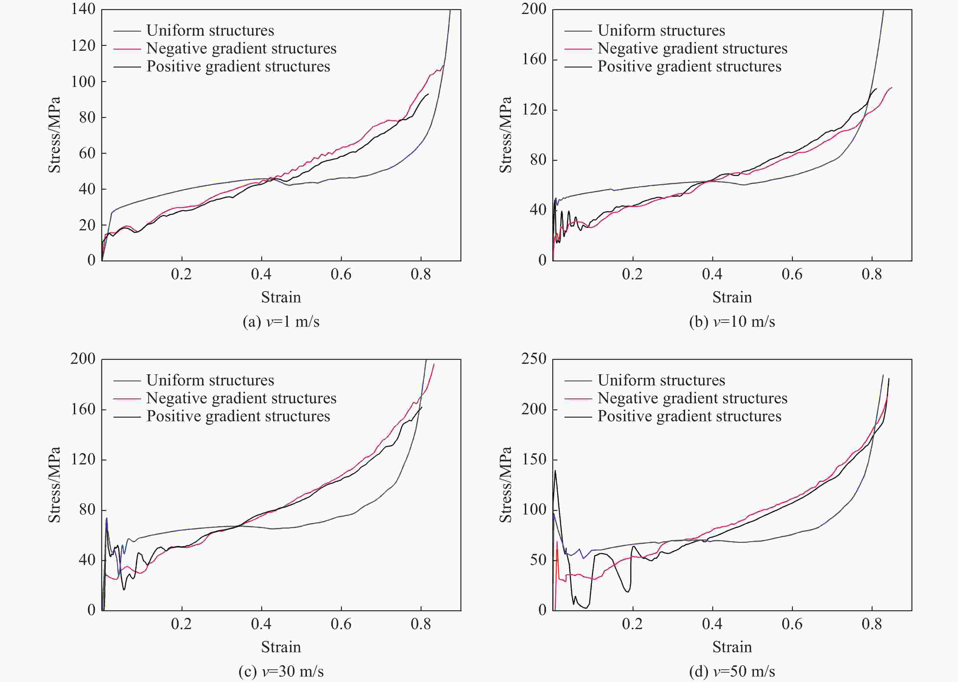 Table  1.   Impact end yield stress $ {\sigma }_{\mathrm{y}} $, plateau stress $ {\sigma }_{\mathrm{p}} $, and stress increased factors ${\sigma _{{\rm{DIF}}}}$ of different structures under different loading velocities