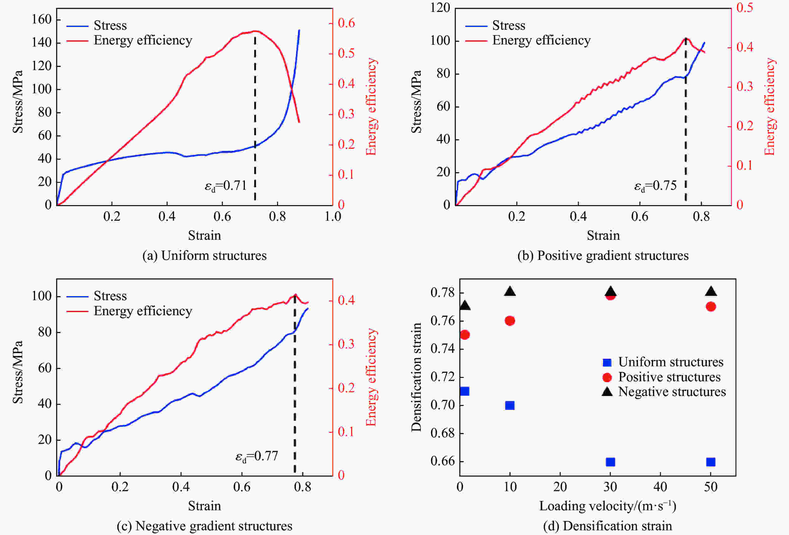 图  均匀结构(a)、正梯度结构(b)、负梯度结构(c)的准静态能量吸收效率曲线以及不同加载速度下各结构的密实应变(d)