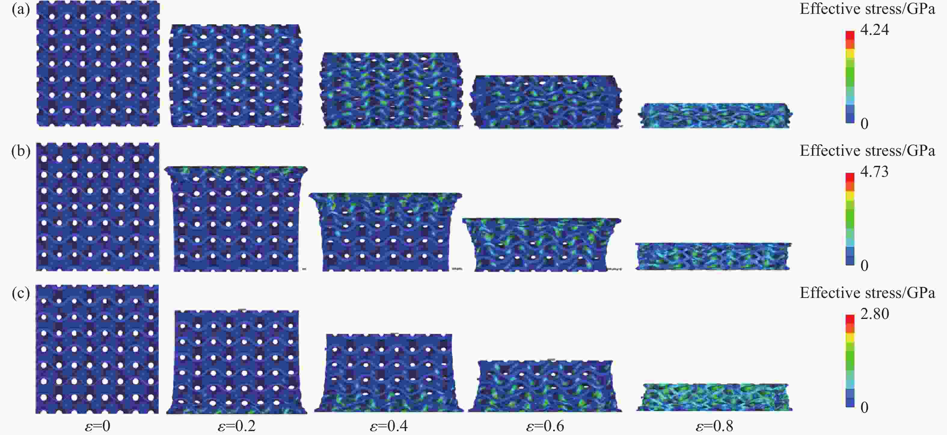 图  均匀和梯度Gyroid结构在30 m/s加载速度下的变形模式:(a)均匀结构,(b)正梯度结构,(c)负梯度结构