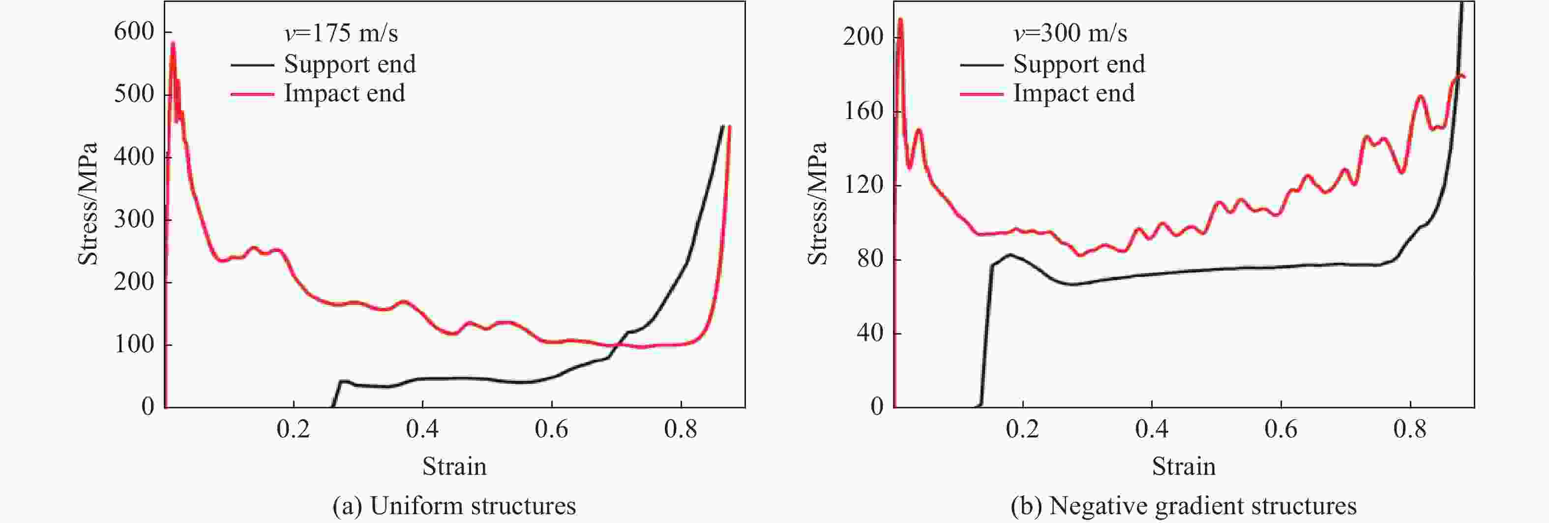 图  冲击波模式下均匀结构(a)和负梯度结构(b)的应力-应变曲线