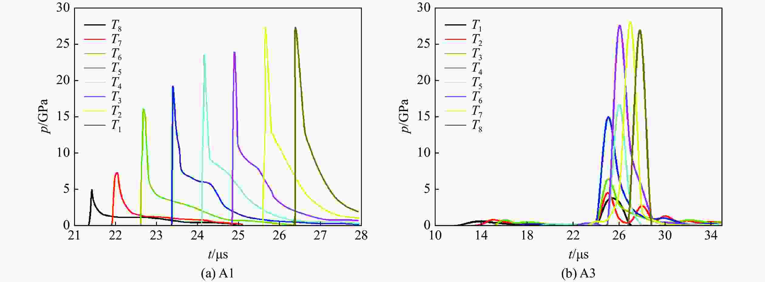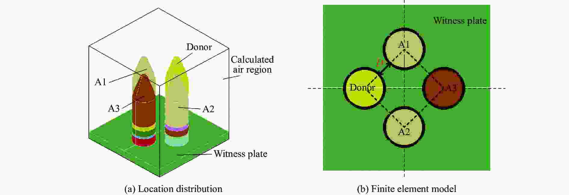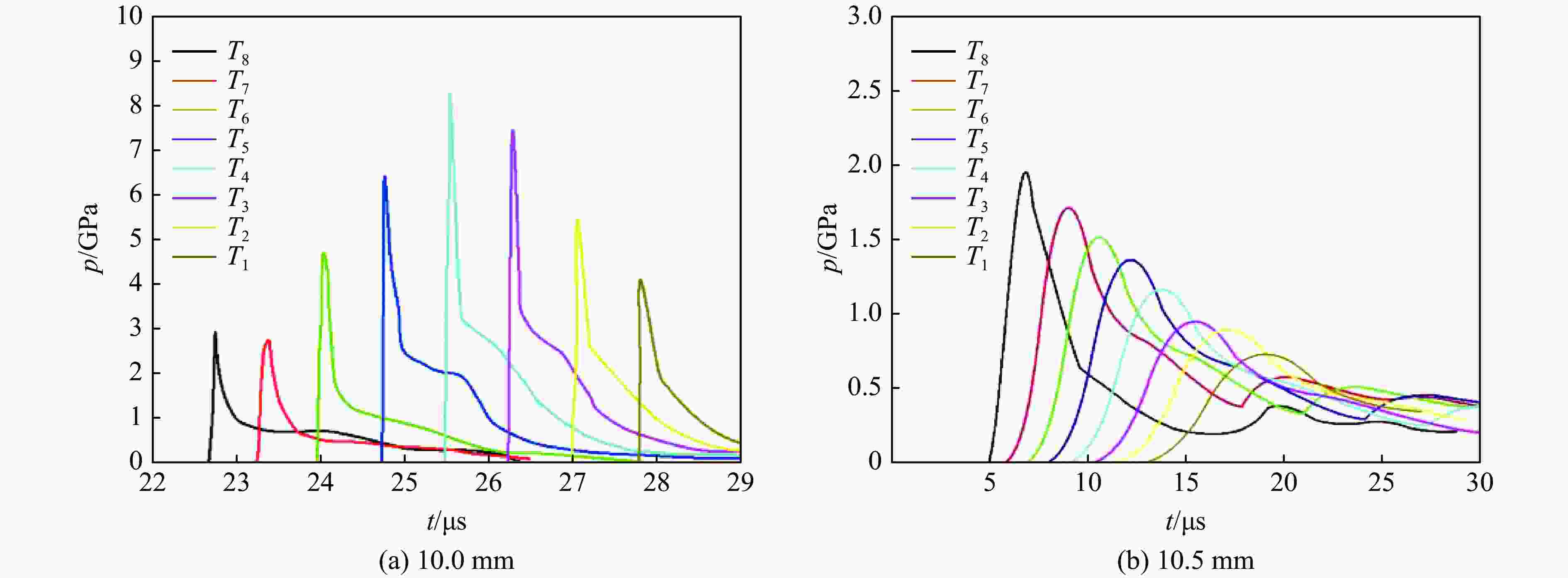 Material C/(km·s−1) S1 $\gamma $0 Copper 3.940 1.489 1.99 2024 aluminum 5.328 1.338 2.00 4340 steel 4.569 1.490 2.17 表 5 不同距离下殉爆数值模拟结果